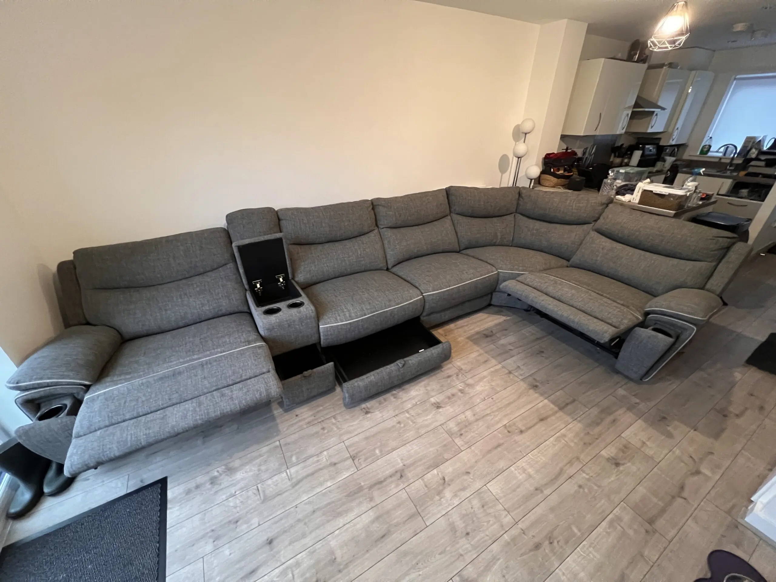 Corner sofa with two electronic recliners, several internal storage and cup holders. Reading light and usb charging ports (two). Less than two years old, excellent condition (no marks or damage). From a non smoking and non pet home.