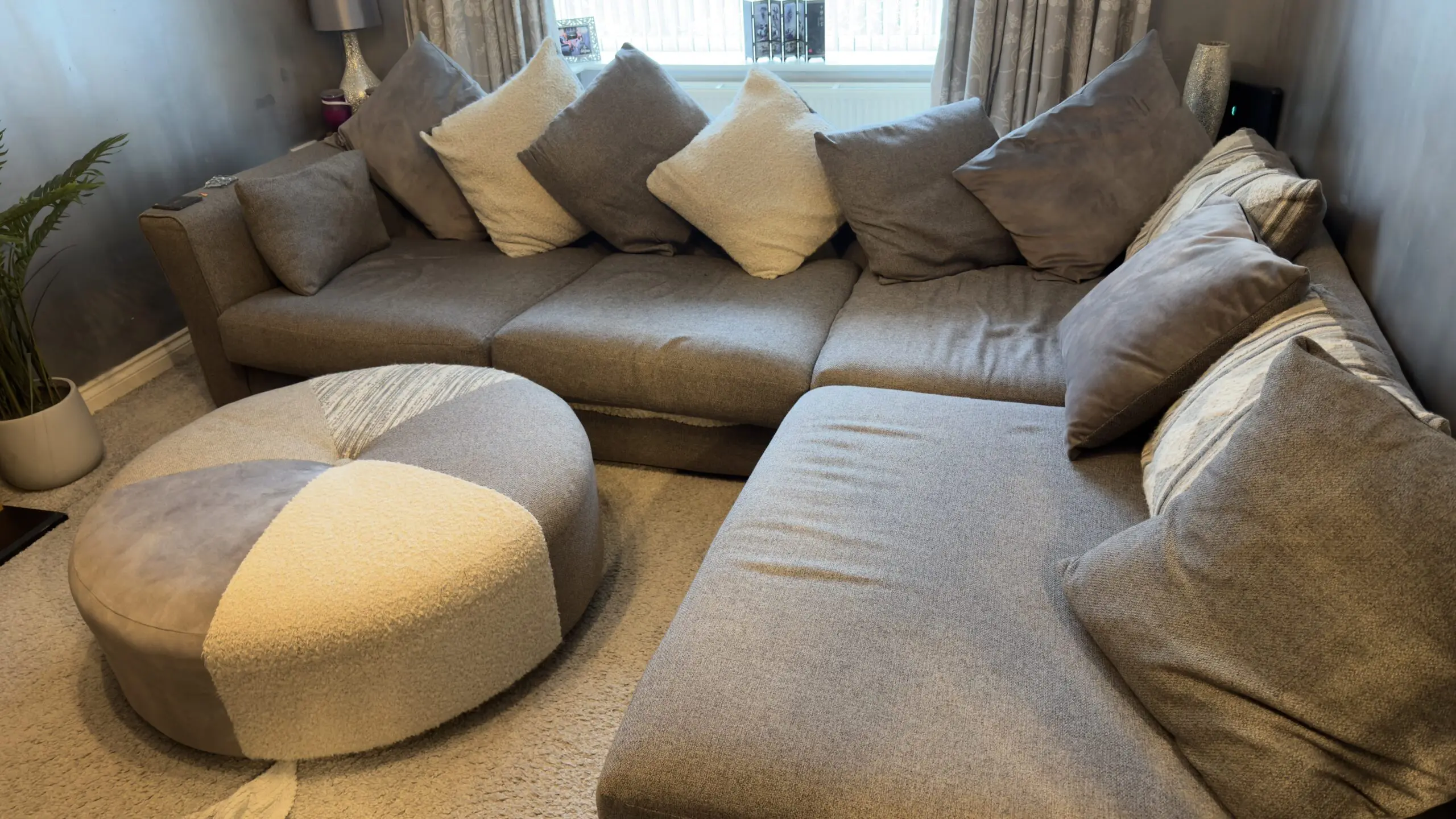 Grey corner sofa. 3 years old in excellent condition with no tears or marks. Chaise section is 230cm long. Footstool included. Available immediately.