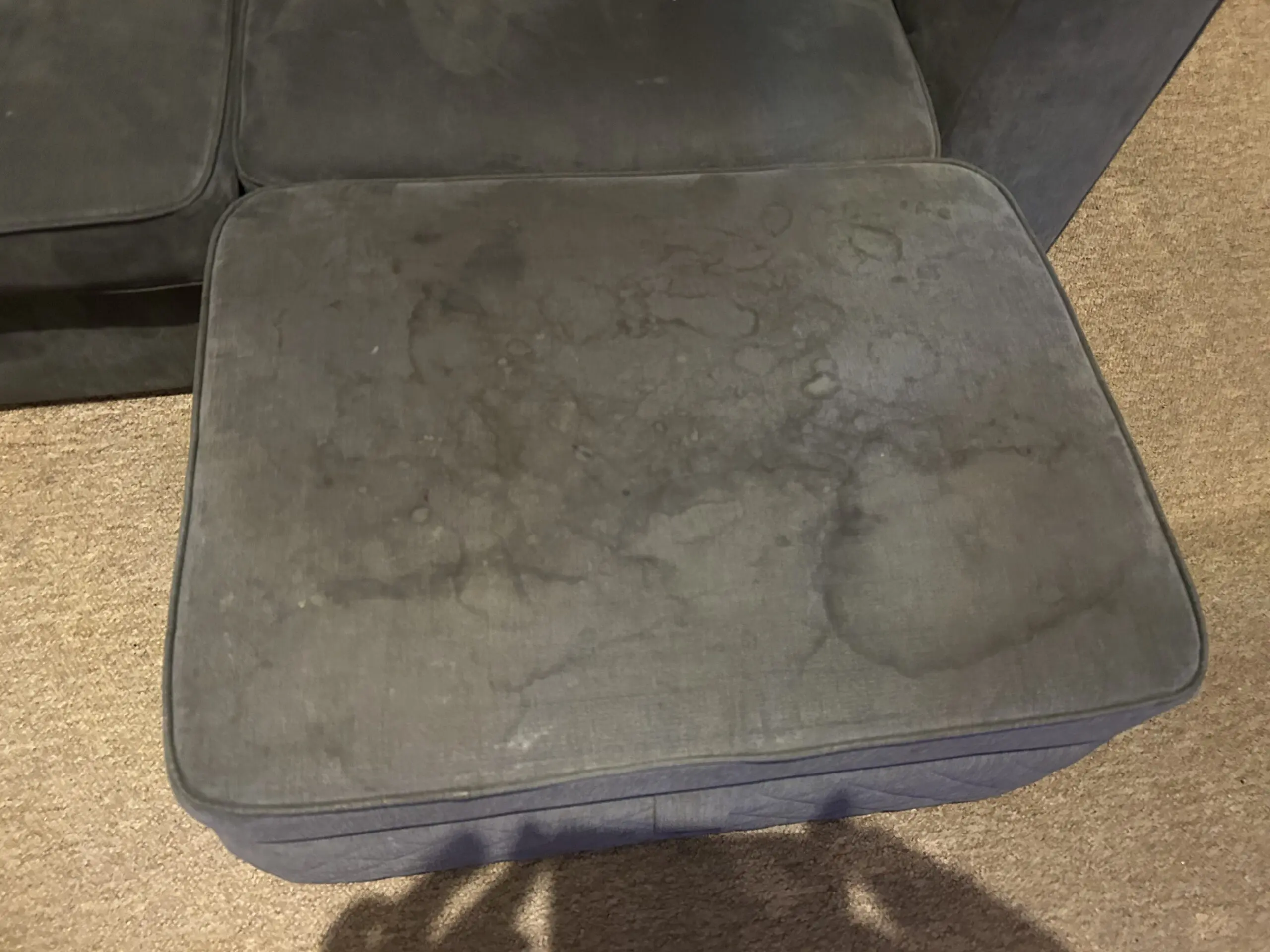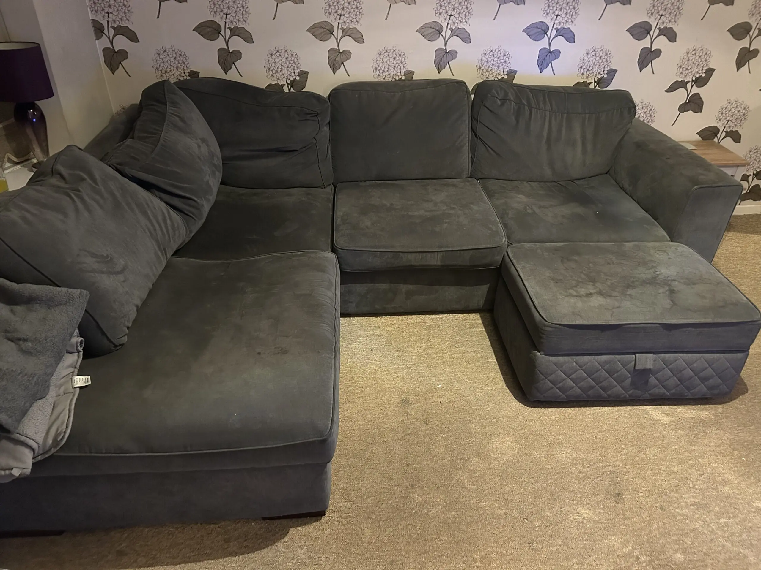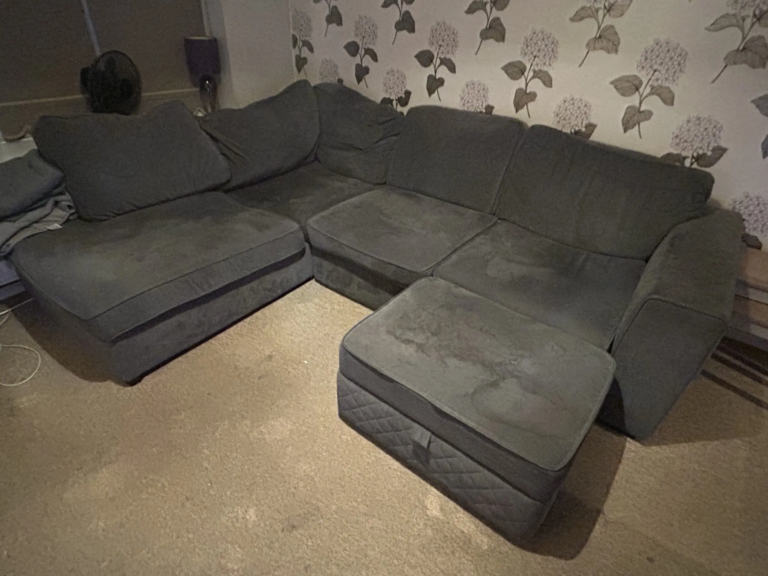 Corner Sofa that’s extremely comfortable. had it nearly 5 years. there is staining on the arm and on the stool which can be washed. some cushions have deformed over time.
