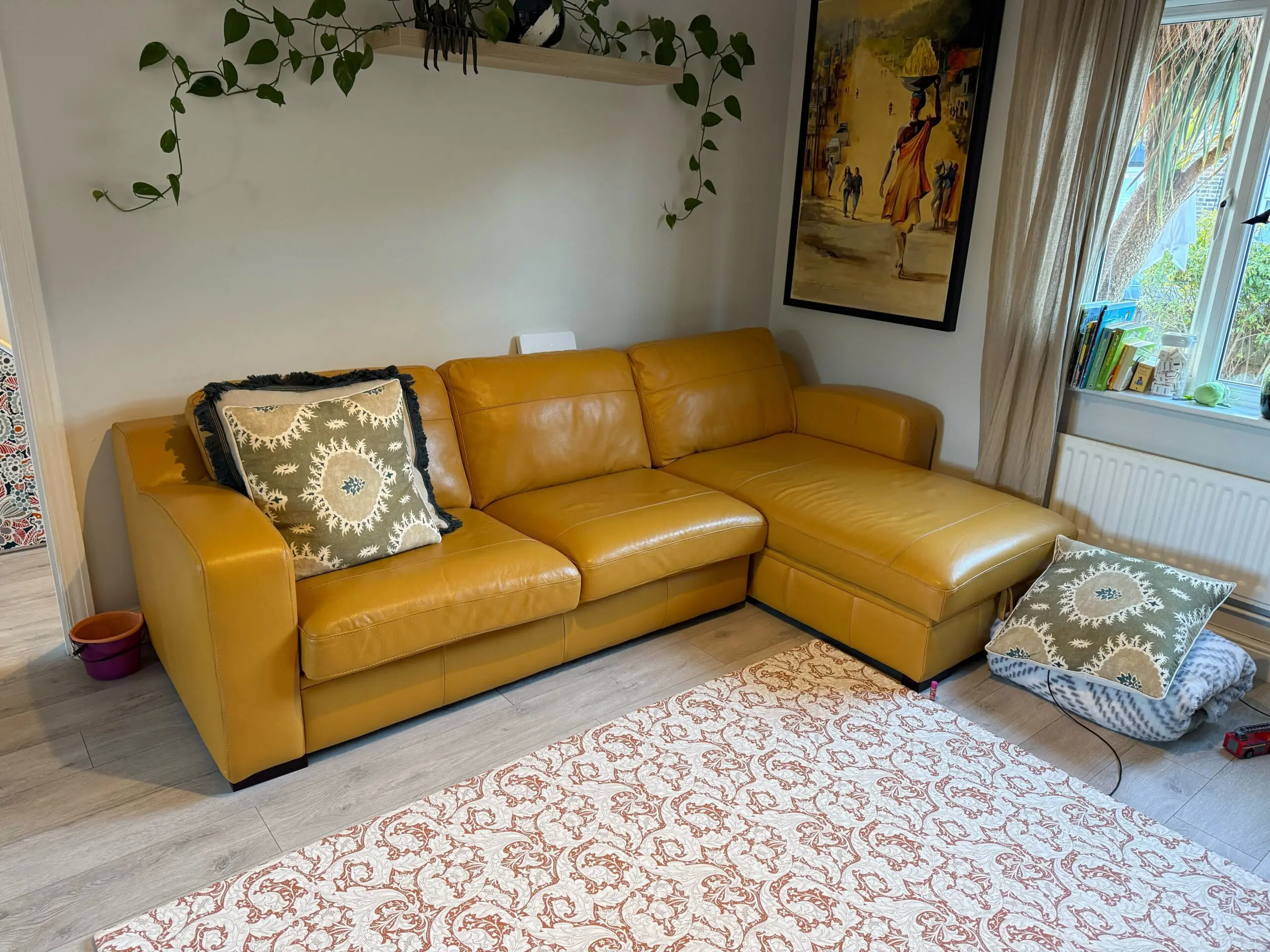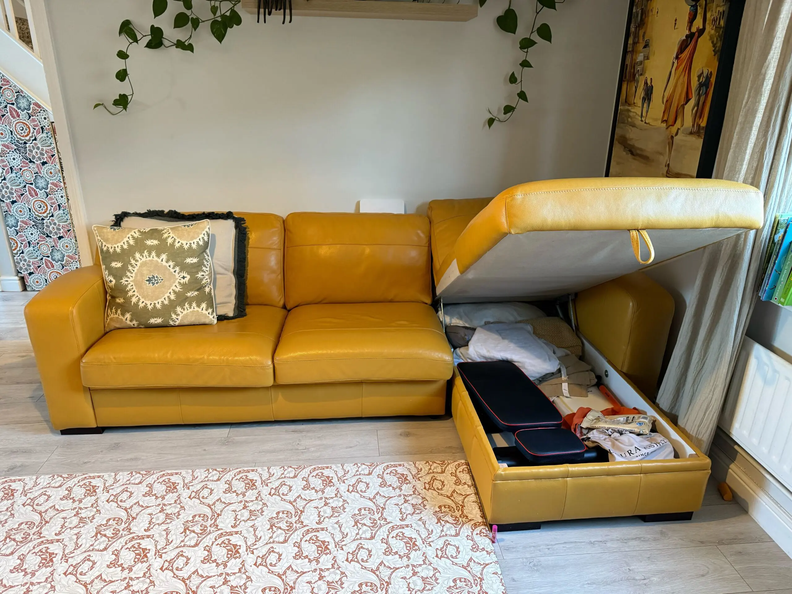 Leather sofa with double pull out bed and large under storage. Two years old in a house that isnt a primary residence so minimal usage.
