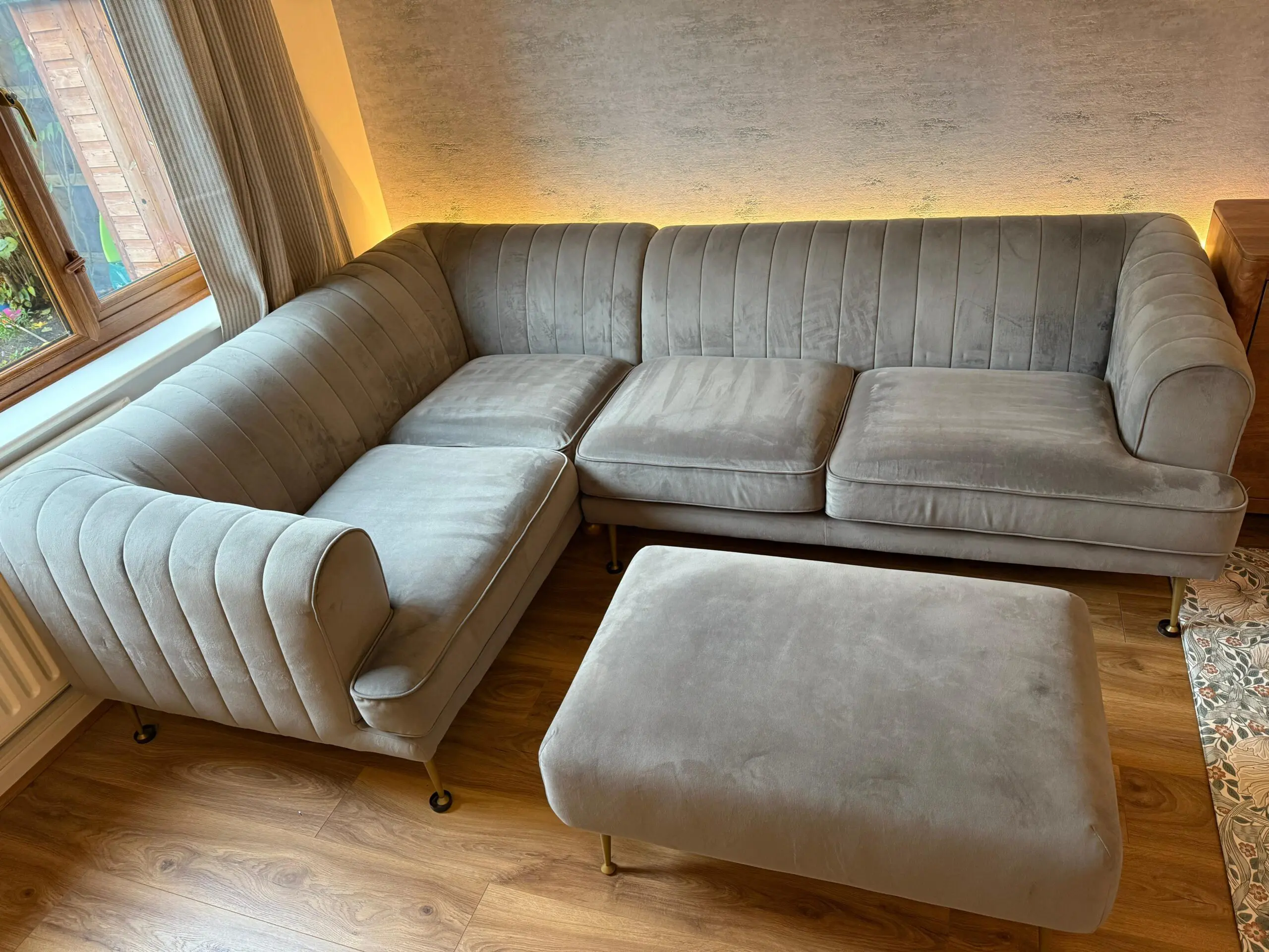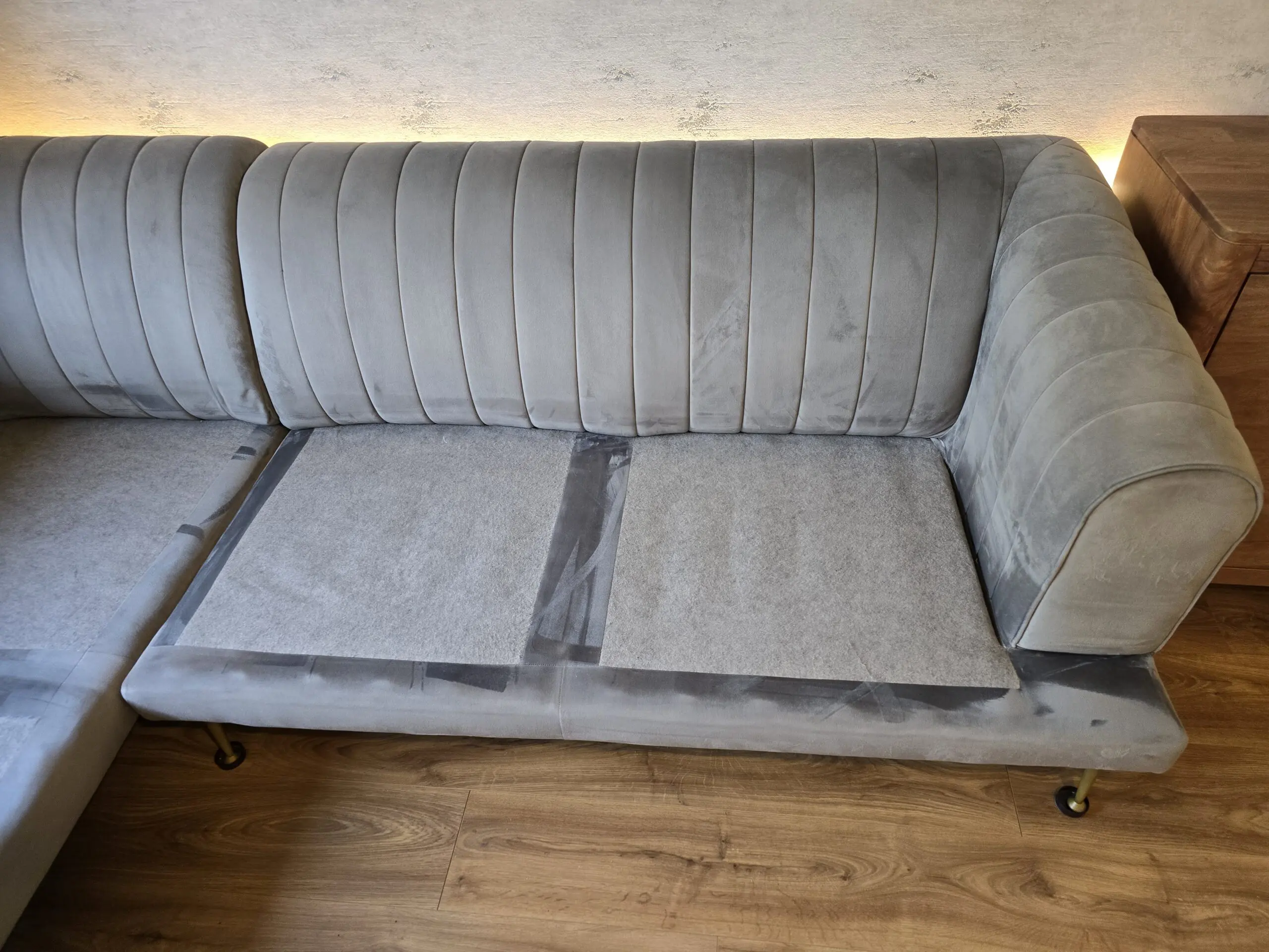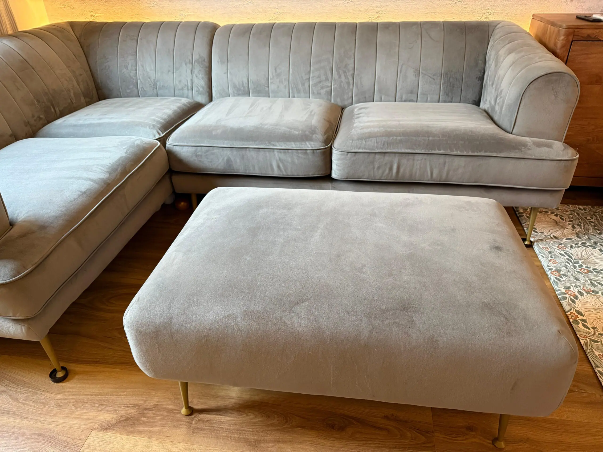 1 x Used DFS Enchanted Right Hand Facing Corner Sofa – Grey Velvet with Gold Legs