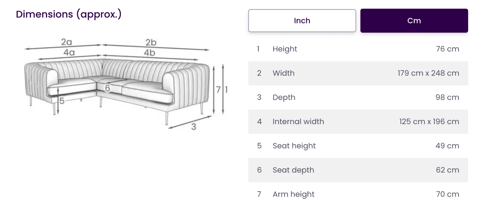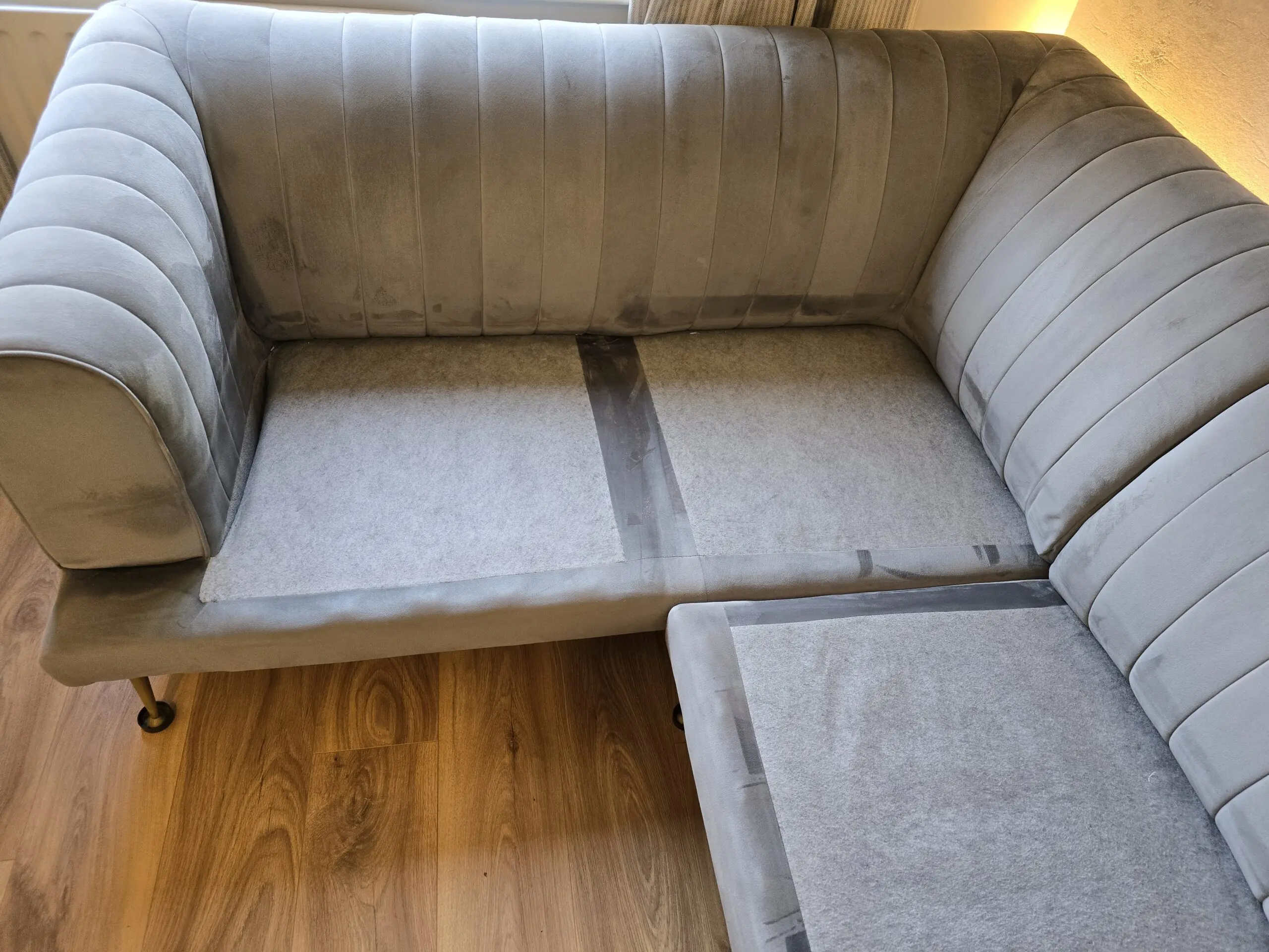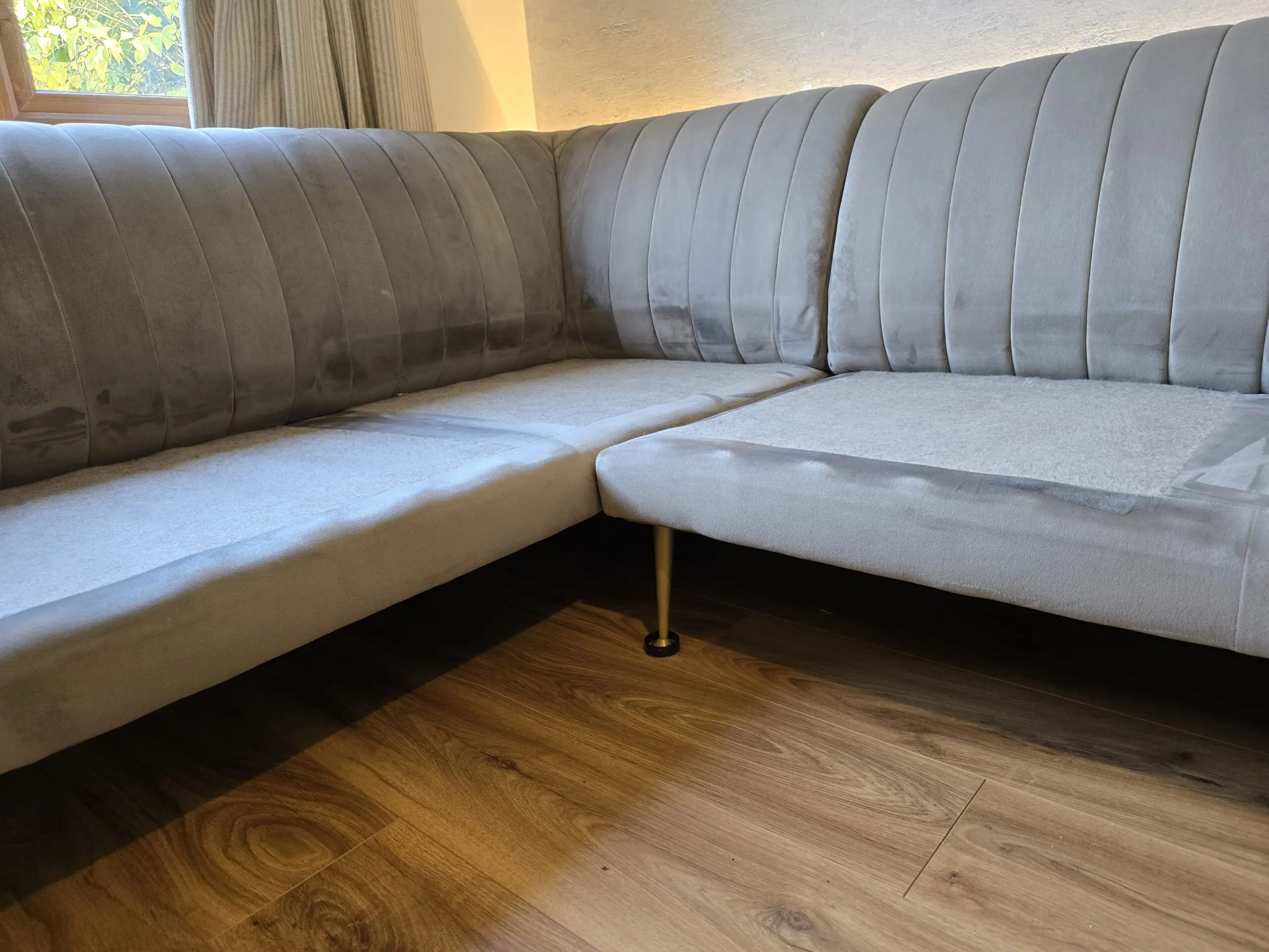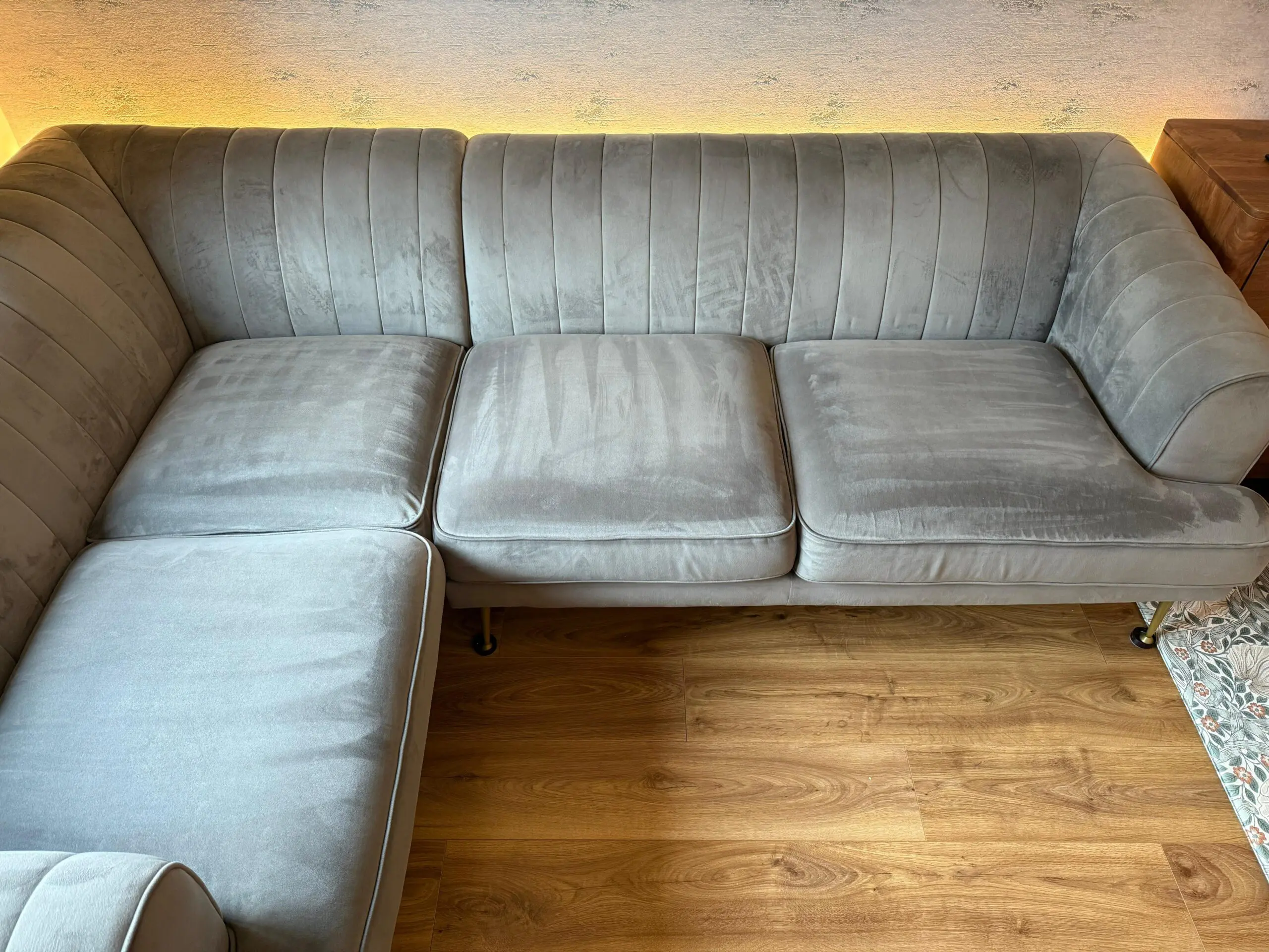 1 x Used DFS Enchanted Right Hand Facing Corner Sofa – Grey Velvet with Gold Legs
