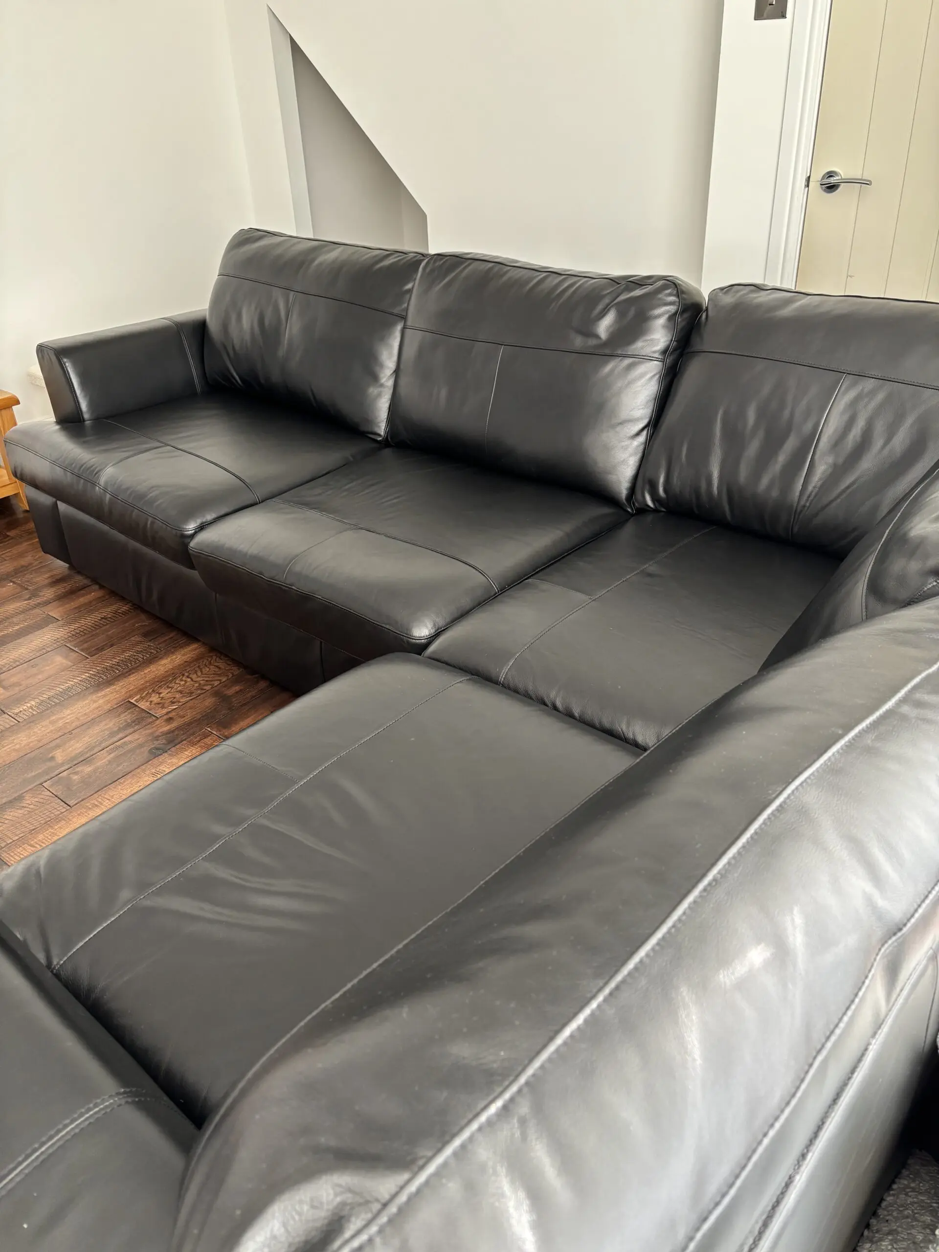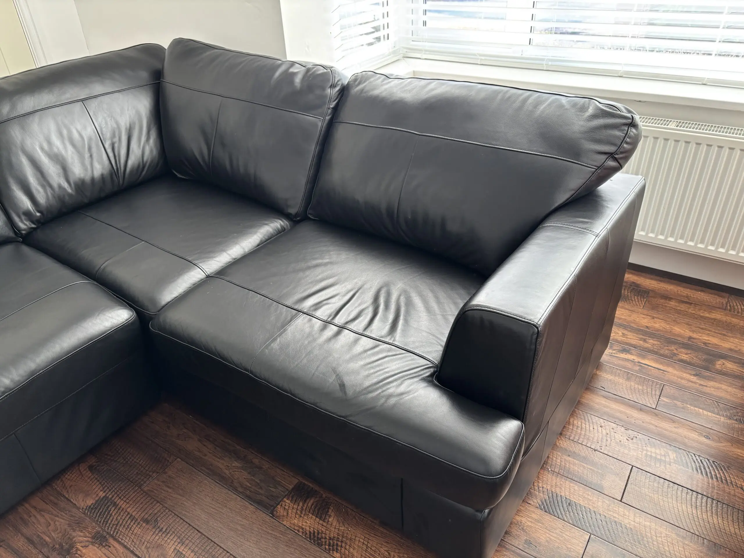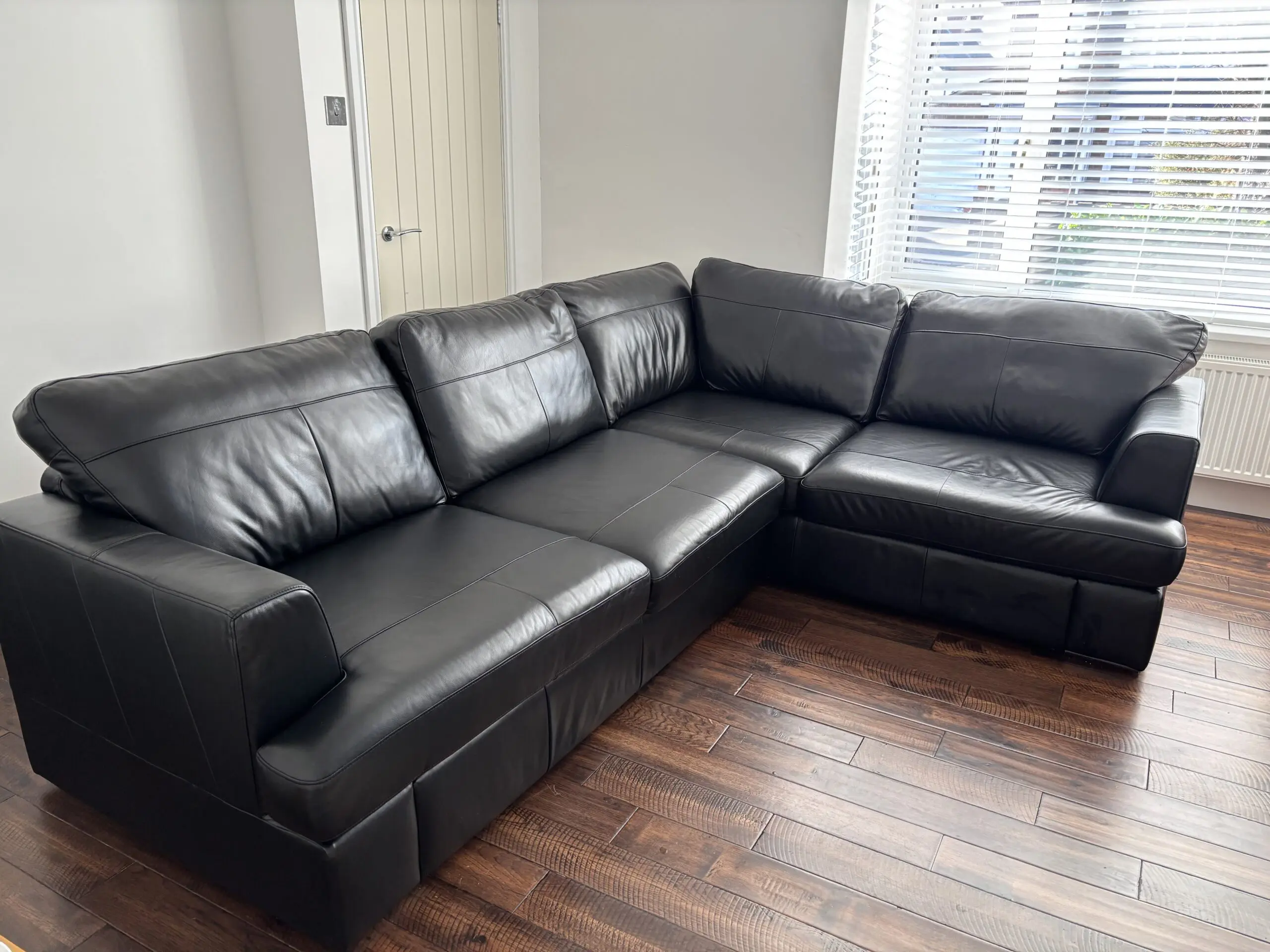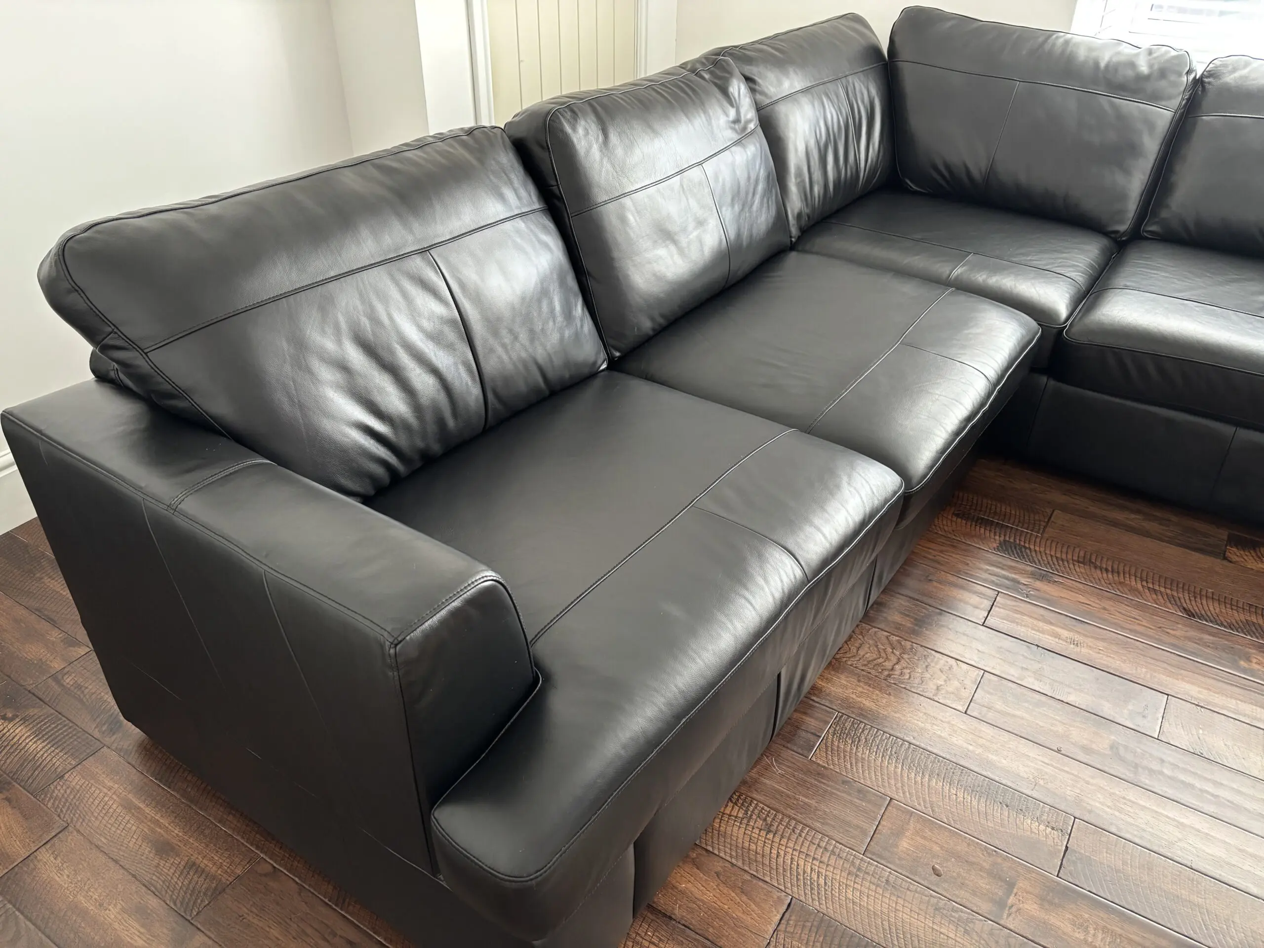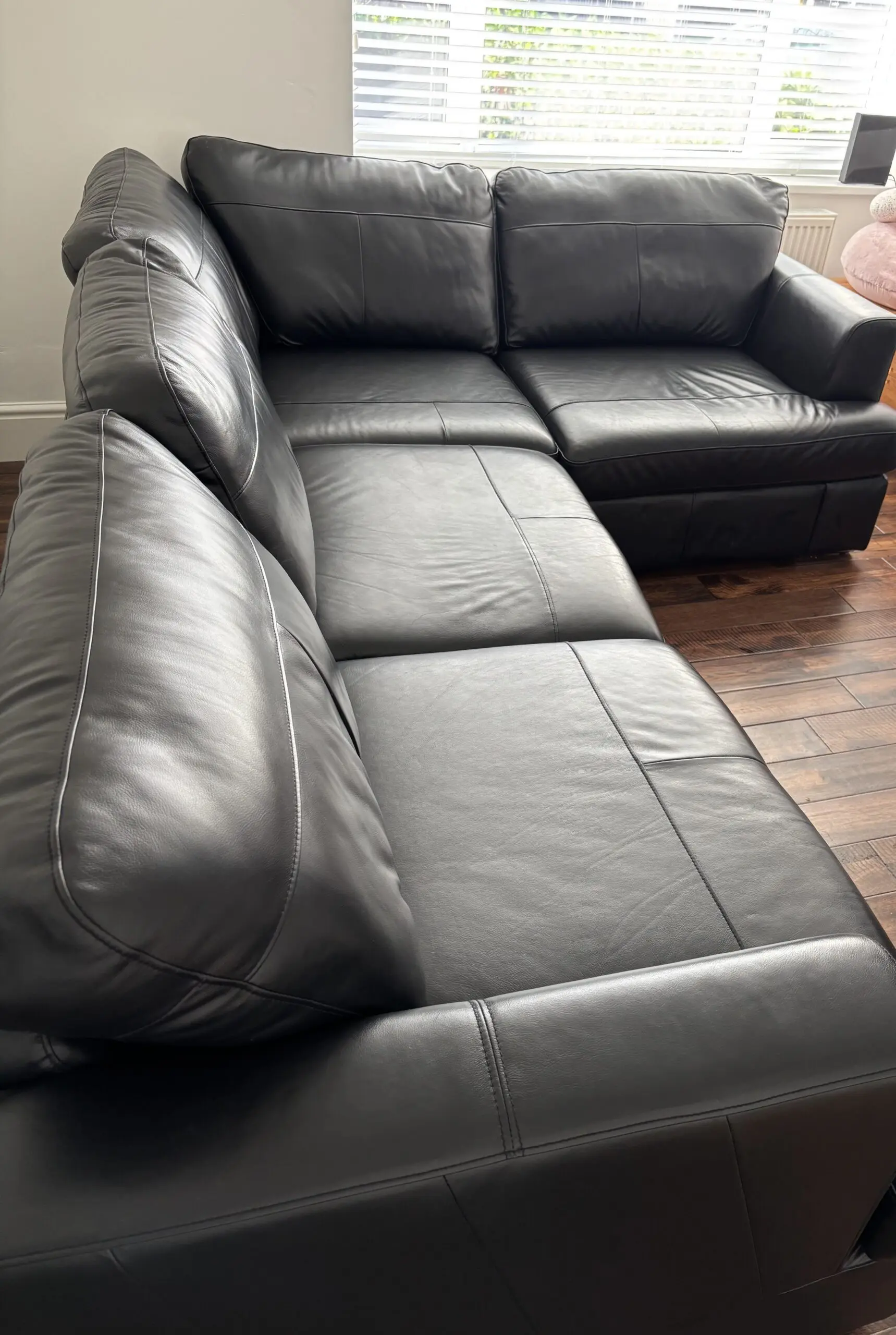 Black faux leather corner sofa from DFS, ‘Freya’ model.