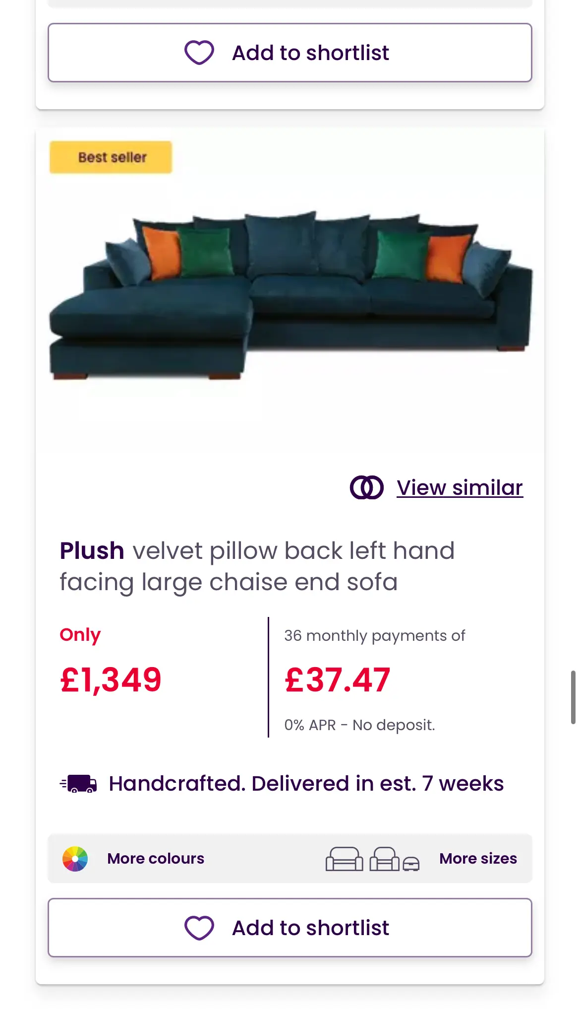 DFS Velvet Pillow Back Left Hand Facing Large Chaise End Sofa