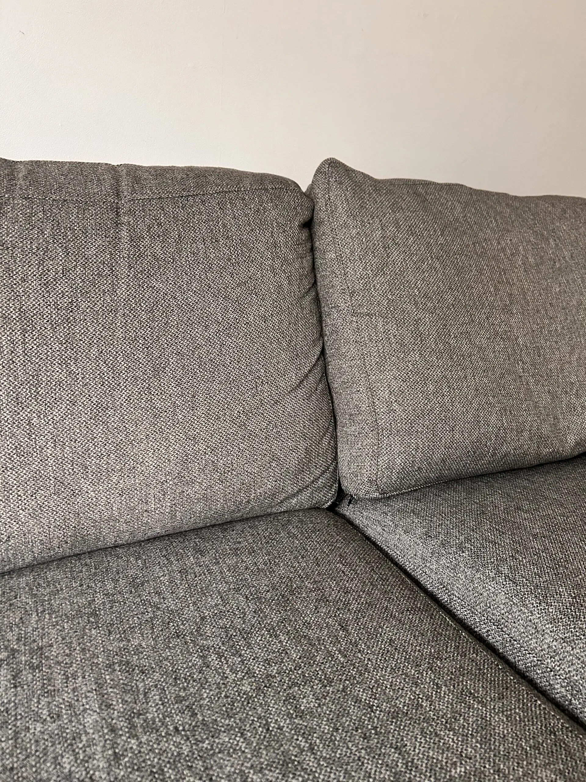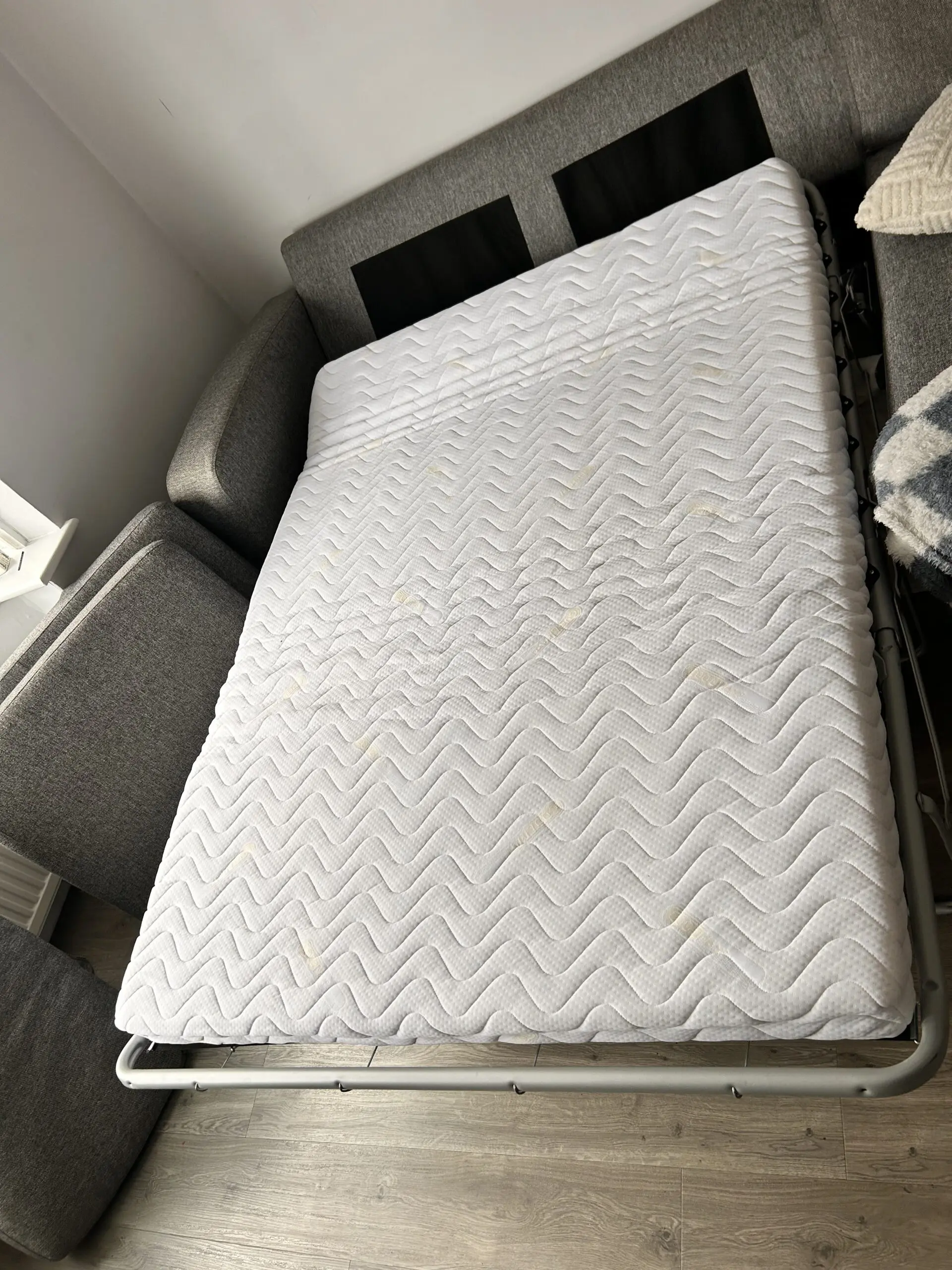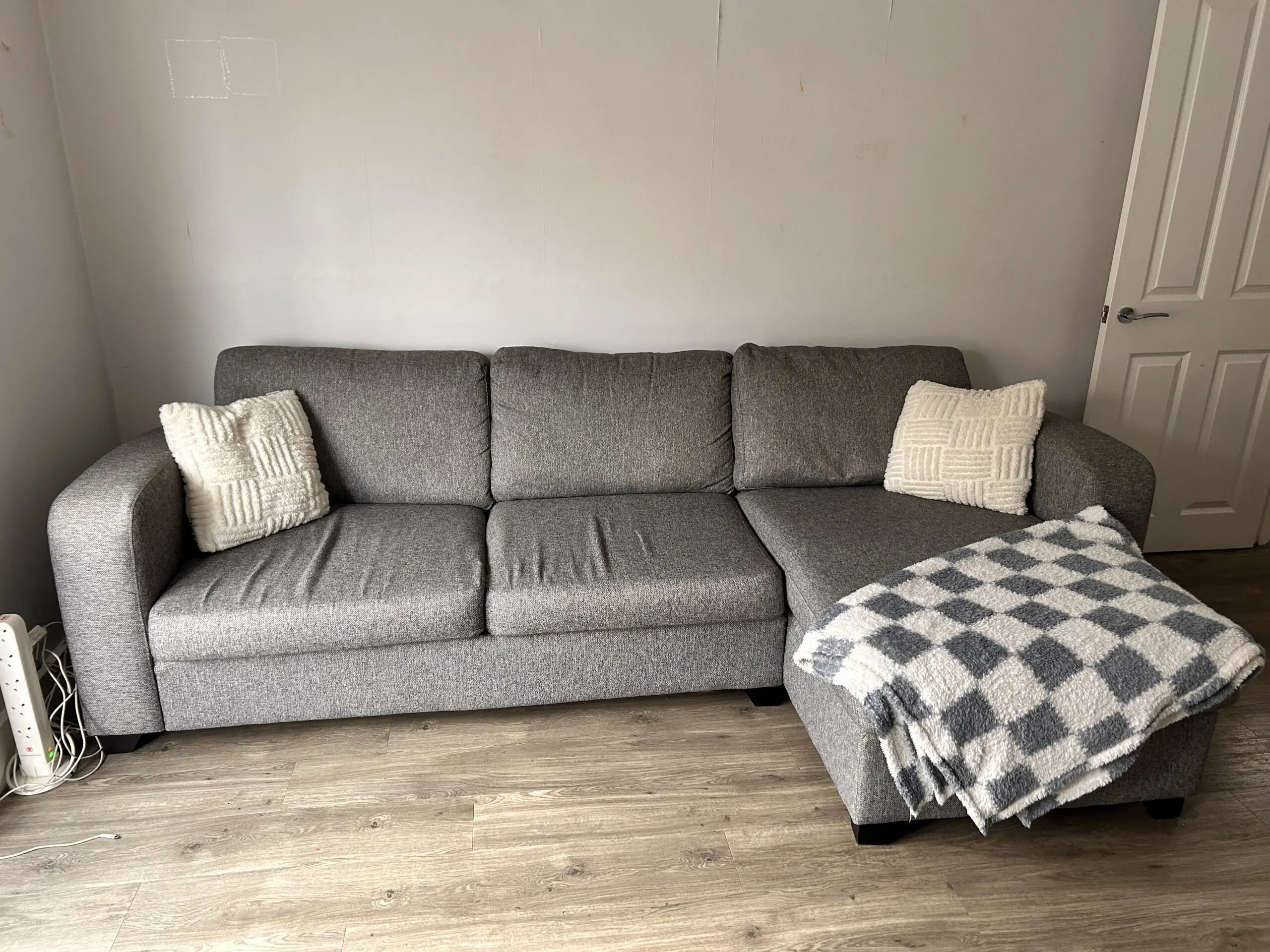 Sofa is L shape with a pull out bed with attached mattress. It is a very modern and versatile shade of grey, with really comfy seats.