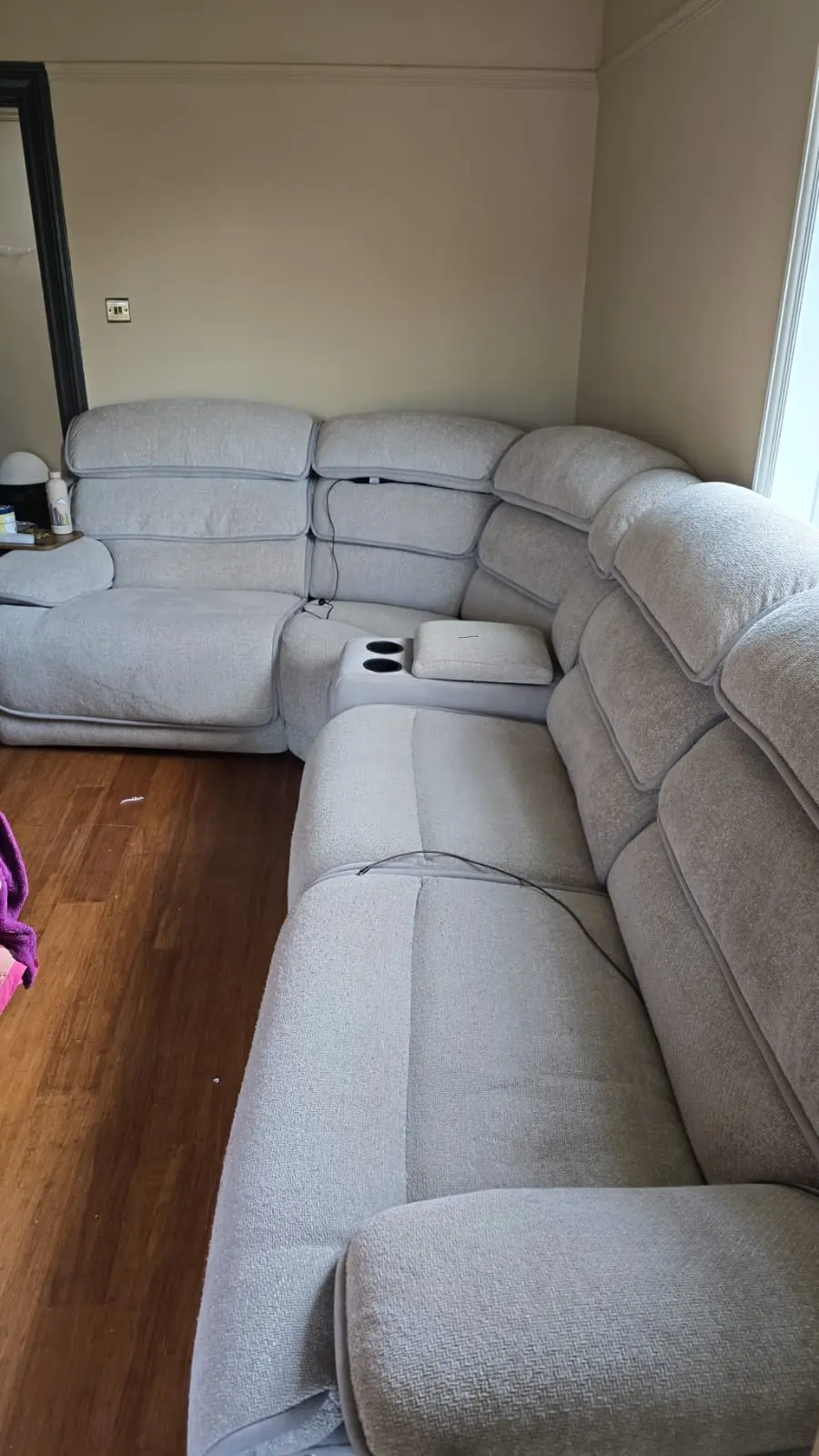 Its a 6 piece corner sofa with a console to store remotes and cup holder. along with a footstool.