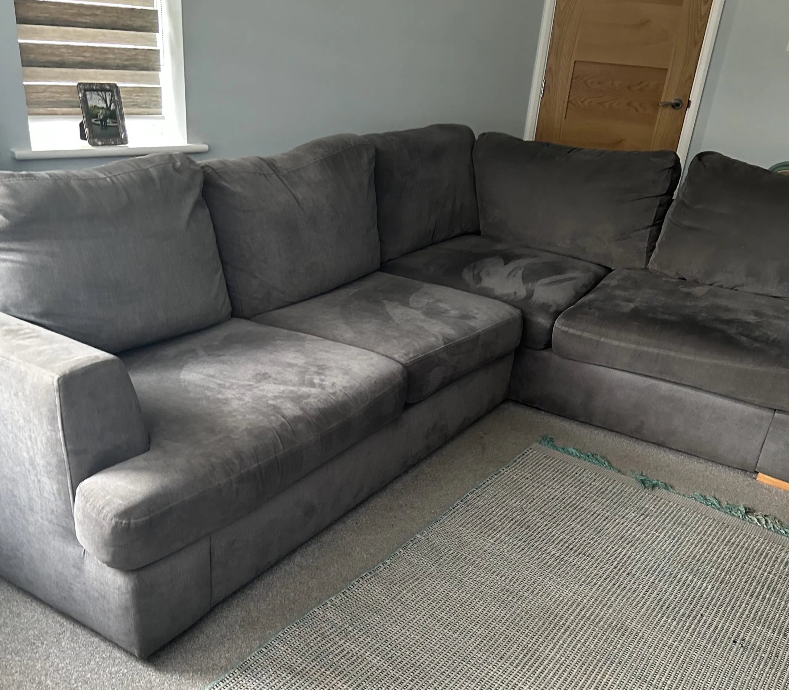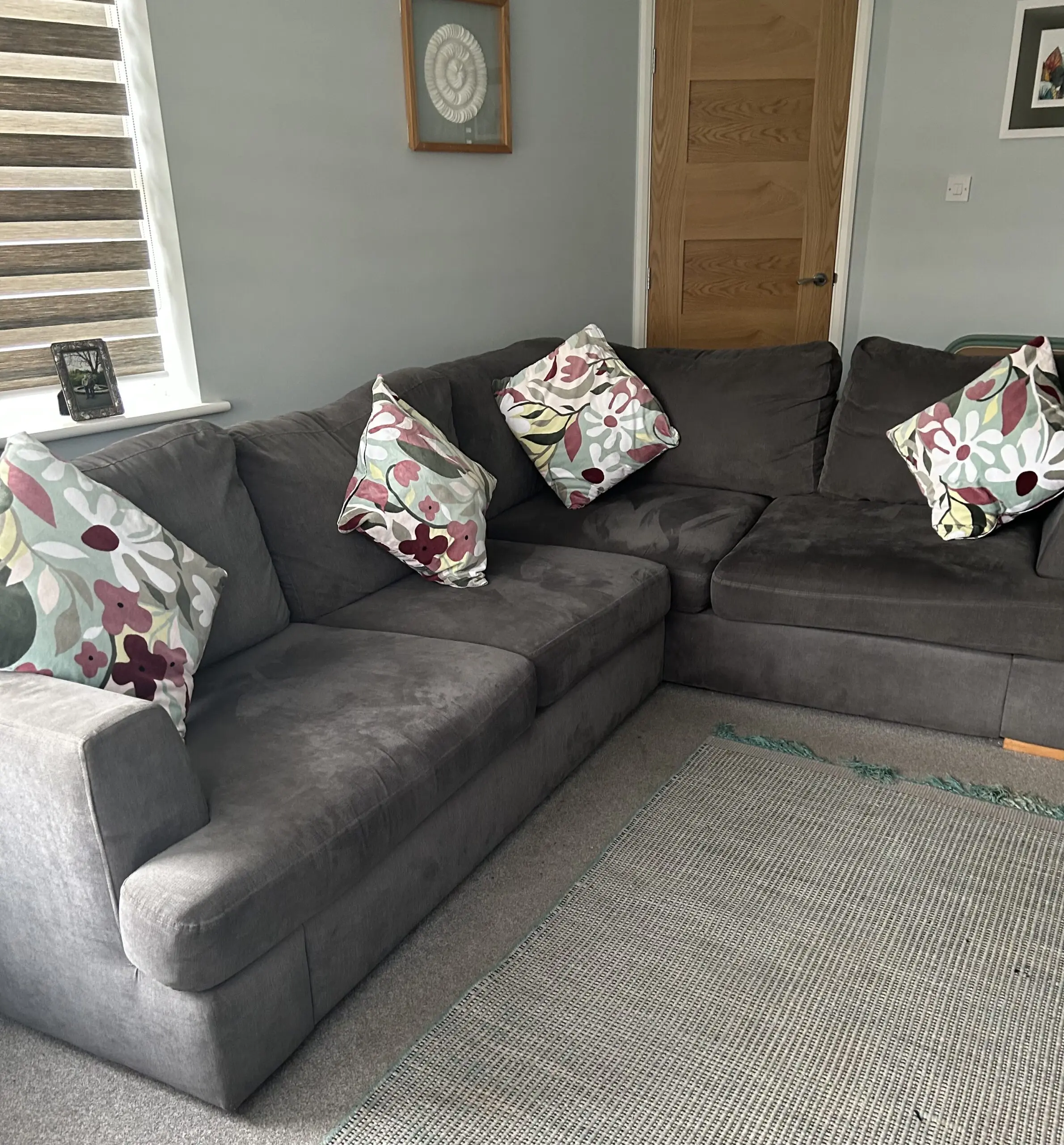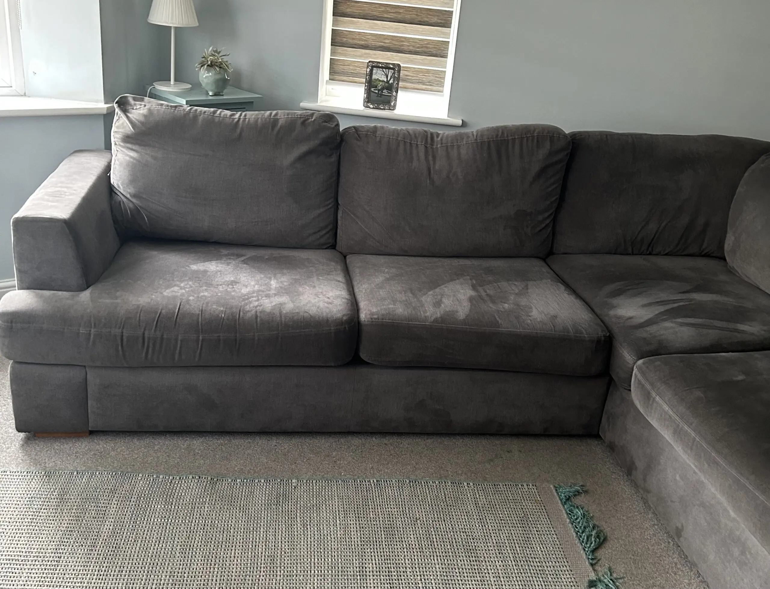 Grey soft touch fabric left hand corner sofabed. Good condition. Cost over £2000 new. Comfortably seats 5. Double sofabed (pull out) with as new mattress. Sale due to house move. Splits into 2 parts for easy removal/installation.