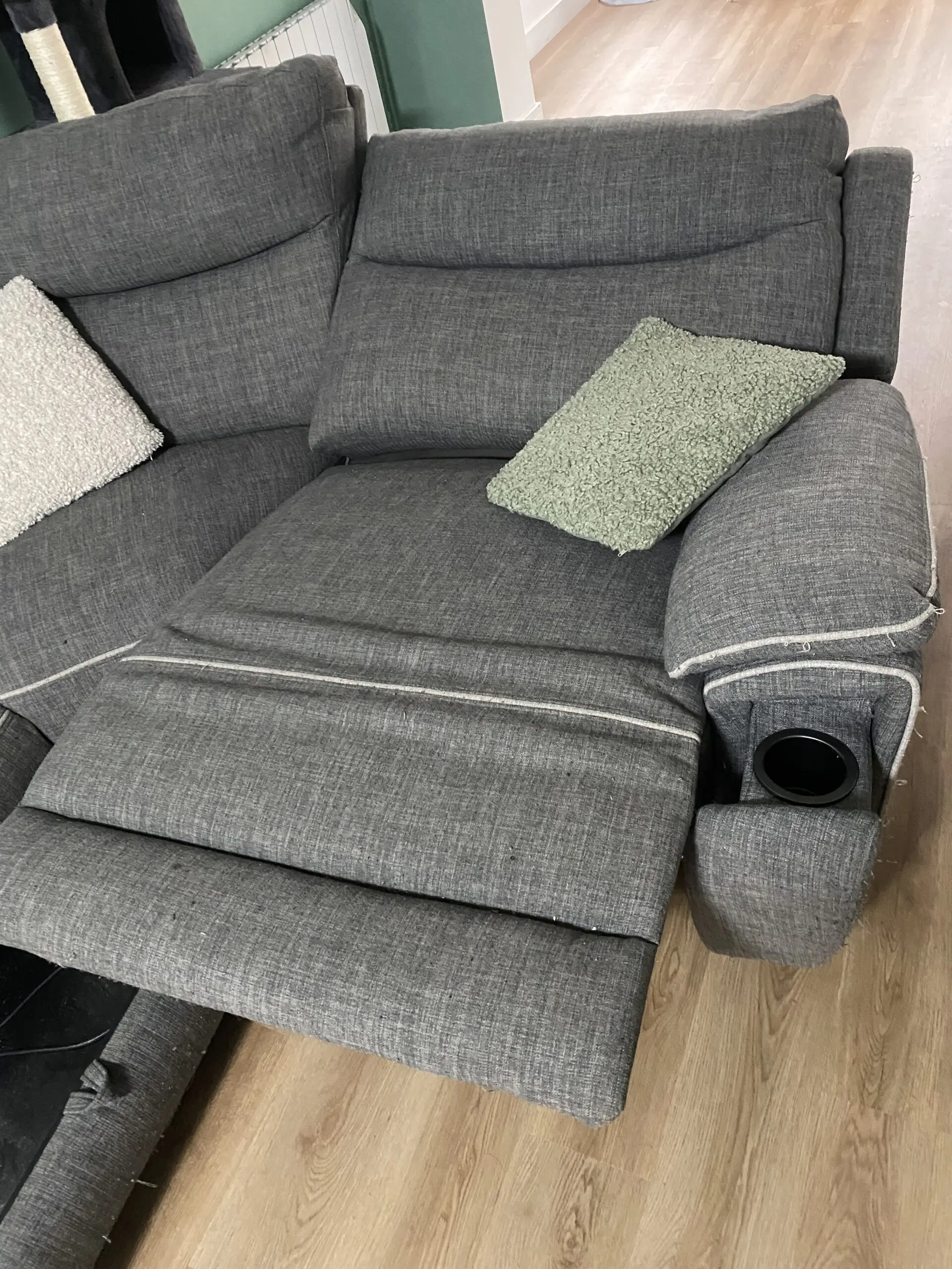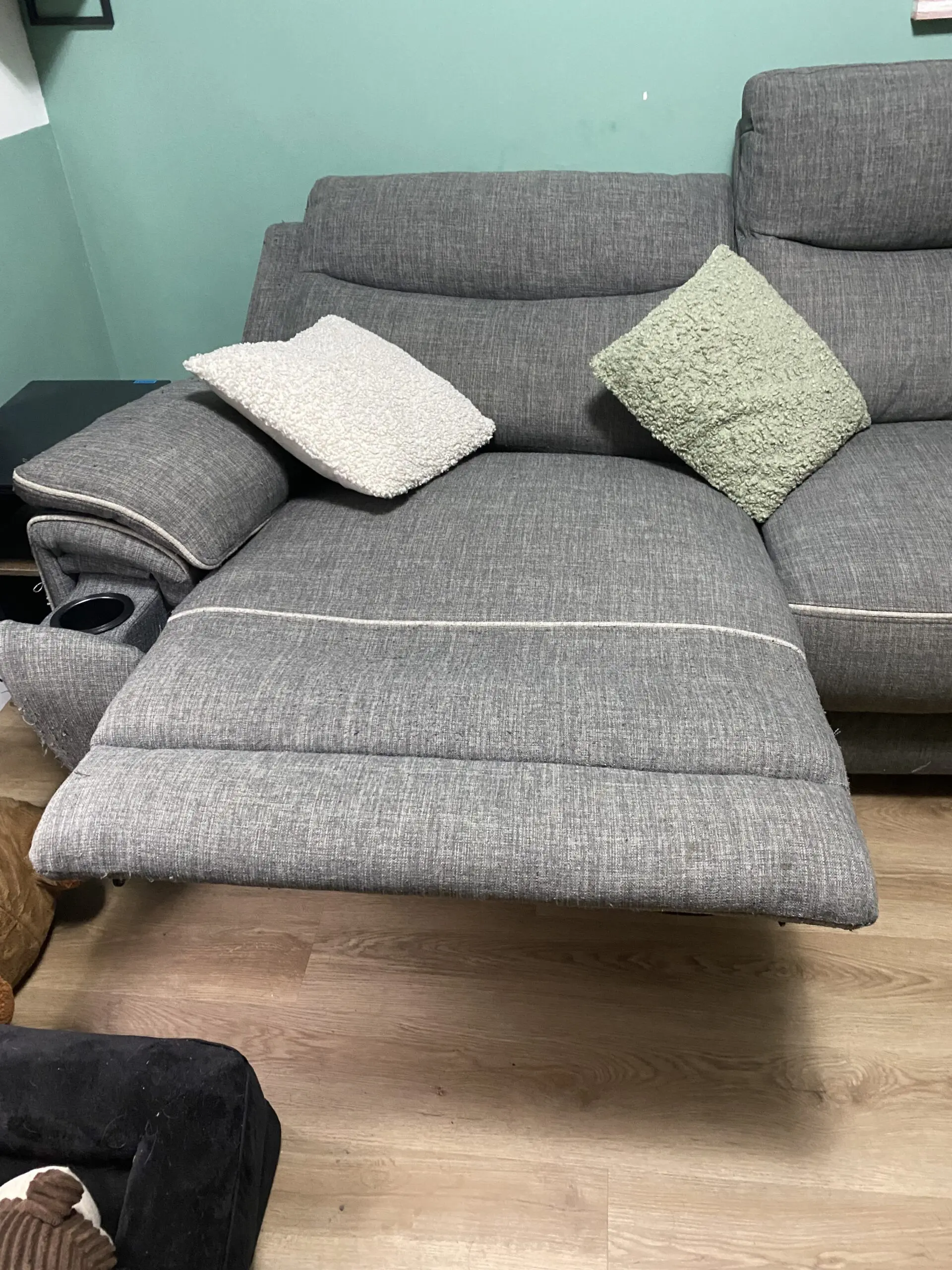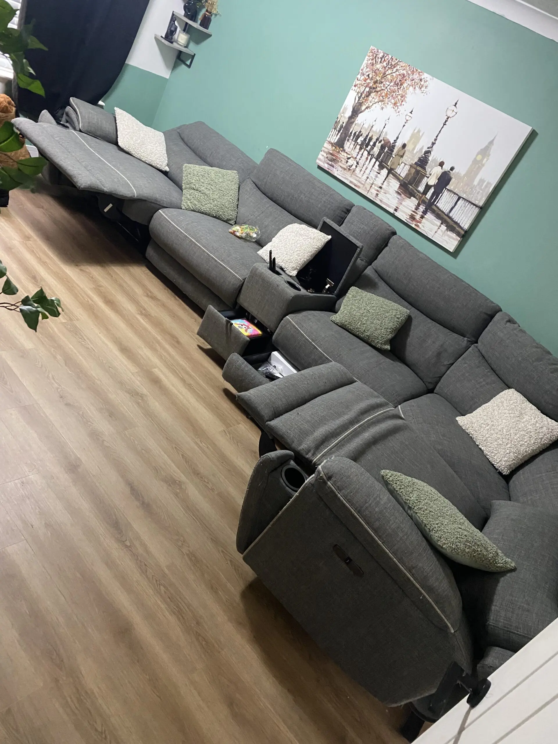 Grey corner sofa with power recliners and has usb charger ports both sides. 4 cup holders, multiple storage space and reclining headrest with reading light. A few pluck marks (pictured) but still good condition. Comes in 6 parts so can adjust corner to any room. Coast £3500 3 years ago.