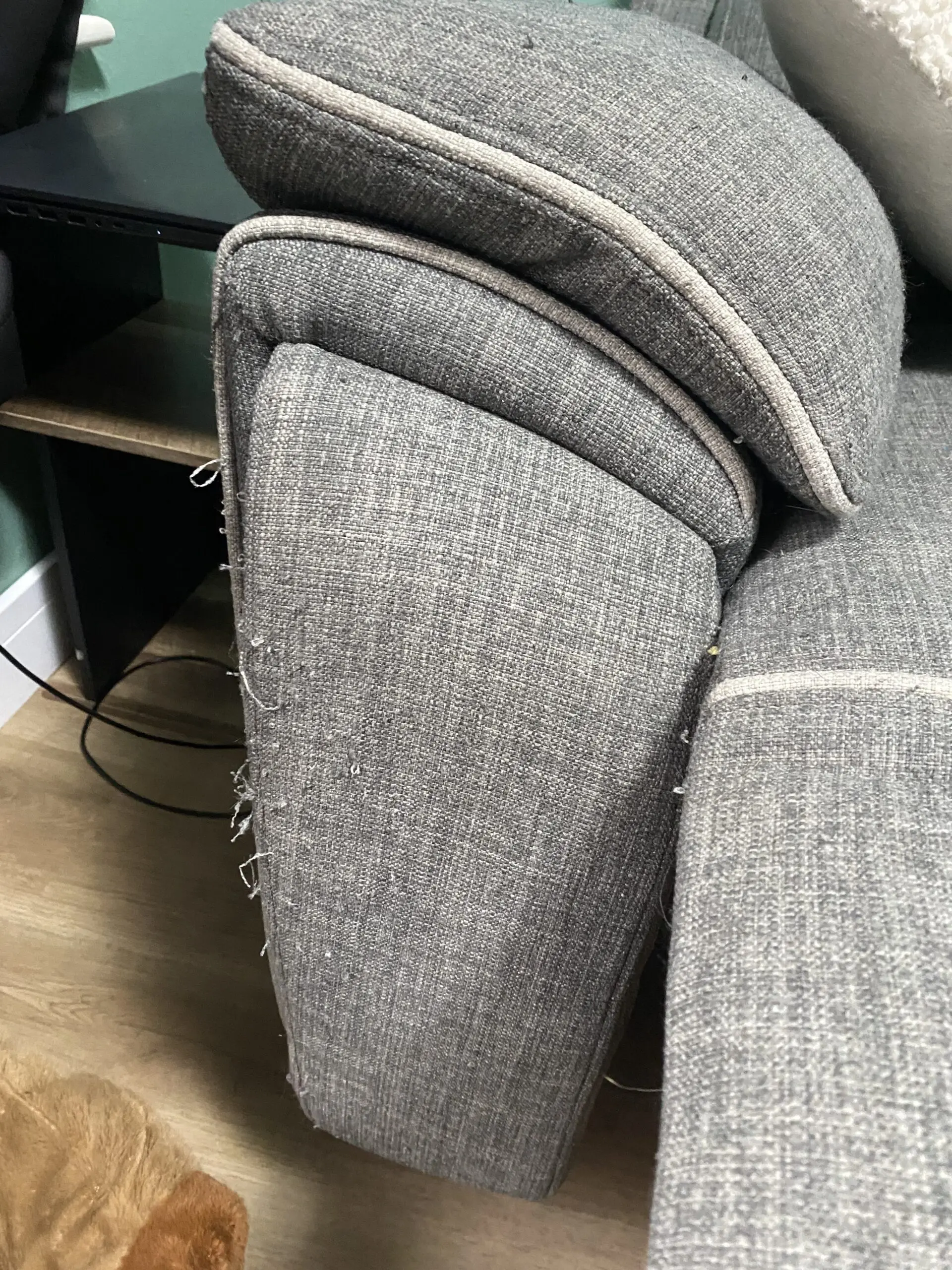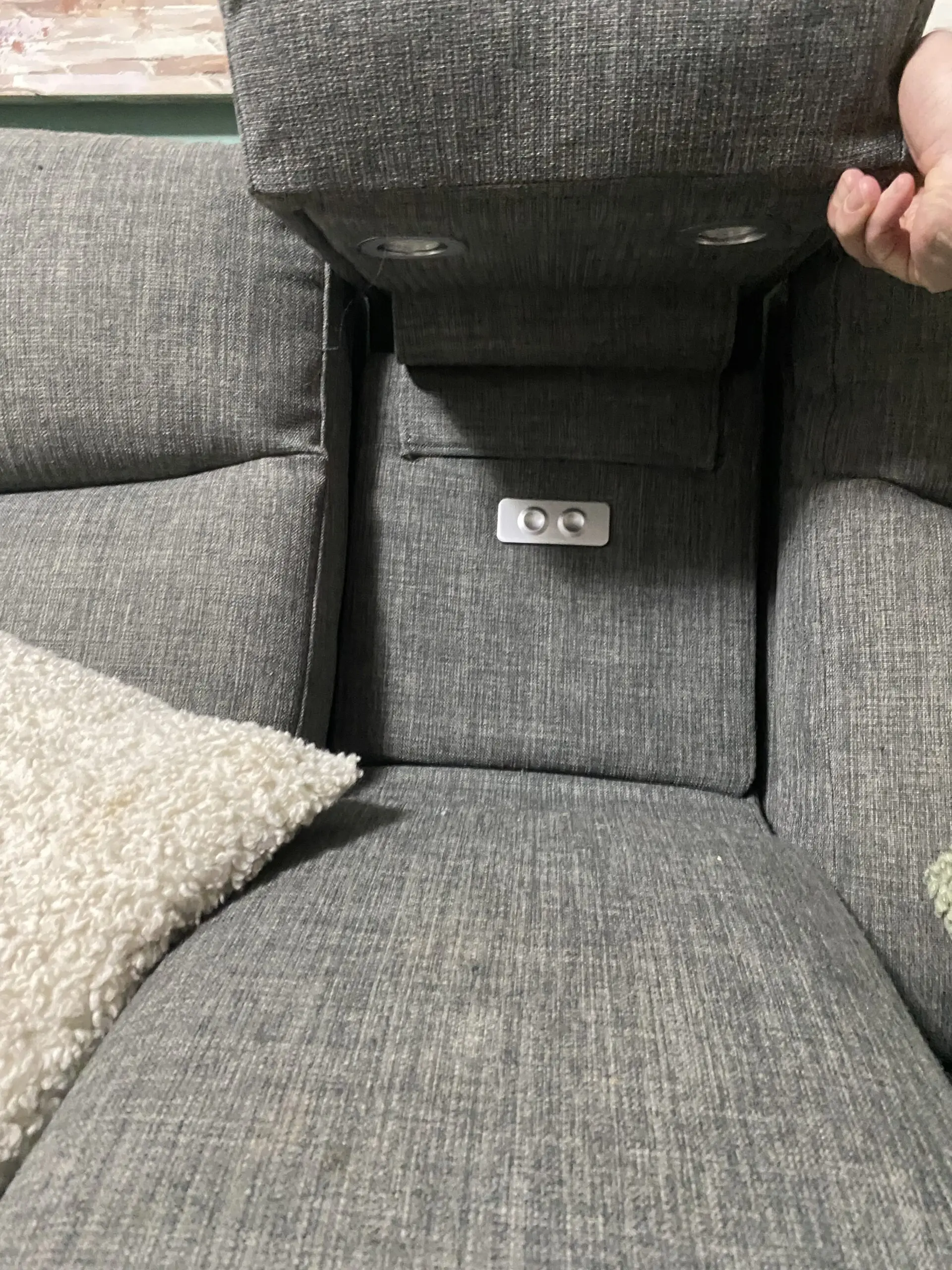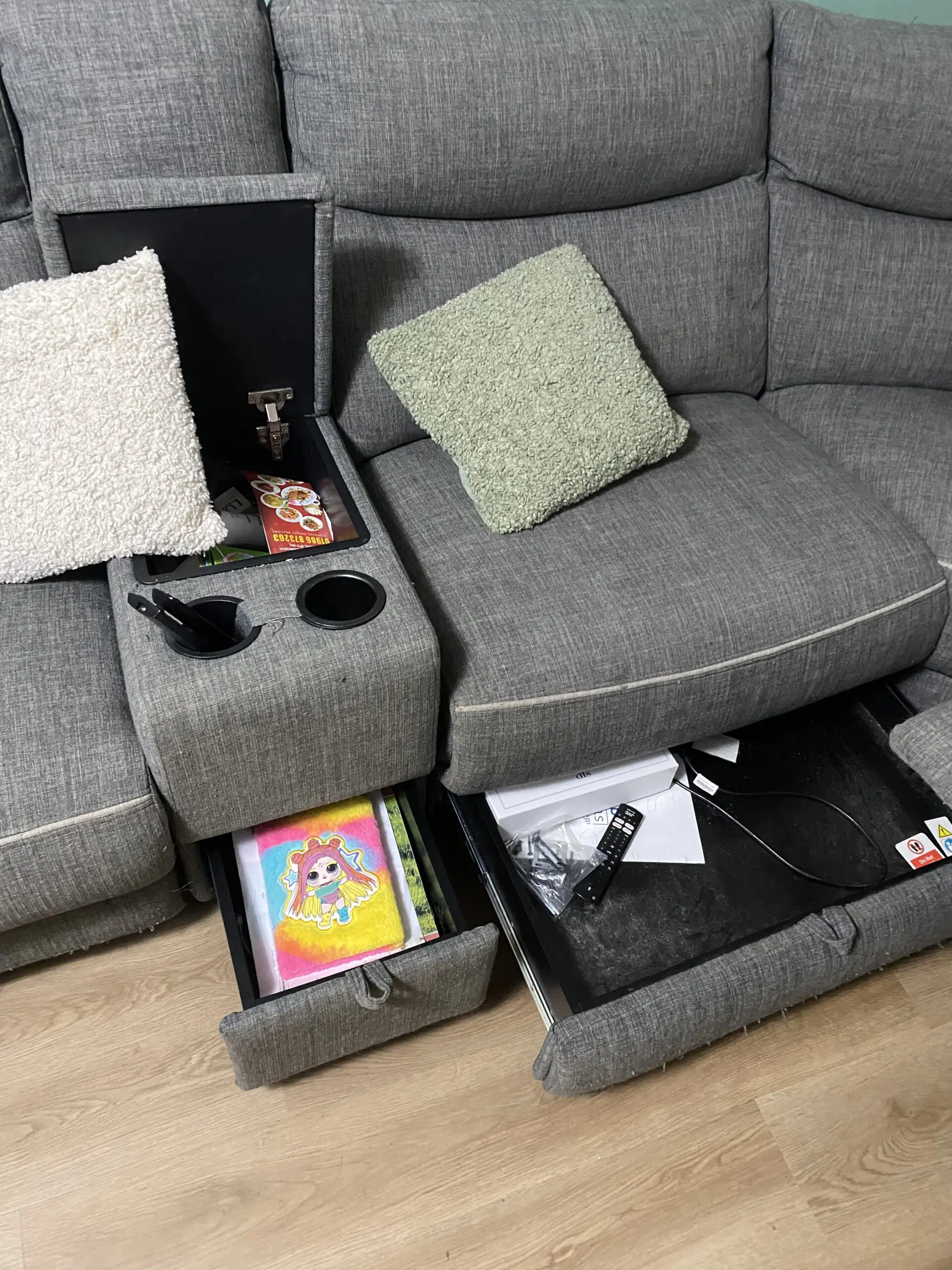 Grey corner sofa with power recliners and has usb charger ports both sides. 4 cup holders, multiple storage space and reclining headrest with reading light. A few pluck marks (pictured) but still good condition. Comes in 6 parts so can adjust corner to any room. Coast £3500 3 years ago.