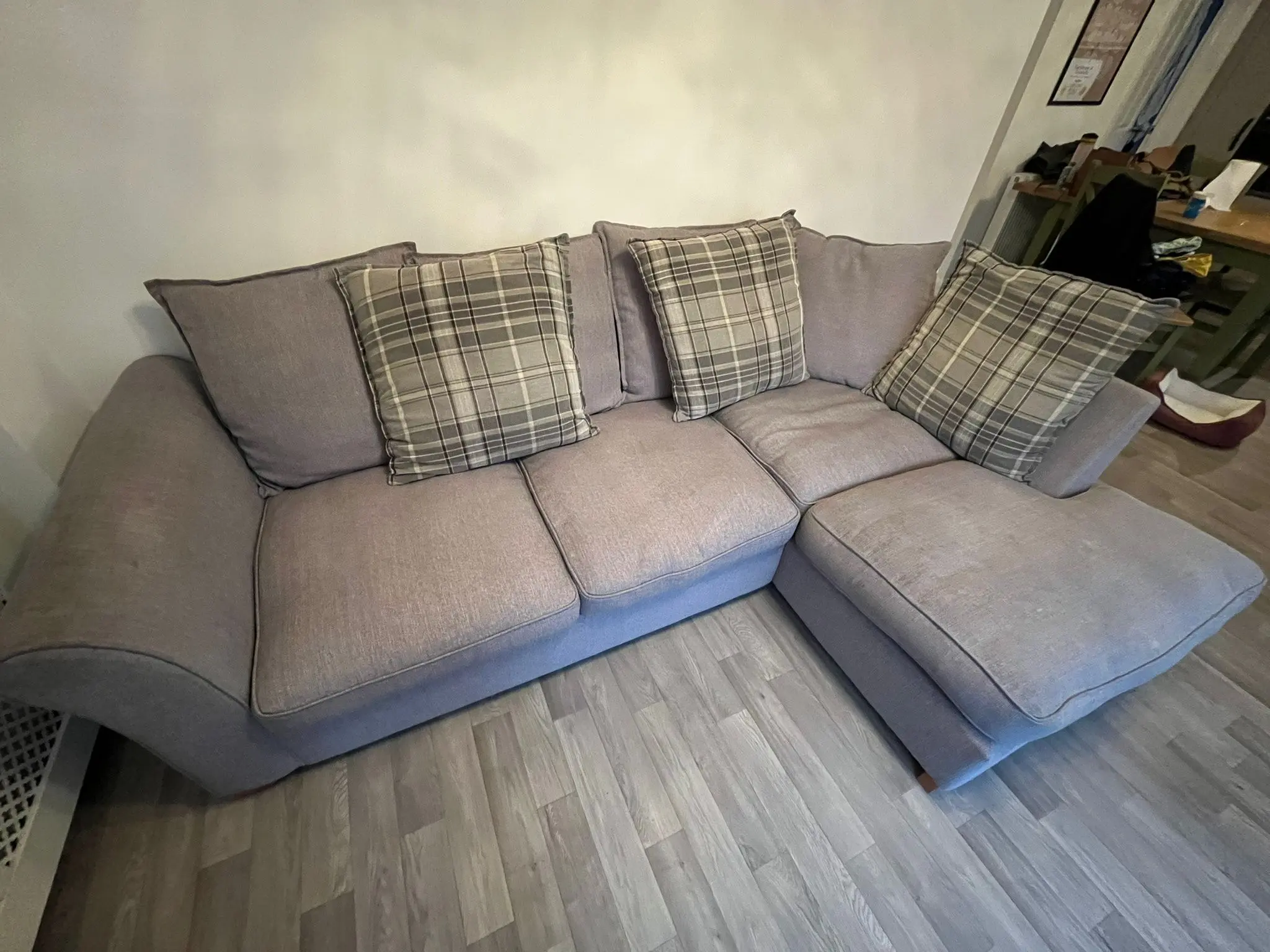 Grey right hand corner sofa, some small marks on the arm but these will be cleaned off properly before collection. It’s in great condition, there are no tears, no snags. Always had a protective cover over the main body.