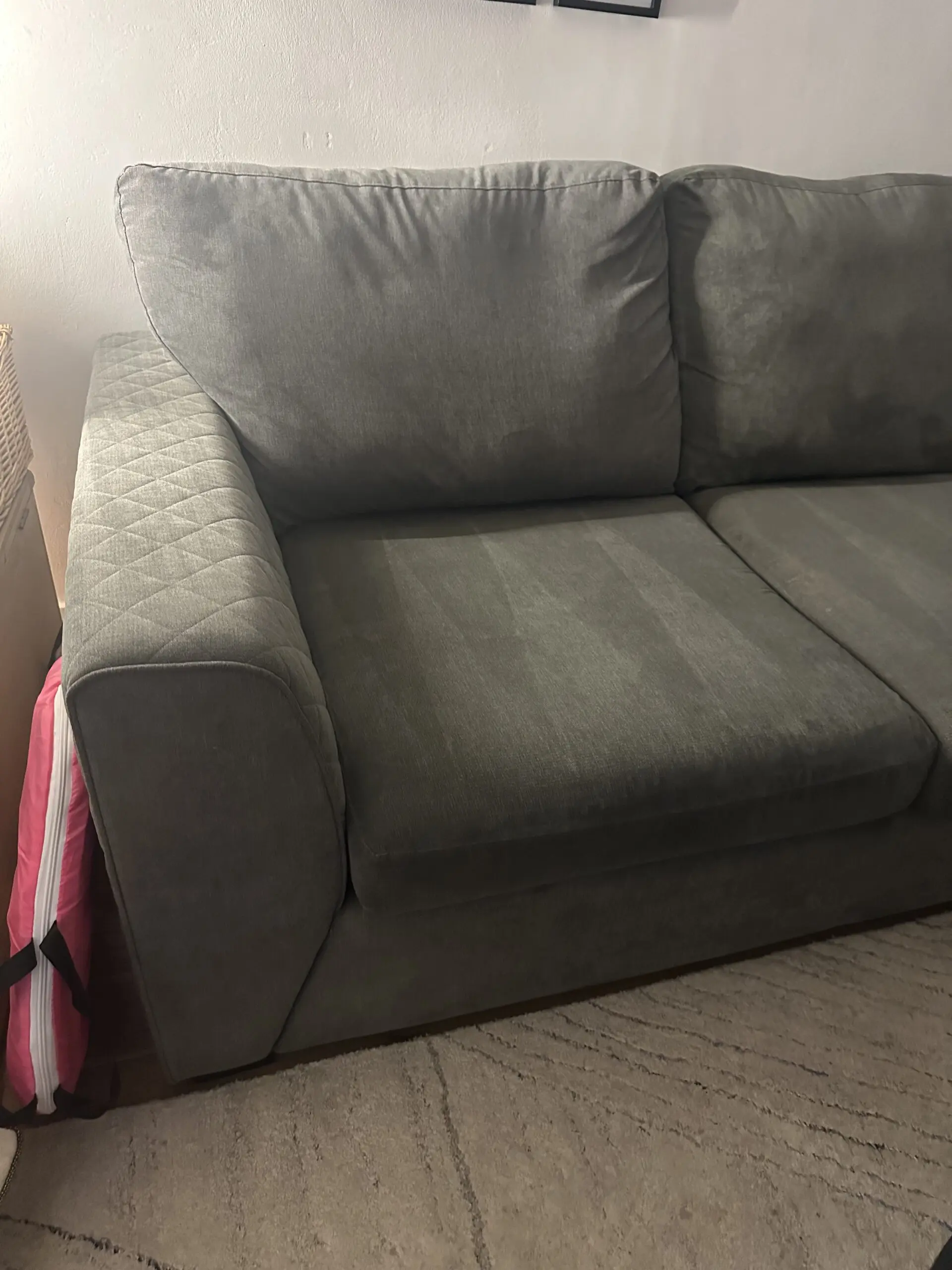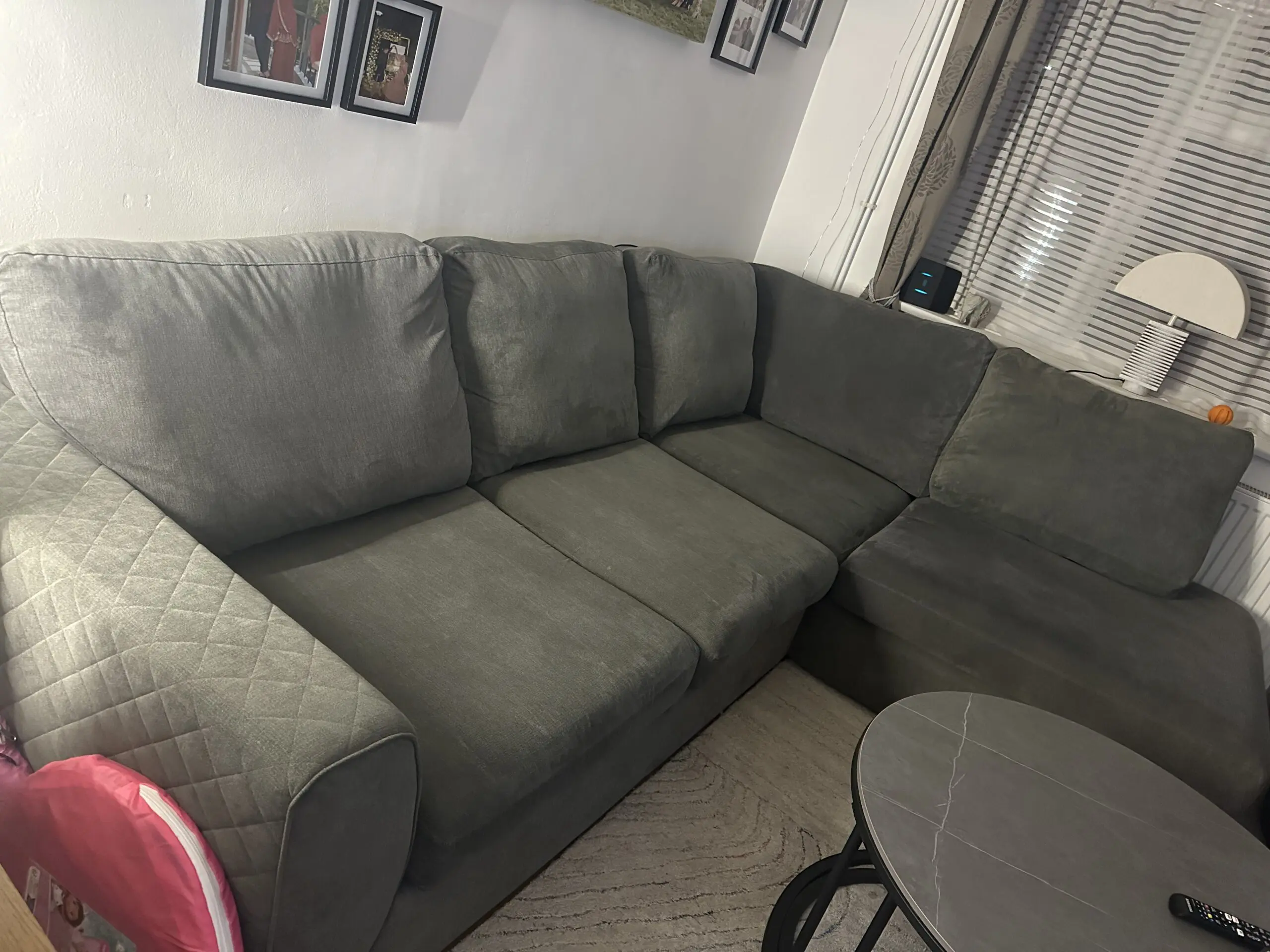 This DFS Grey Xander Corner Sofa is 4 years old, purchased in January 2022. It comes from a smoke free home, was well looked after and hoovered regularly. It has no structural damage, the upholstery is in good condition with no rips or tears.