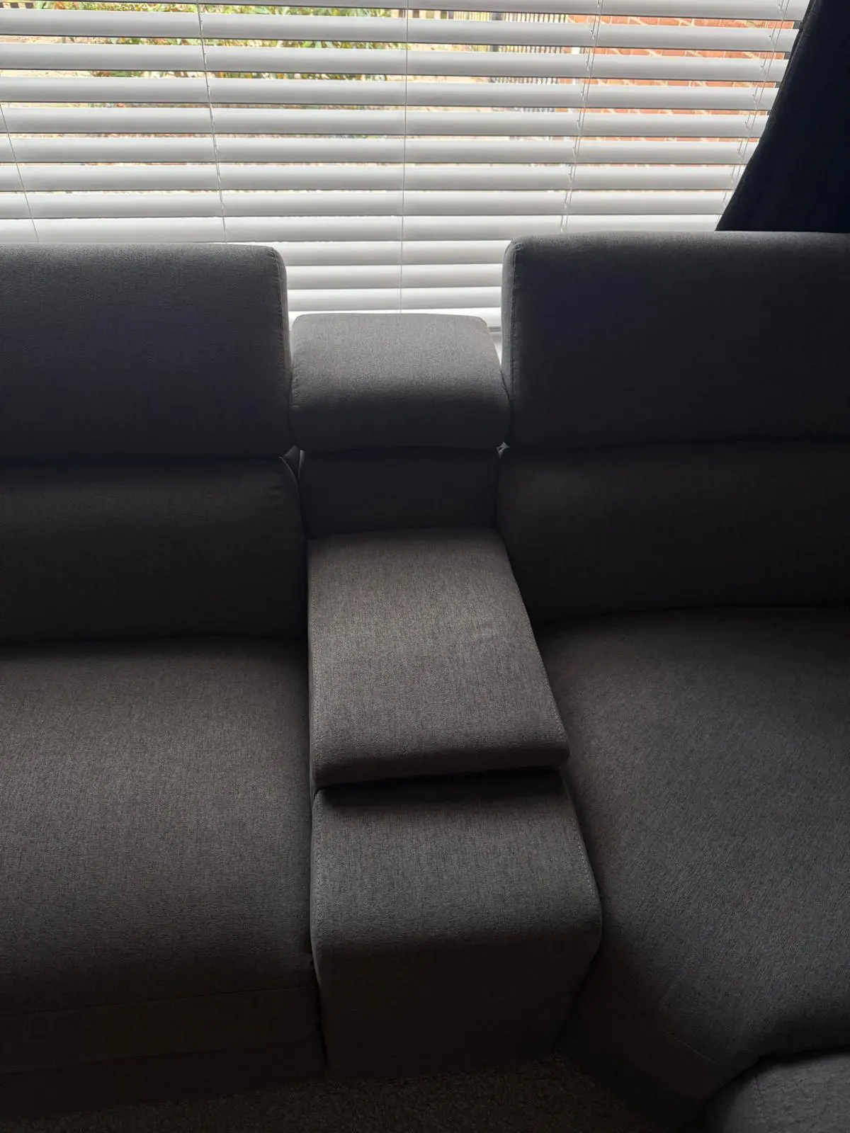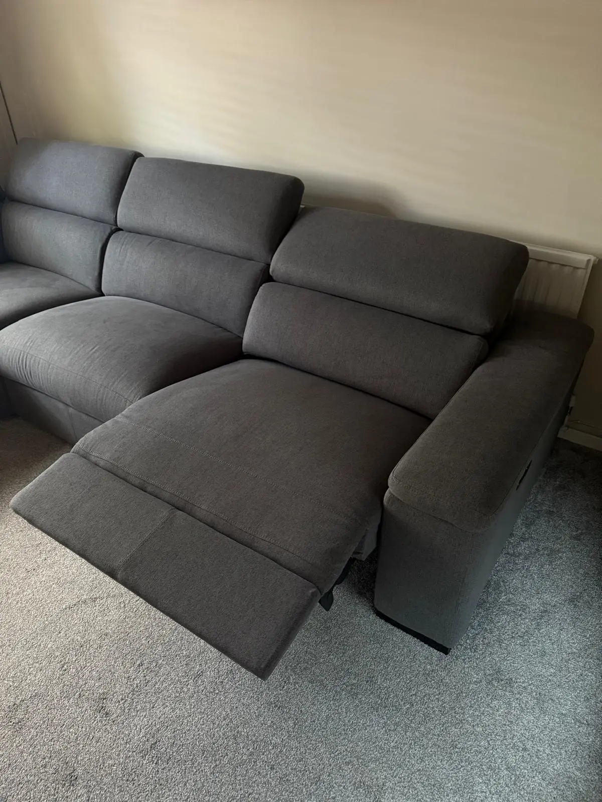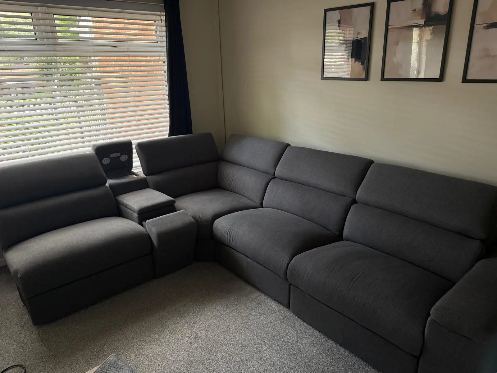 Excellent 6 piece right hand corner sofa with a single reclining electric arm chair with plenty of storage spaces, cup holders and has USB and plug charging points. The footstall/ottoman can be attached to the end of sofa or used as a footstool. the headrests can be manually recline/declined, and the console unit with the storage and plug sockets can be place between three parts of the sofa so the layout is down to your preference.