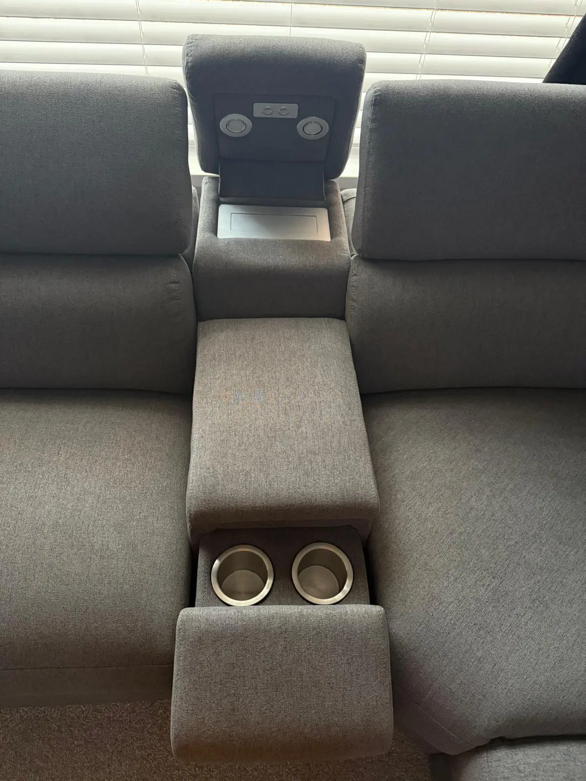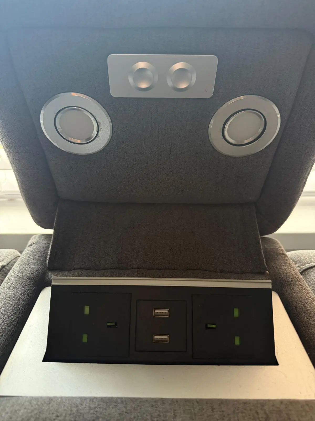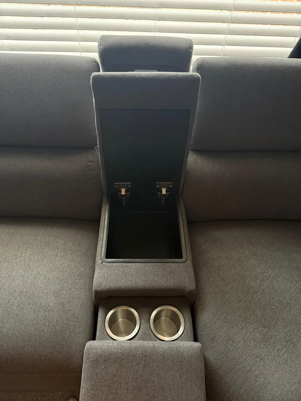 Excellent 6 piece right hand corner sofa with a single reclining electric arm chair with plenty of storage spaces, cup holders and has USB and plug charging points. The footstall/ottoman can be attached to the end of sofa or used as a footstool. the headrests can be manually recline/declined, and the console unit with the storage and plug sockets can be place between three parts of the sofa so the layout is down to your preference.