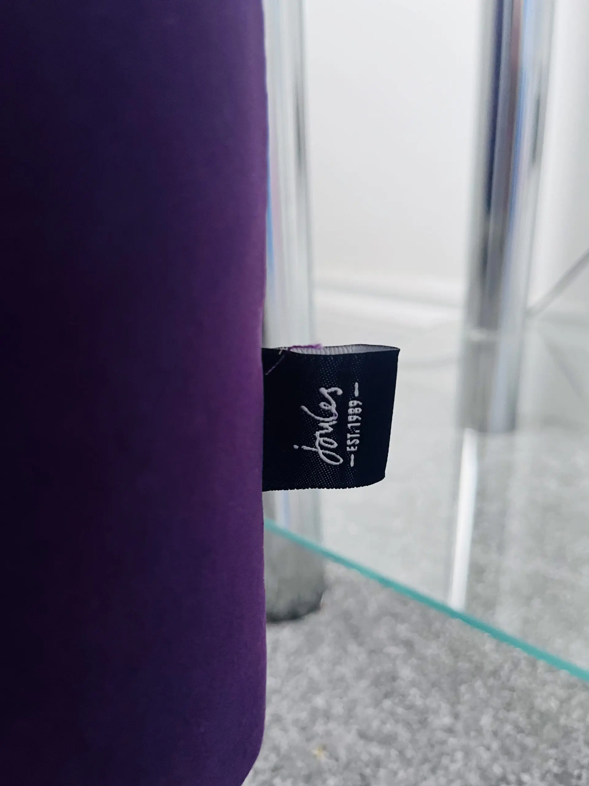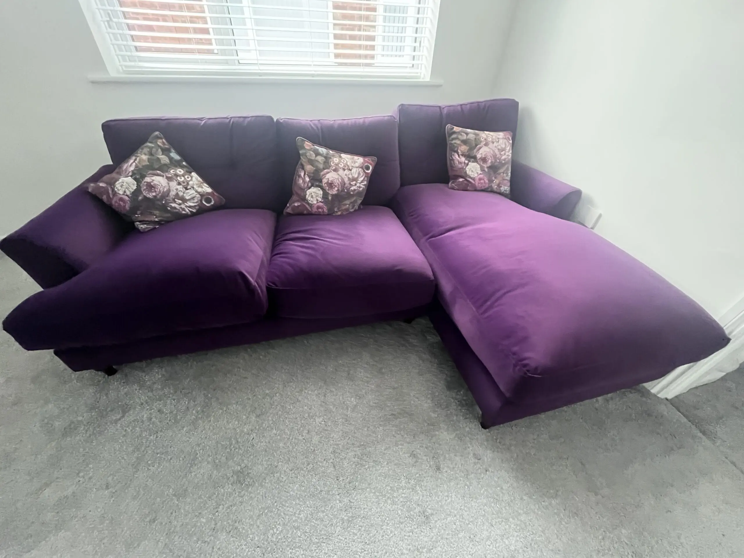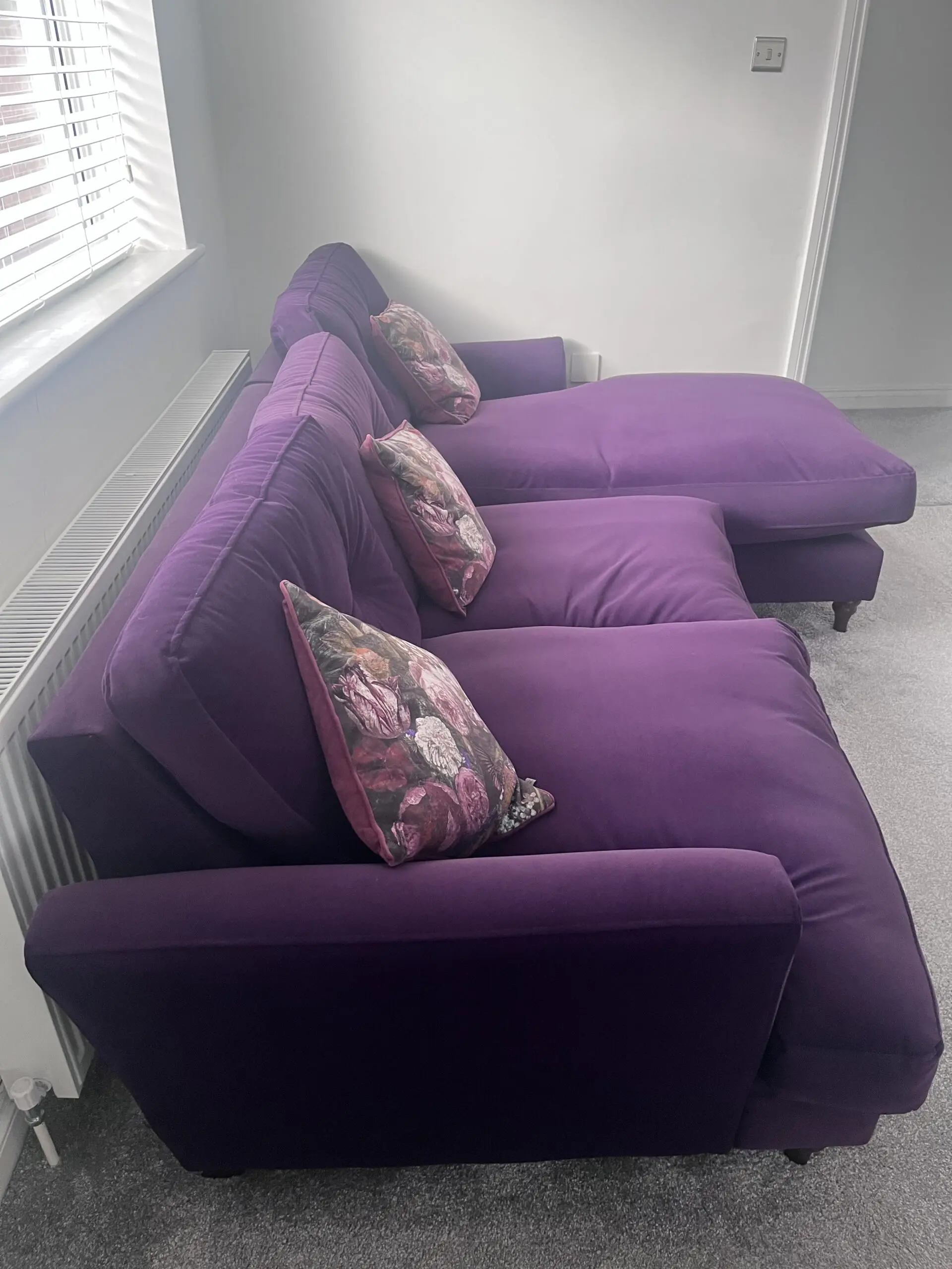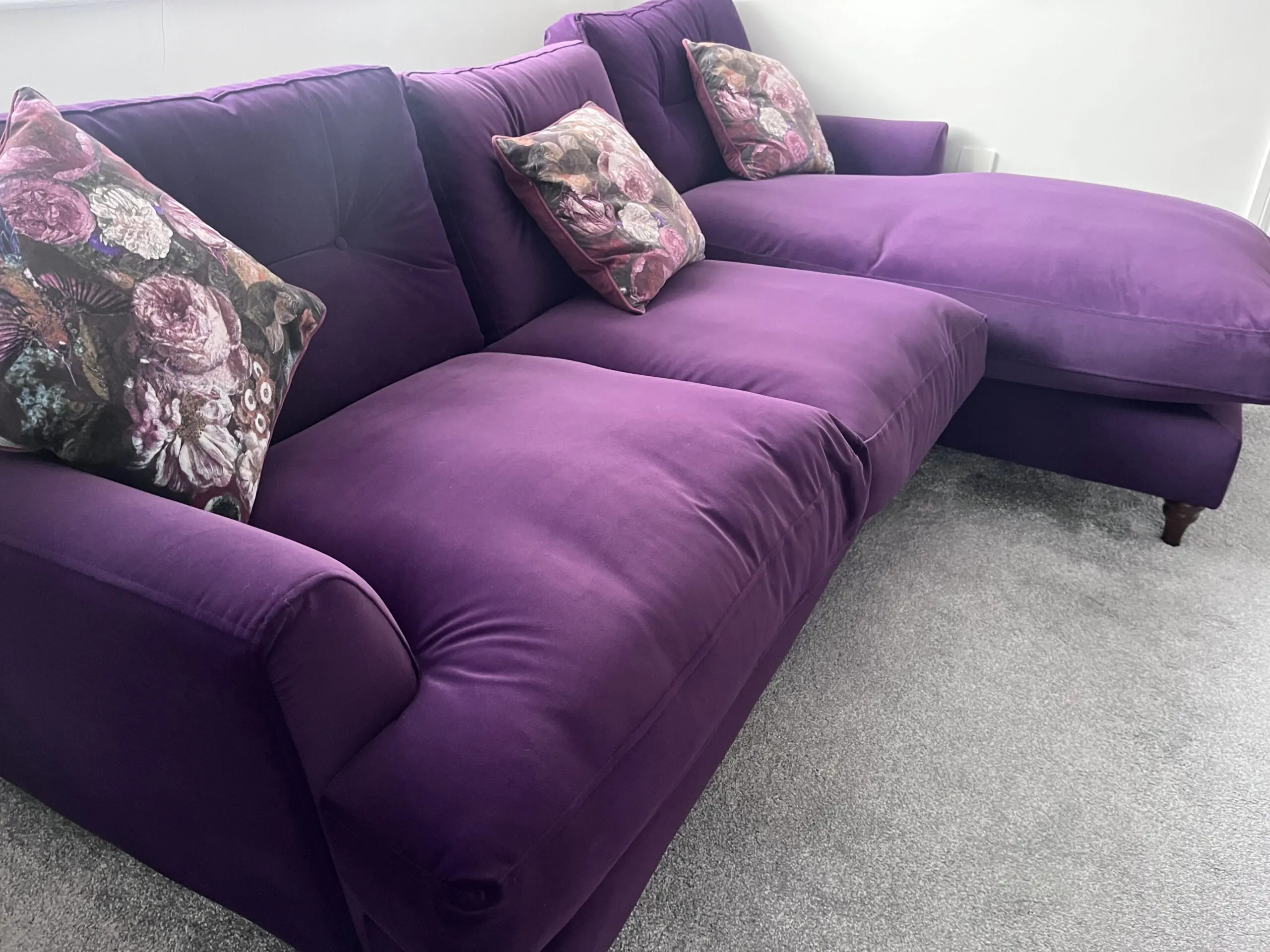 New- From the Joules Range at DFS, Right Hand Corner Sofa in Purple, Walnut Feet.