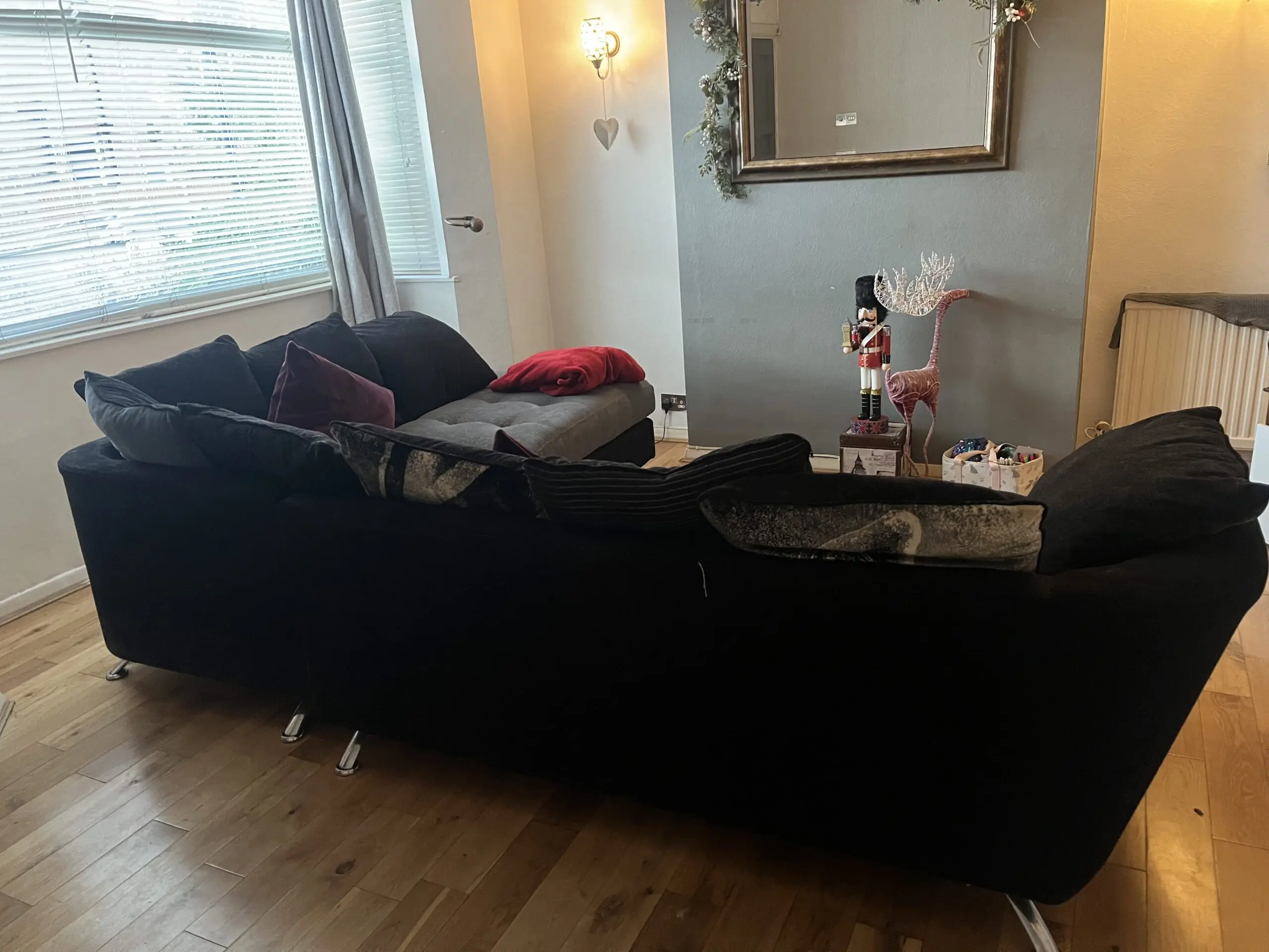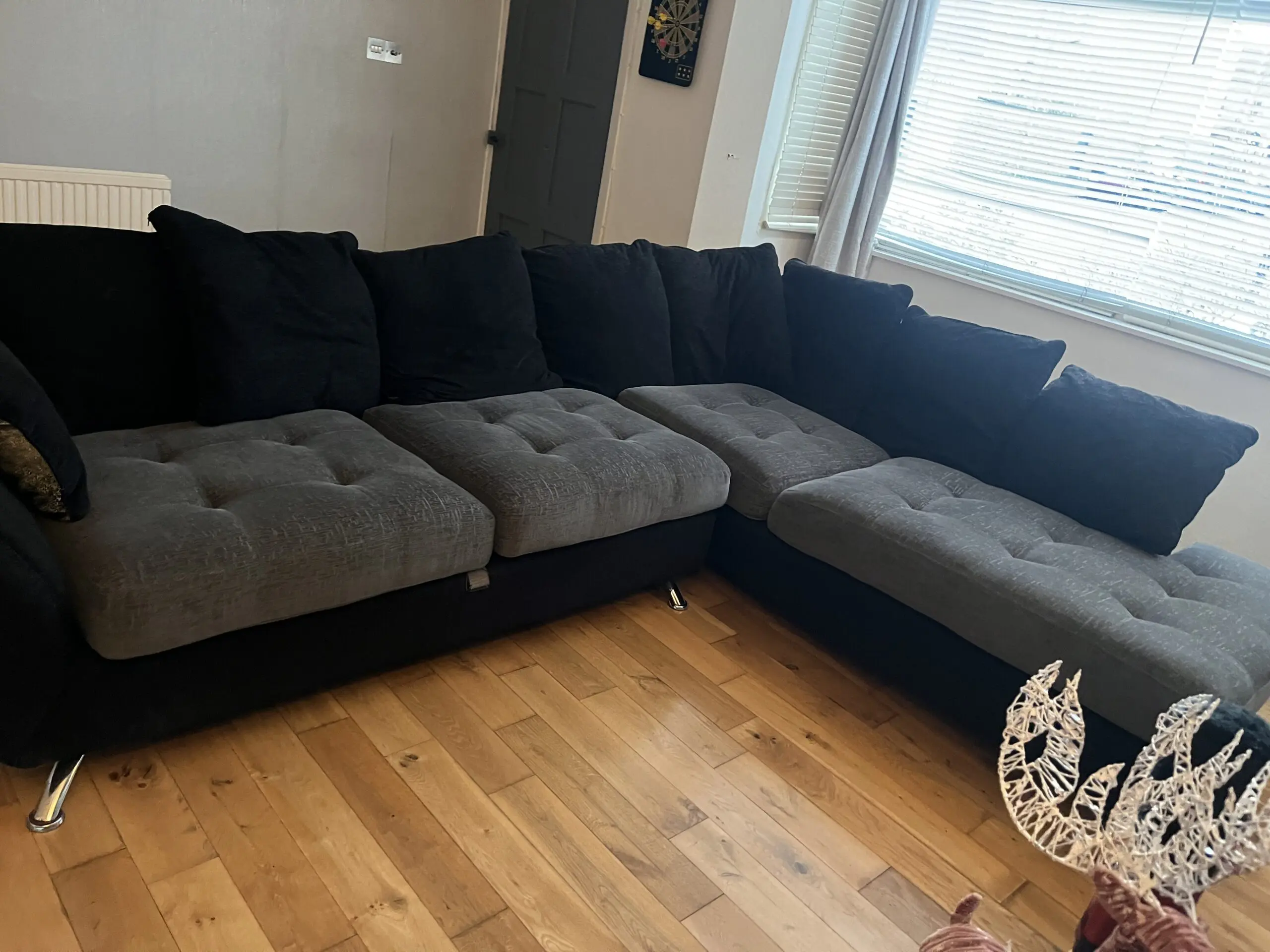 L shape sofa black, it has 9 cushions that are usable both sides, black one side and grey the other