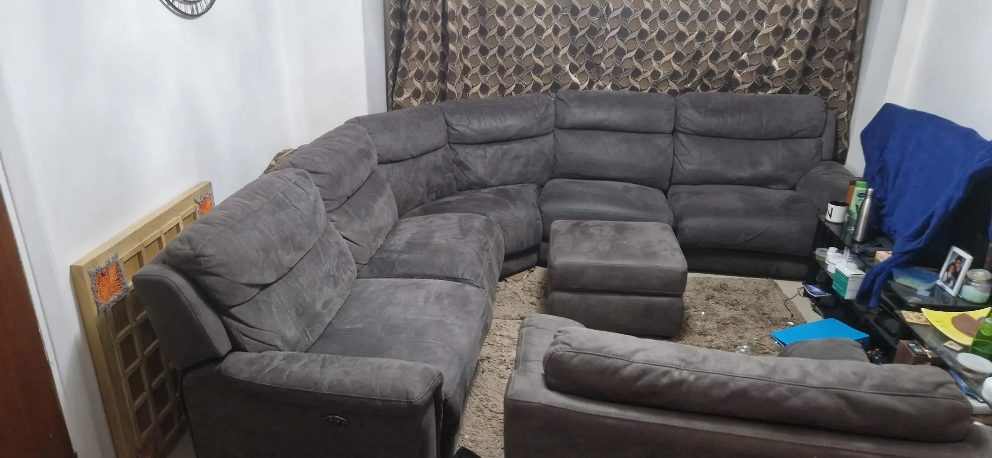 This spacious U-shaped corner sofa offers exceptional seating for the whole family with room for 8+ people across its generous configuration. It has 2 recliners on either end of the corner sofa set and also the single sofa has a recliner setting too. It also has USB ports across each of the recliner button areas. The modular design includes multiple sections and matching footstools, creating the perfect setup for movie nights and entertaining guests. The contemporary style and neutral tone will complement most living room decors beautifully. Ideal for larger living spaces, this substantial piece provides comfortable seating for everyone whilst maintaining an elegant modern appearance.