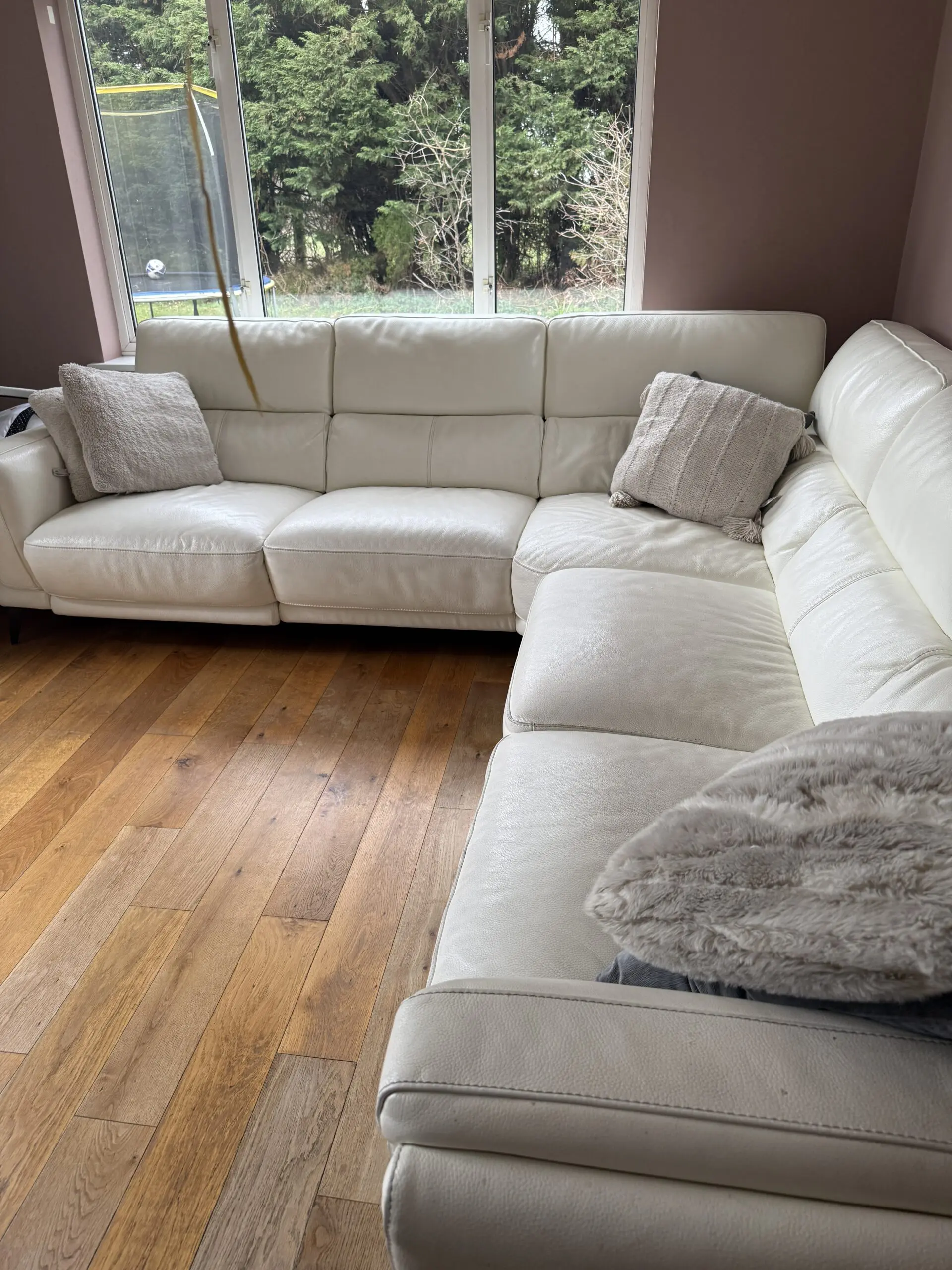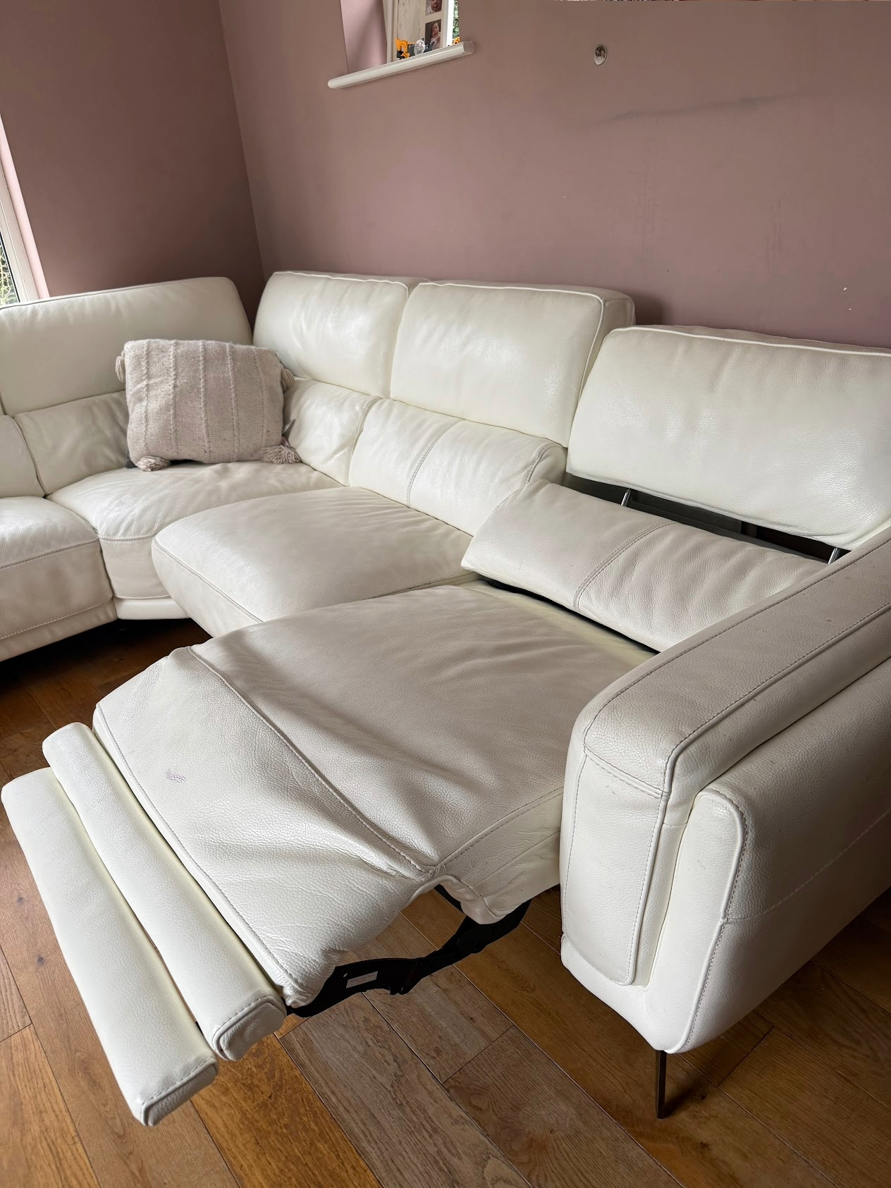 Corner sofa in snow colour – 6 seater with recliner at both ends.