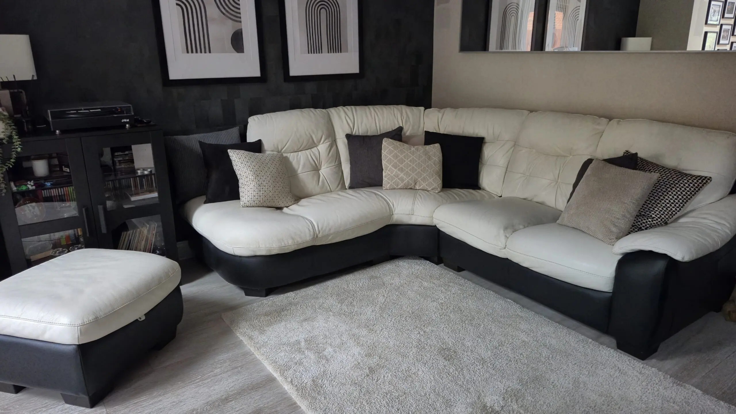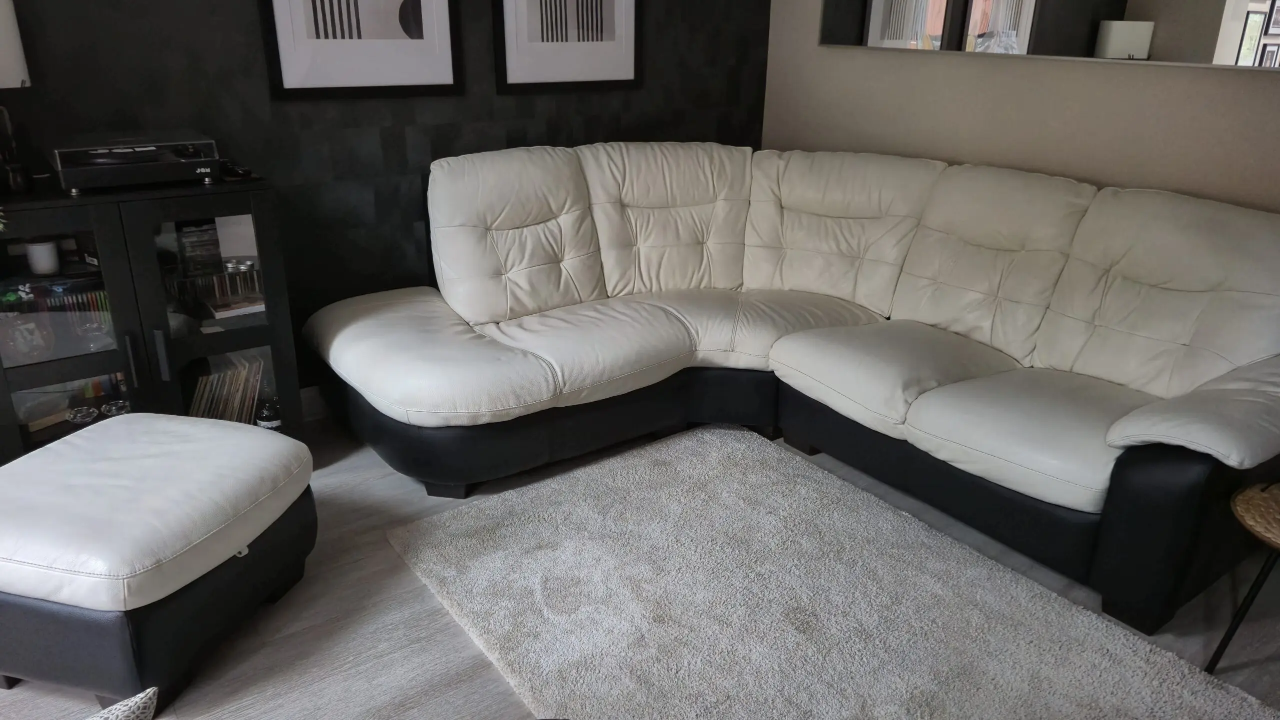 It has been well looked after but does have some signs of wear on the leather which you can see in the pics. The chaise has a bit of a dip in it but is still super comfy. A little stitching has come open behind a cushion but you cant see…its small and at the back. Its easy to clean and has many years left. Storage footstool included.