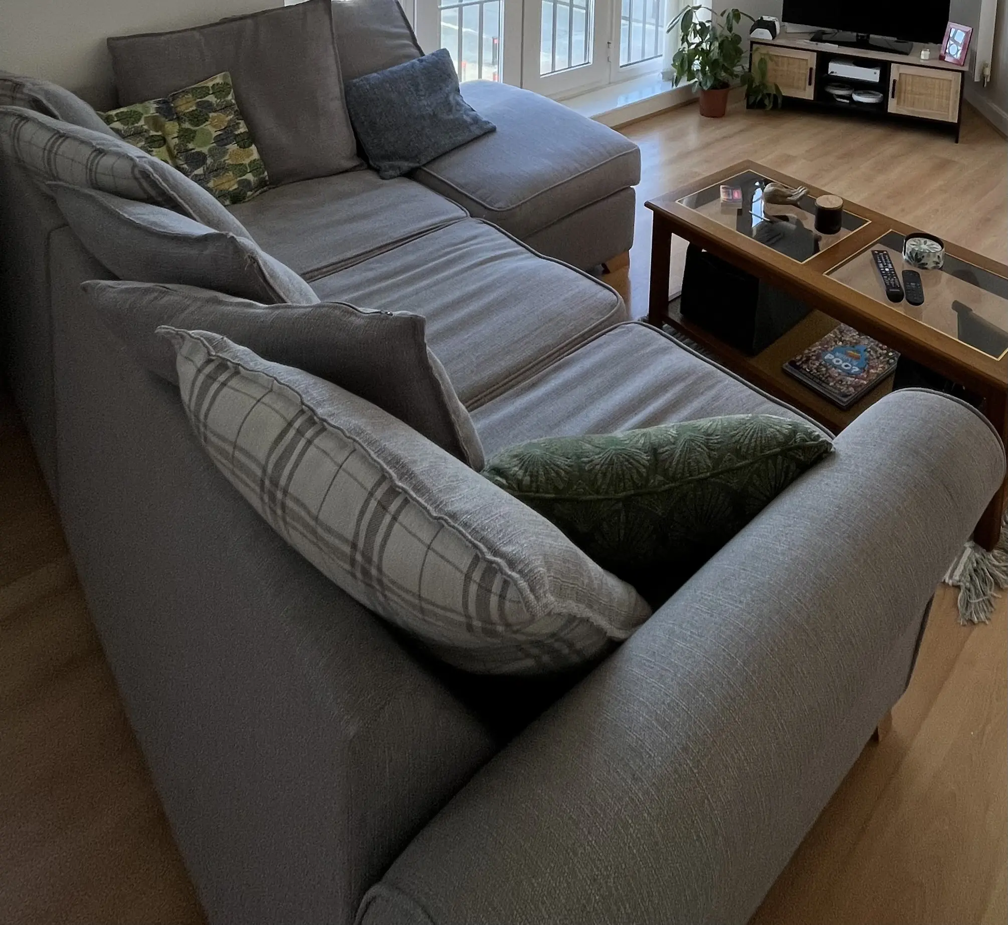 Fairly used corner sofa but no rips in the actual sofa only in the netting underneath. Good condition, smoke and pet free home. Separates and is separates into two pieces