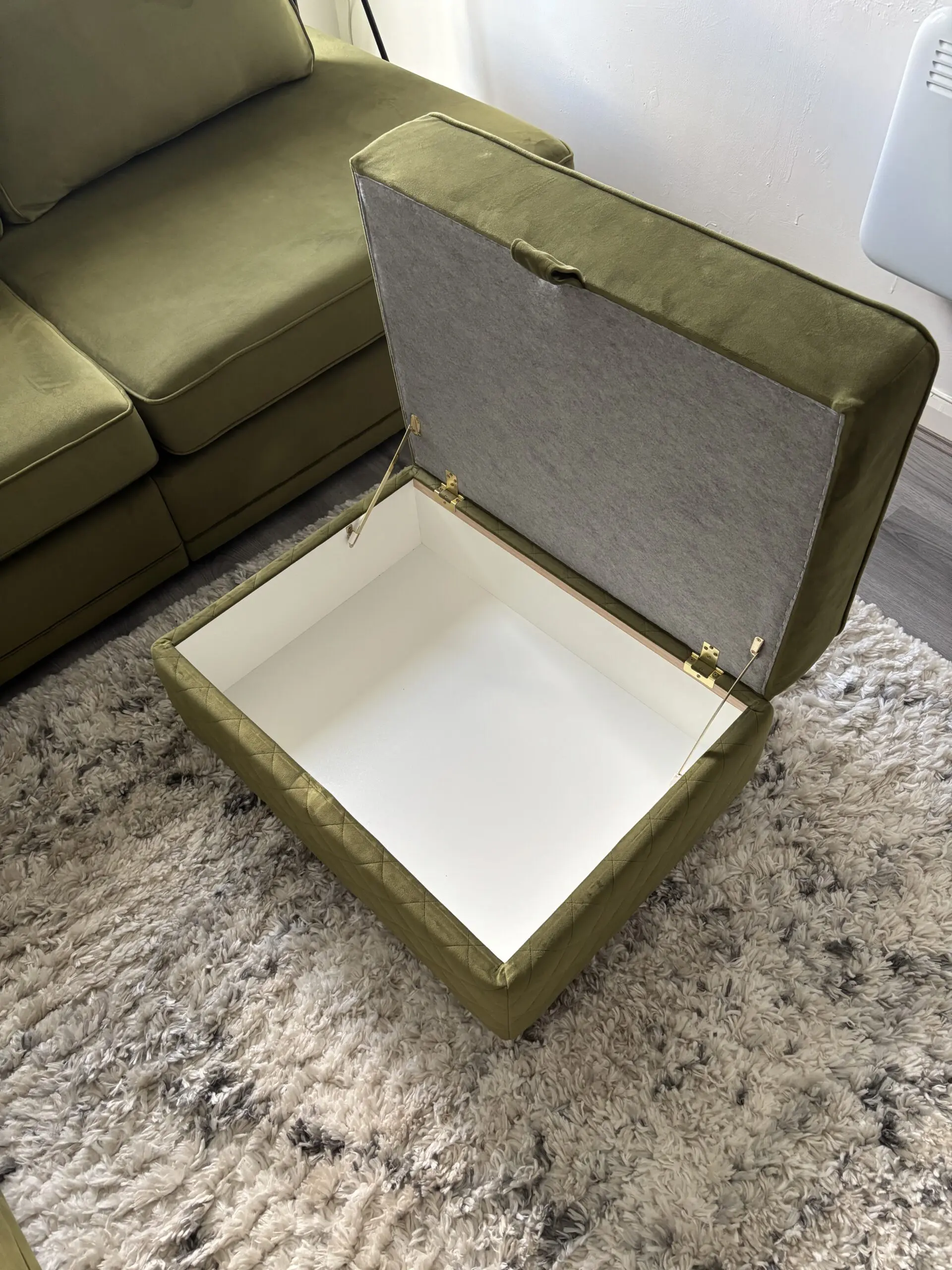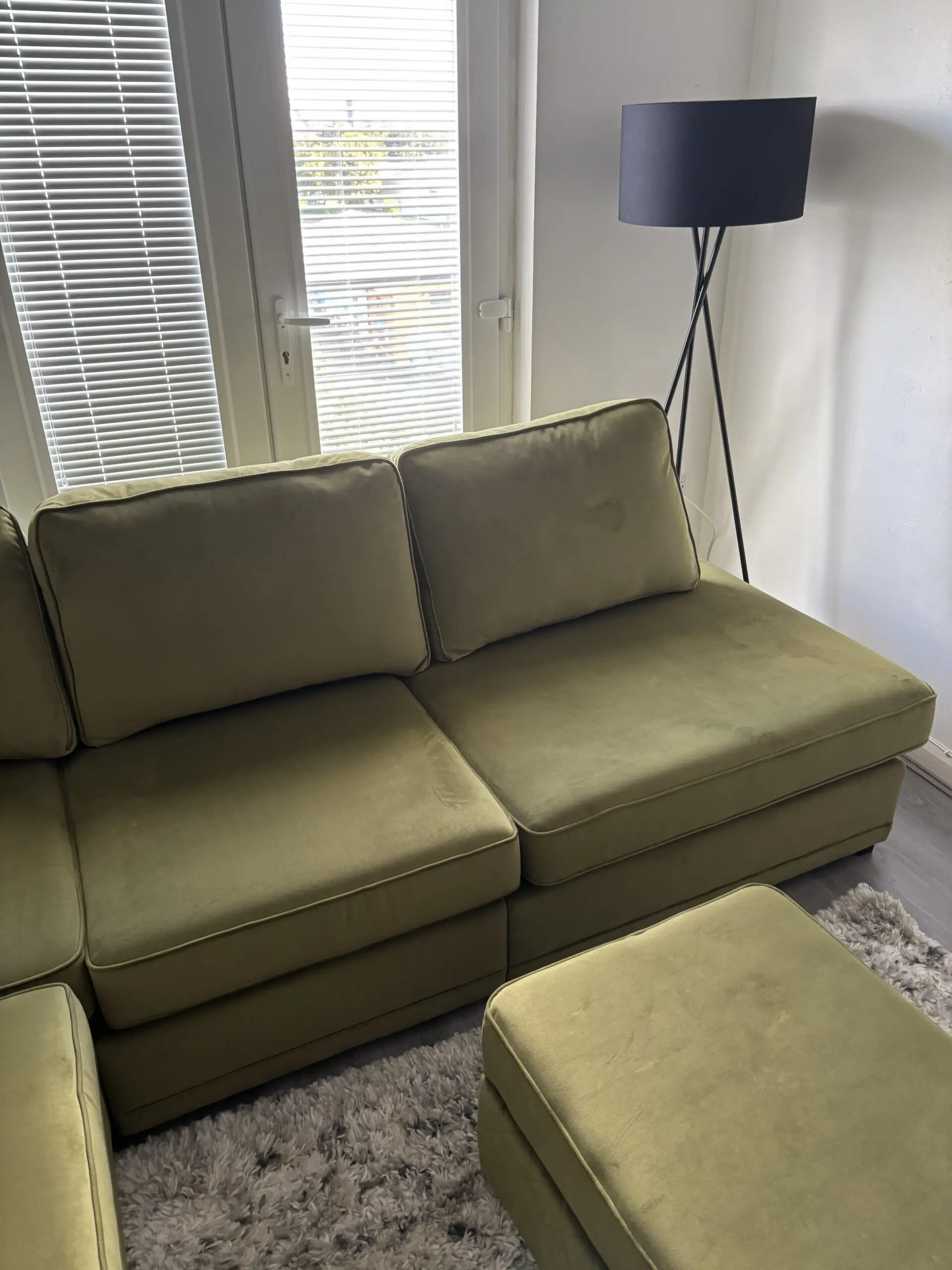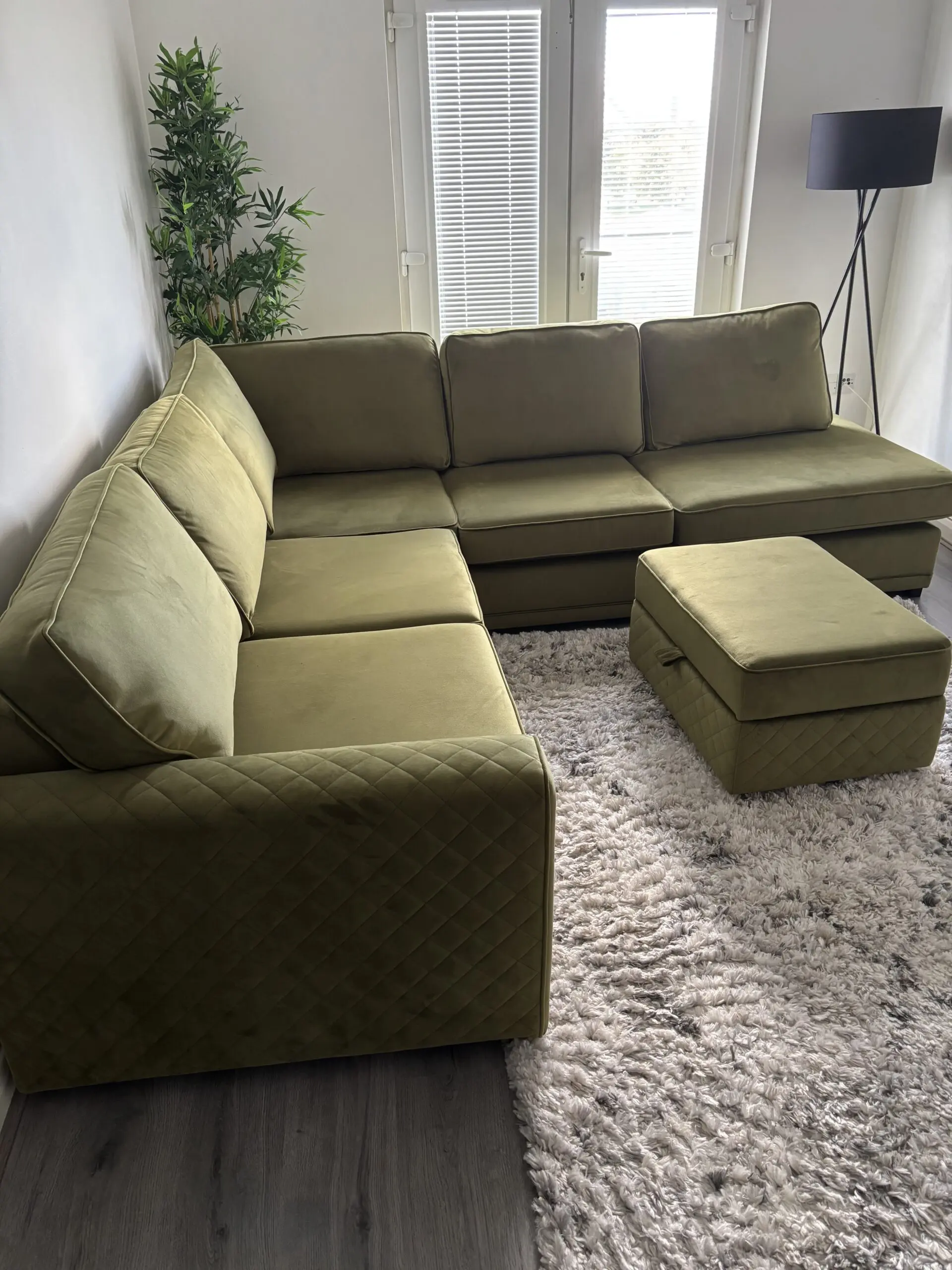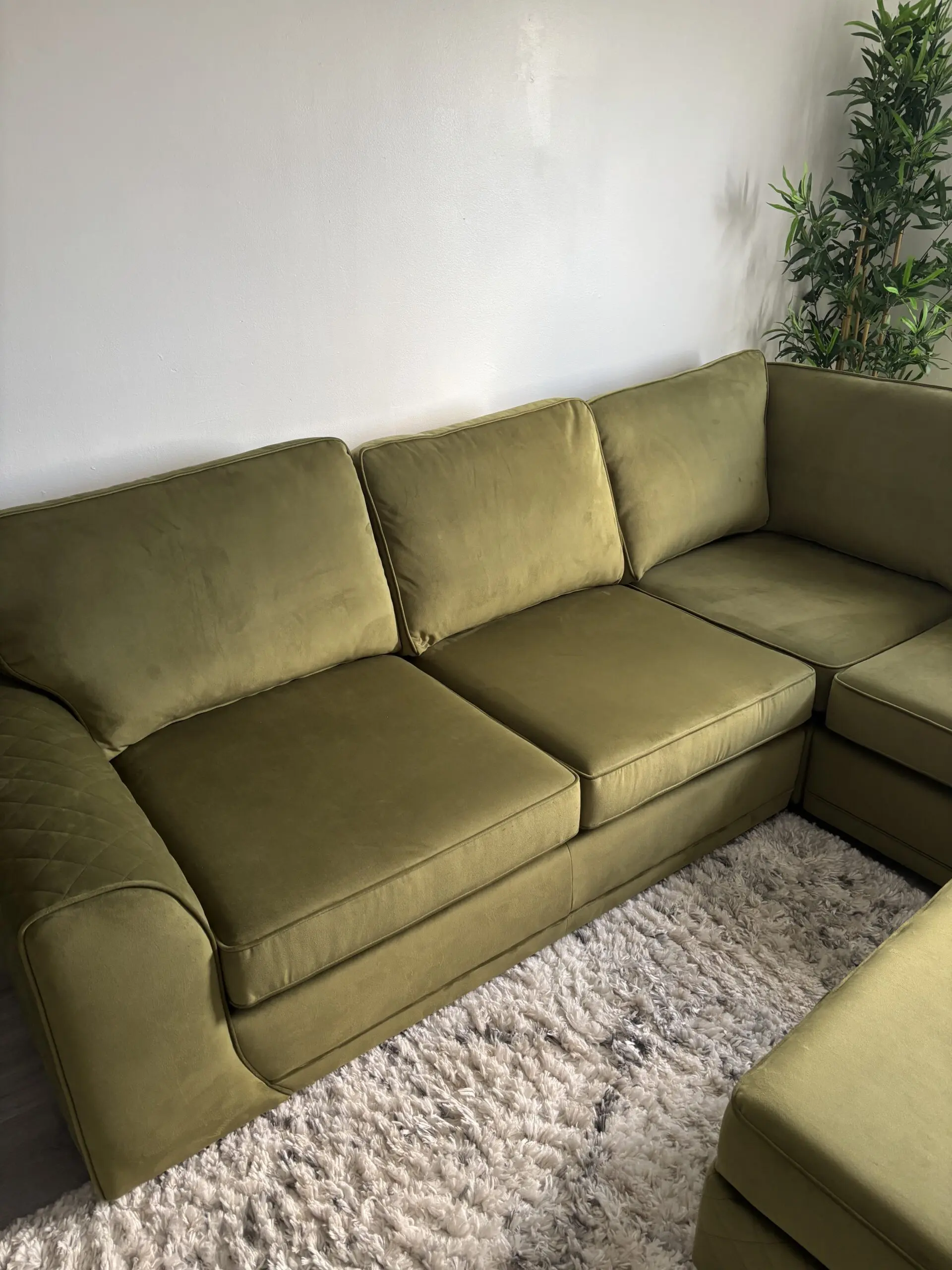 3seater and 3 seater corner sofa with storage footstool. Velvet olive green material. The width is same on both sides. You can check the DFS Website. I had them since August 2025
