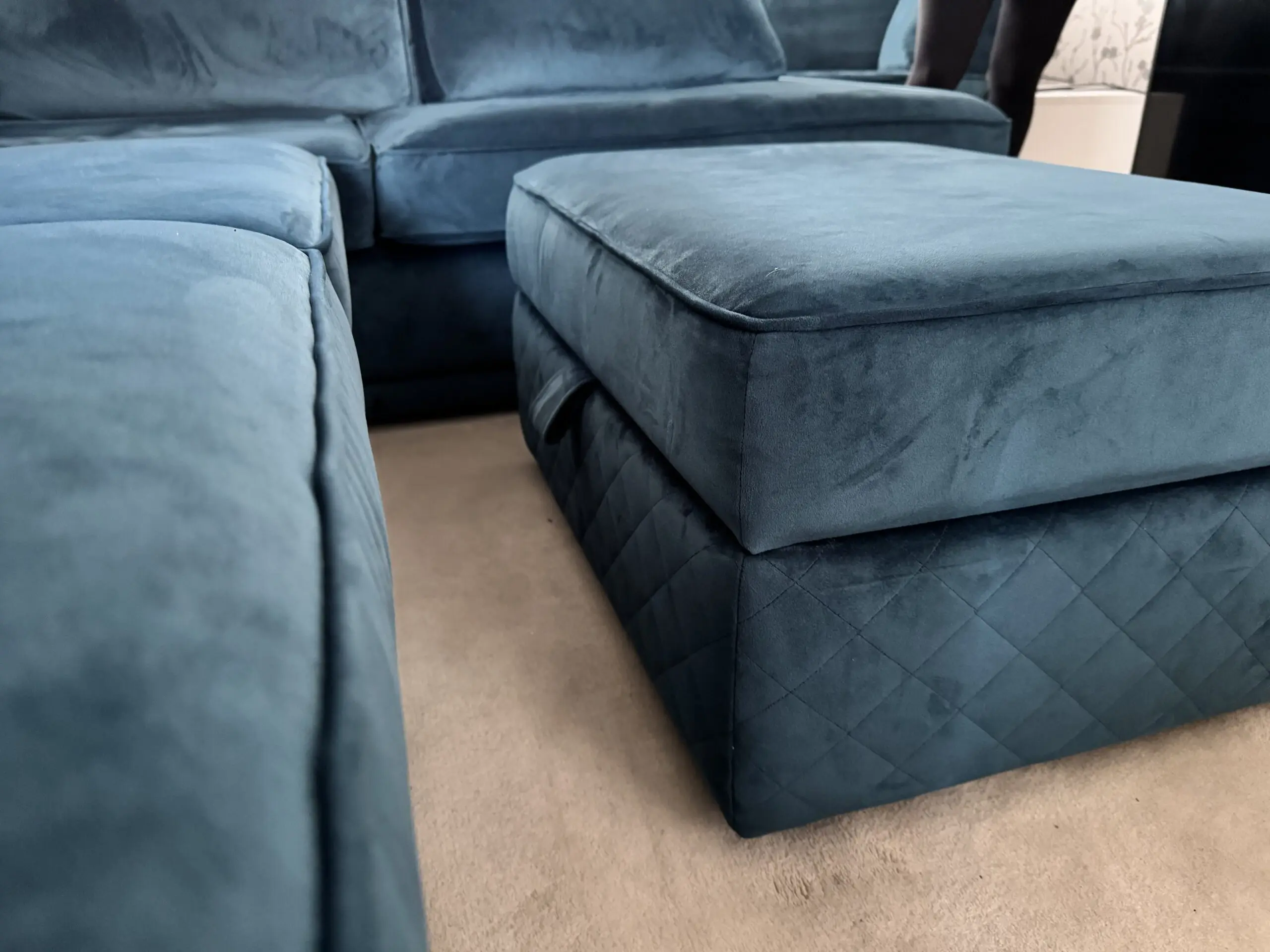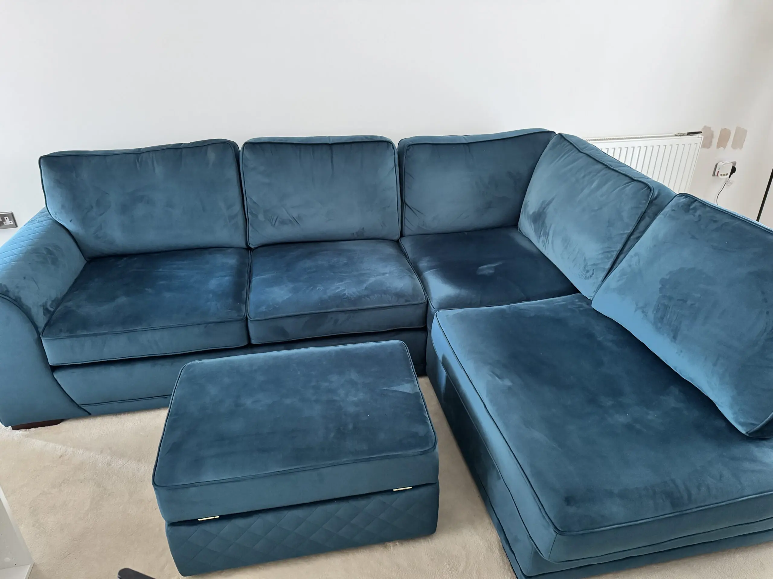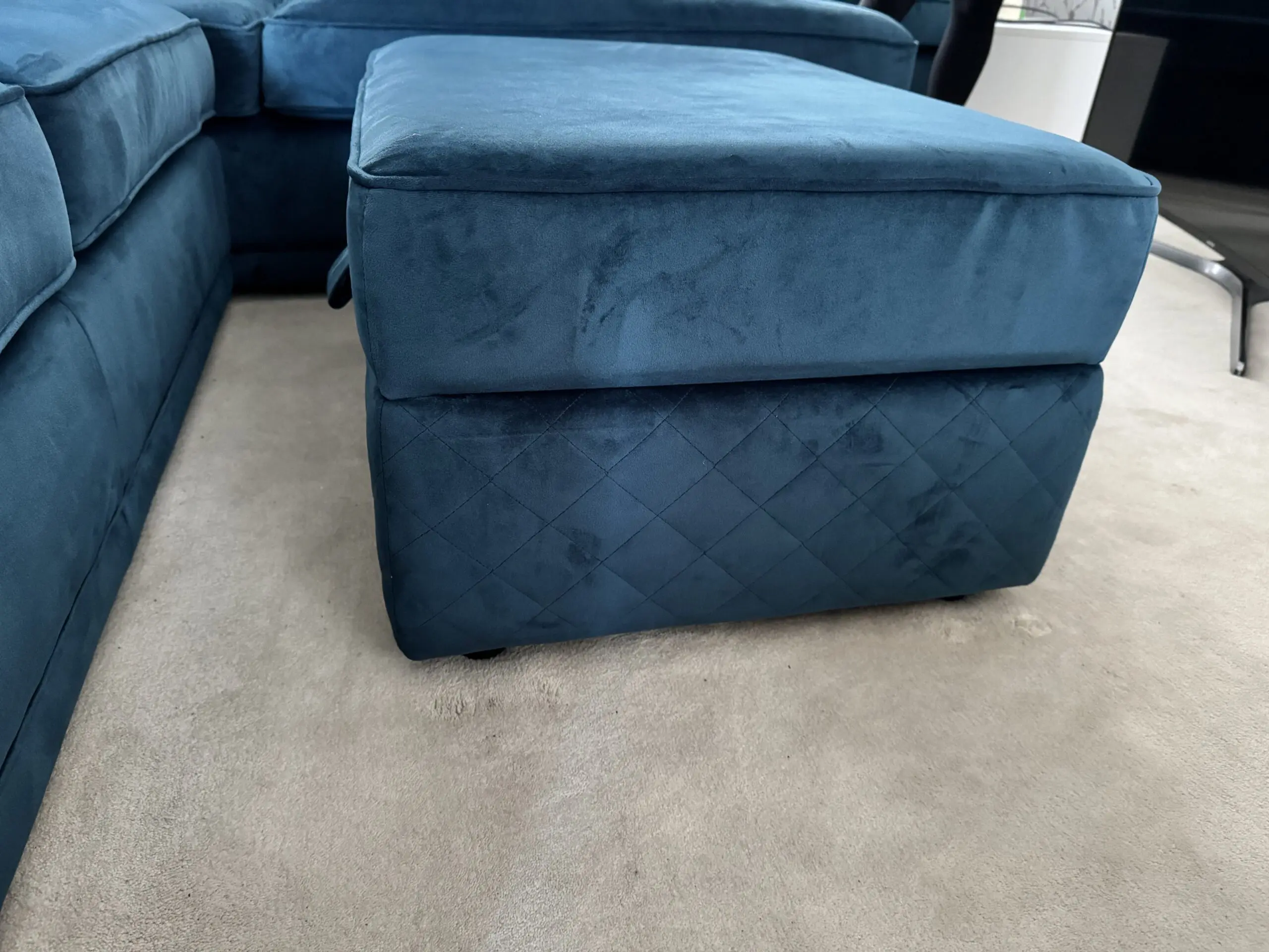 A set of 3 of the Blue Velvet DFS Orka range including a Blue Velvet Orka Left Hand Facing Arm Open End Corner Sofa, A Large Blue Velvet Orka Swivel Chair + The Matching Large Velvet Hinged Blue Footstool with Storage compartment.