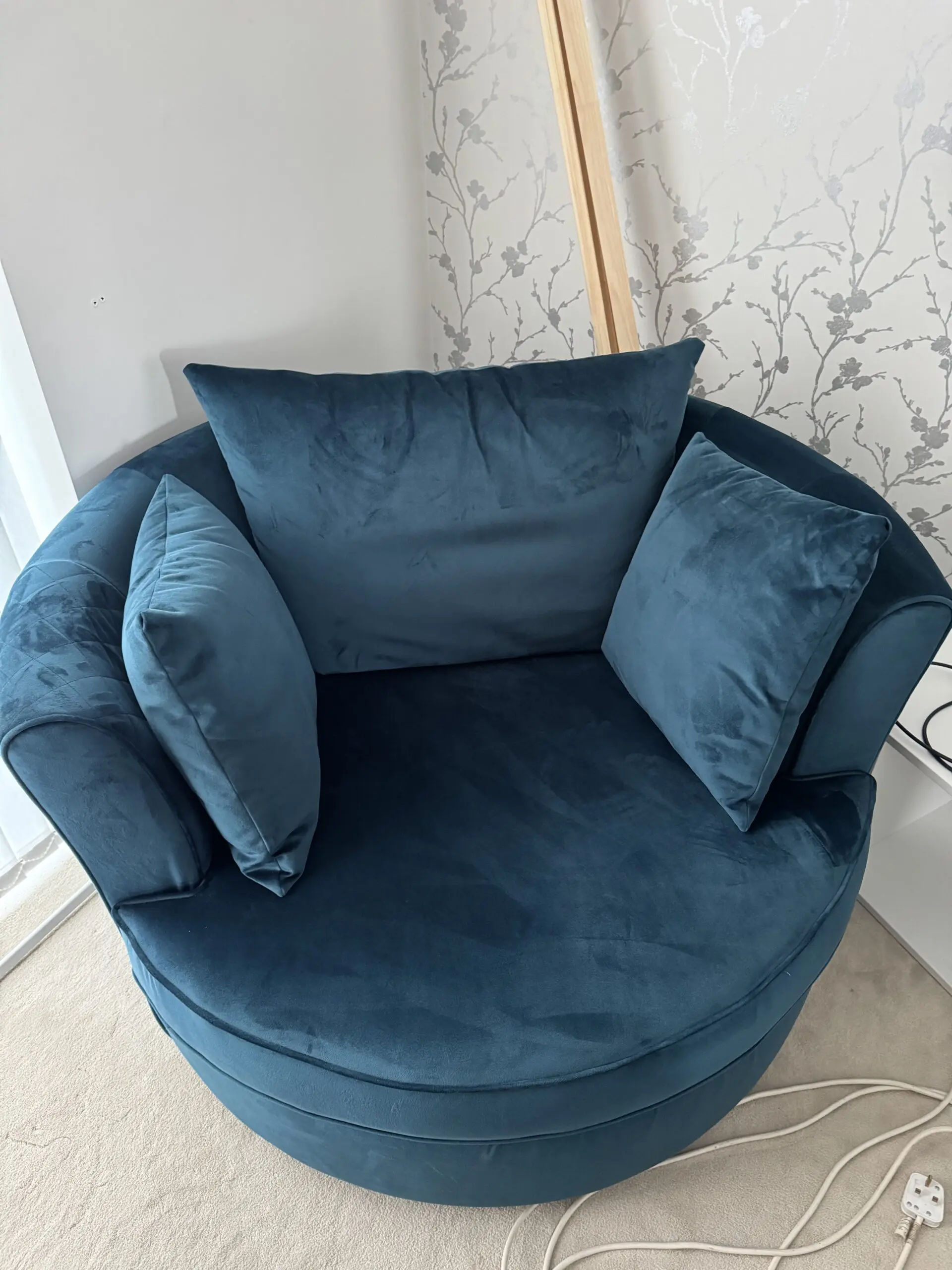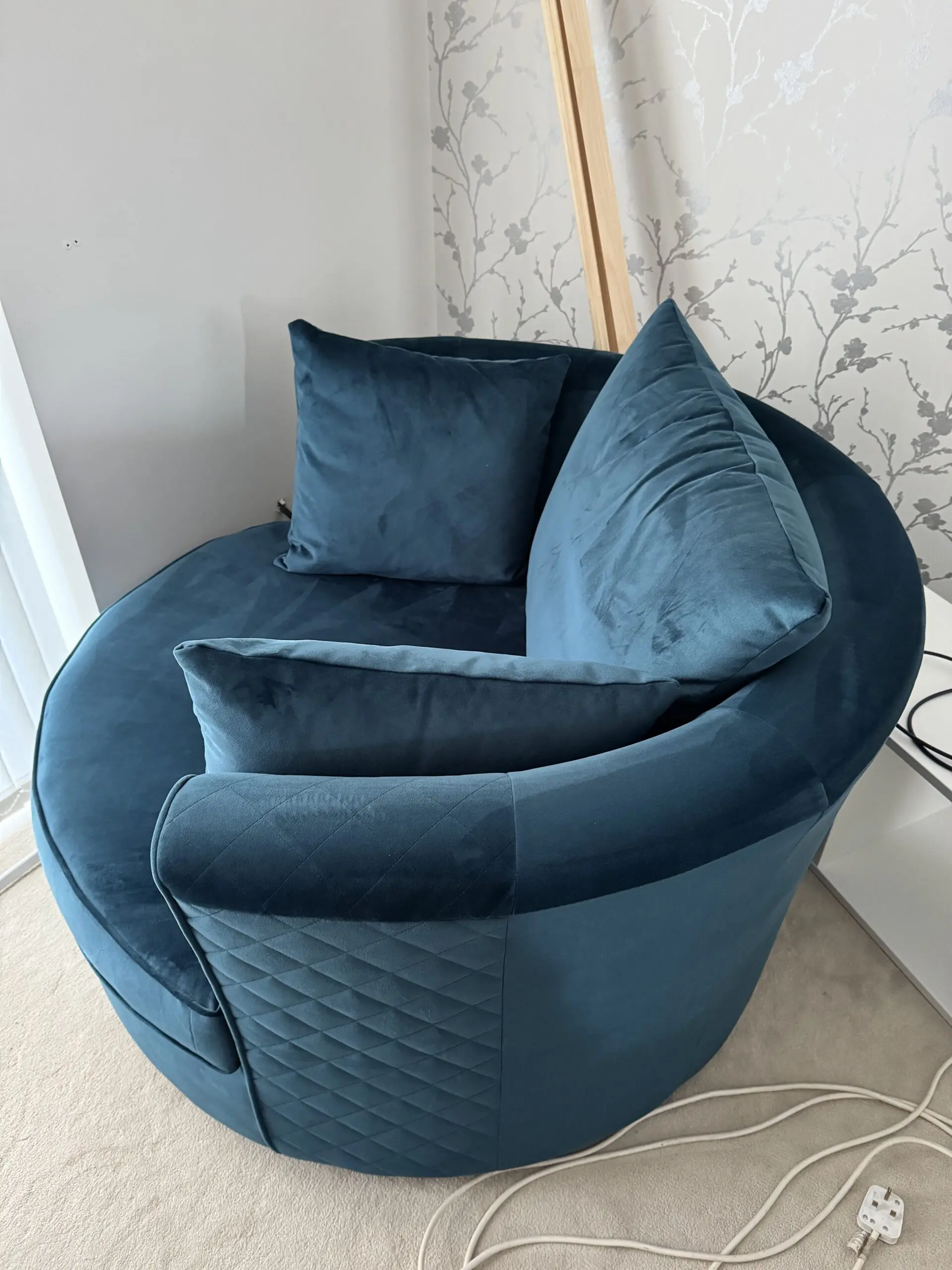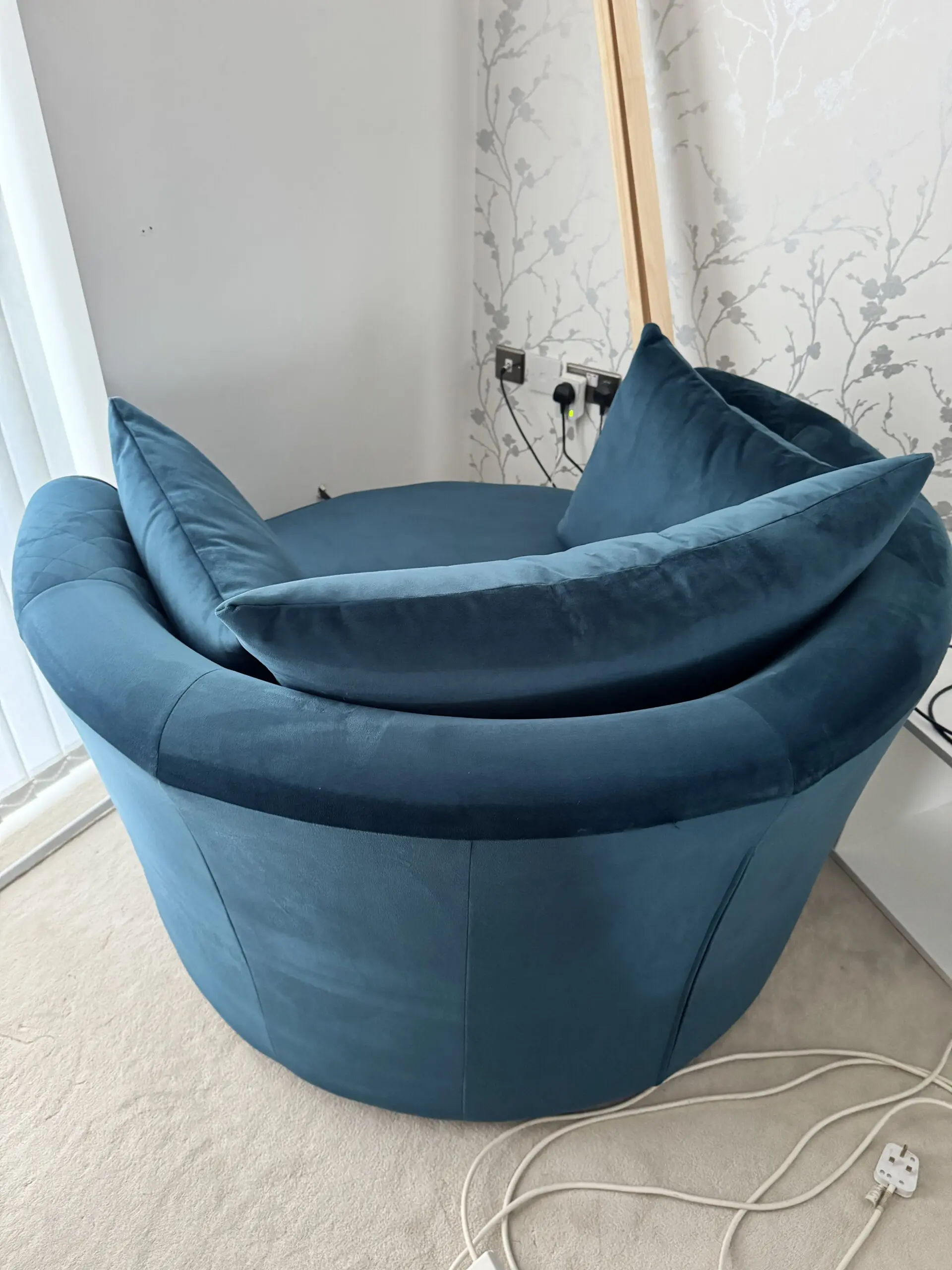 A set of 3 of the Blue Velvet DFS Orka range including a Blue Velvet Orka Left Hand Facing Arm Open End Corner Sofa, A Large Blue Velvet Orka Swivel Chair + The Matching Large Velvet Hinged Blue Footstool with Storage compartment.