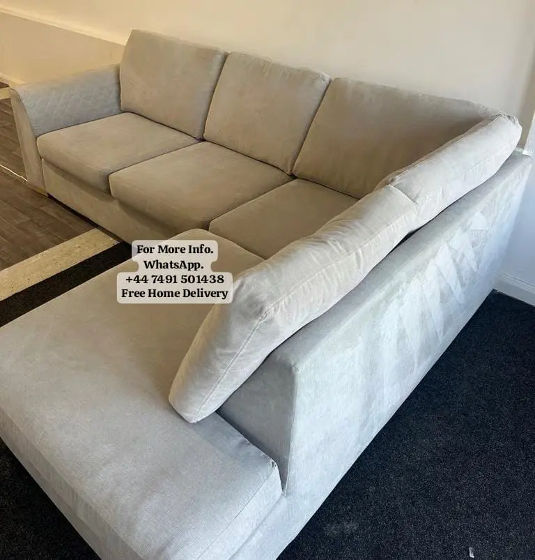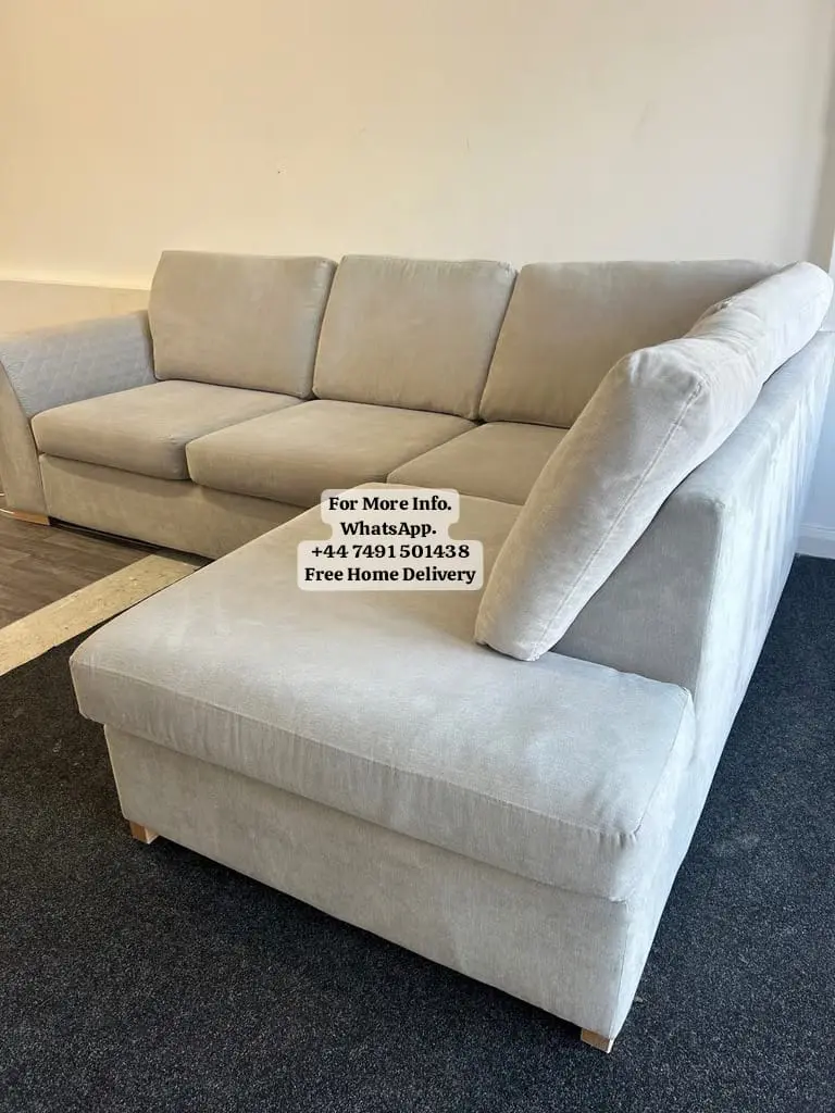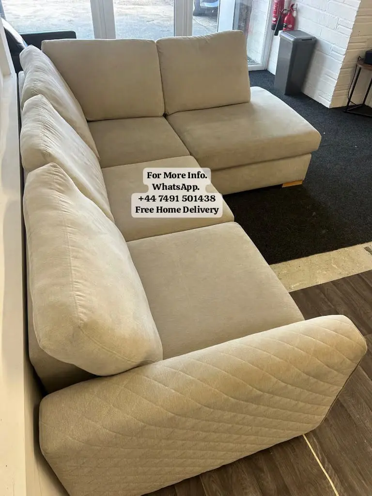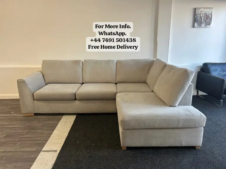 An amazing DFS corner sofa from their ‘Orka’ range. This sofa has been upholstered in a Beige fabric. The set has foam seat cushions and fibre filled back and side cushions.
