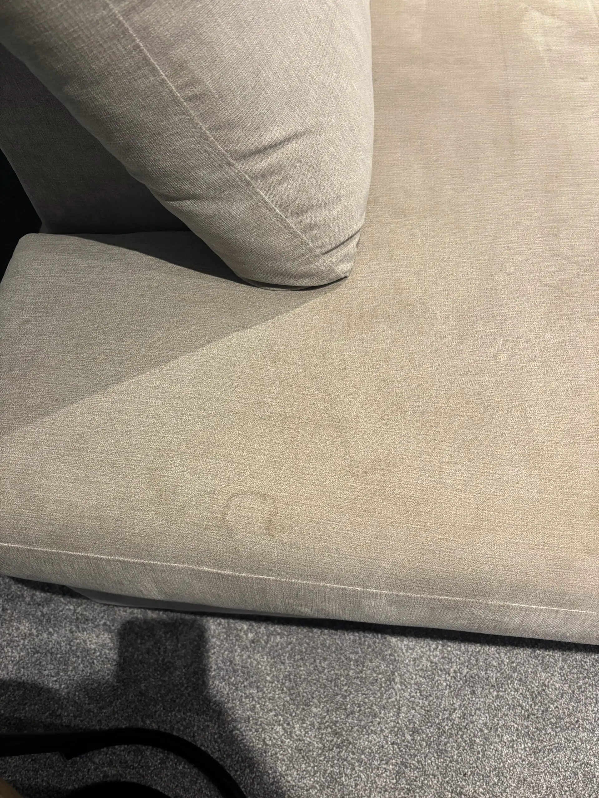 Sofa has been looked after but has some minor stains from general use. These are only to the edge seat. Most noticeable in light. Have been wiped but potentially could come clean with professional machine/clean.