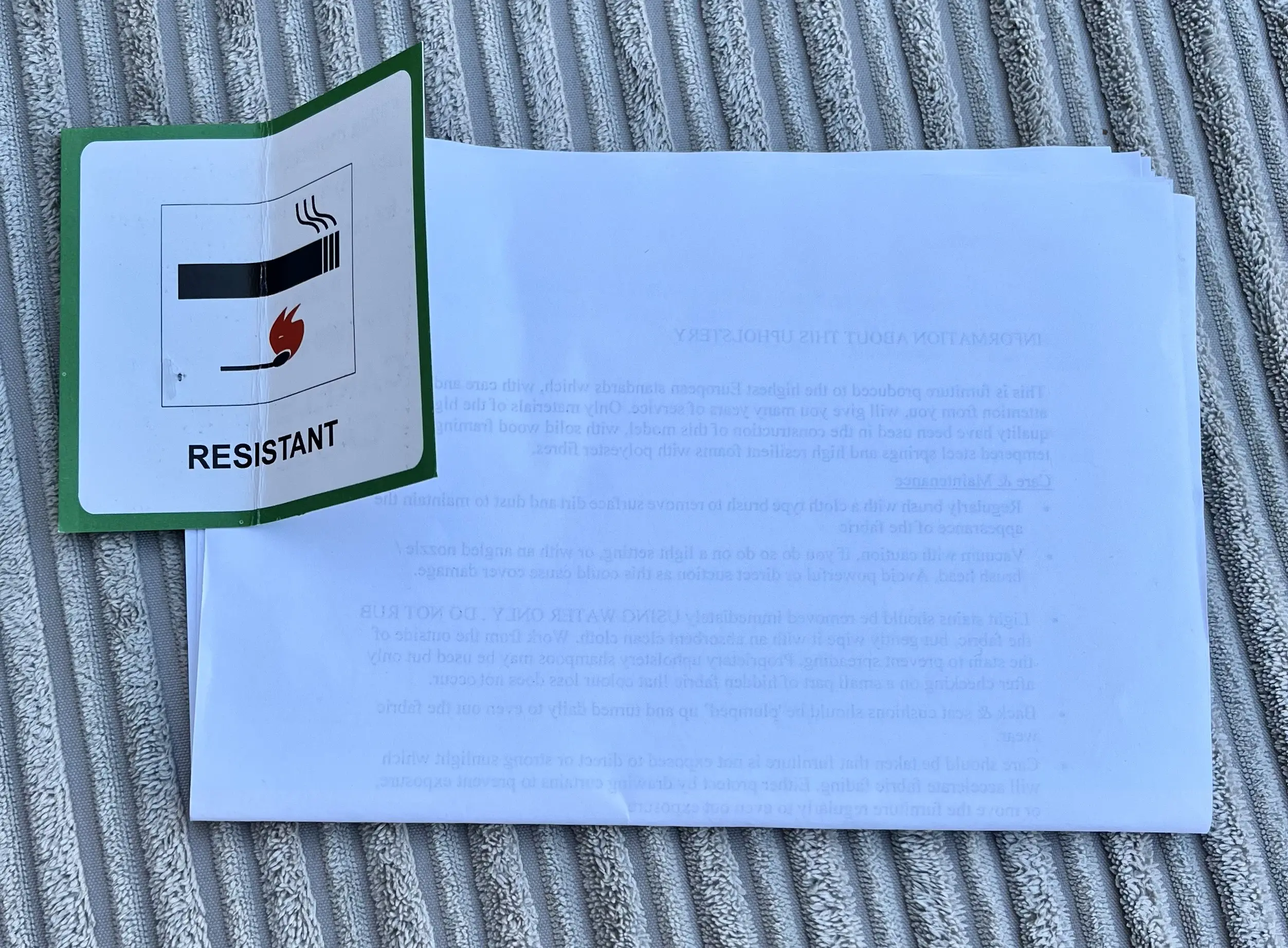 Fabric is soft jumbo cord features oversized ribbed channels that offer great comfort and practicality. Seat padding is foam and feet are light wood.