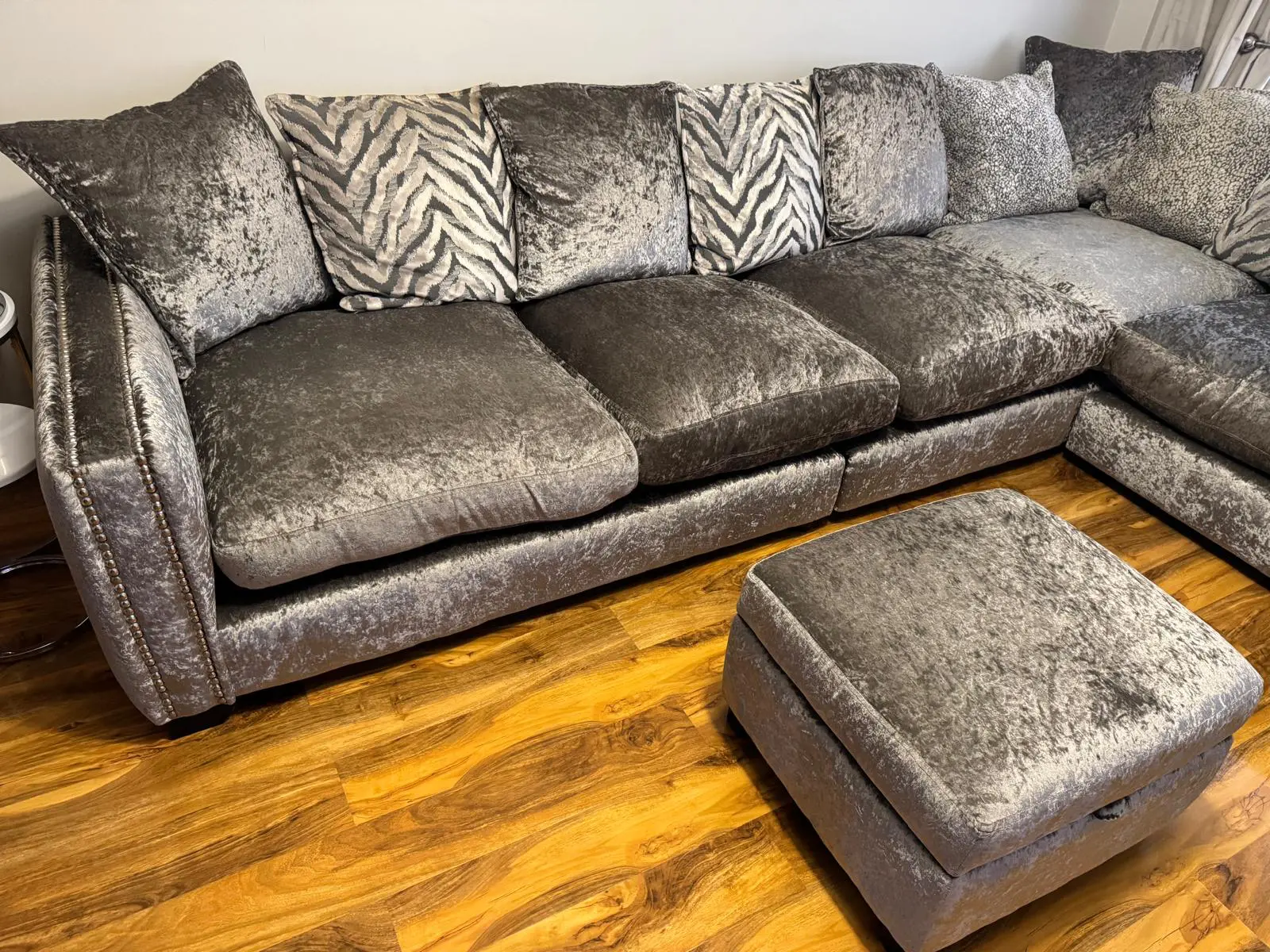 DFS silver grey crushed velvet with a two seat section and a three seat section, but there is a single seat in the three section that can be removed altogether to make a two and two instead. The corner section is singular and the other sections connect at the bottom into each other. There is silver studded detailing on the arms and has dark removeable feet. There are 13 scatter cushions with different designs and the main seat cushions have the extra padding in to hold their shape and there is also a lift up foot pouffe to match.