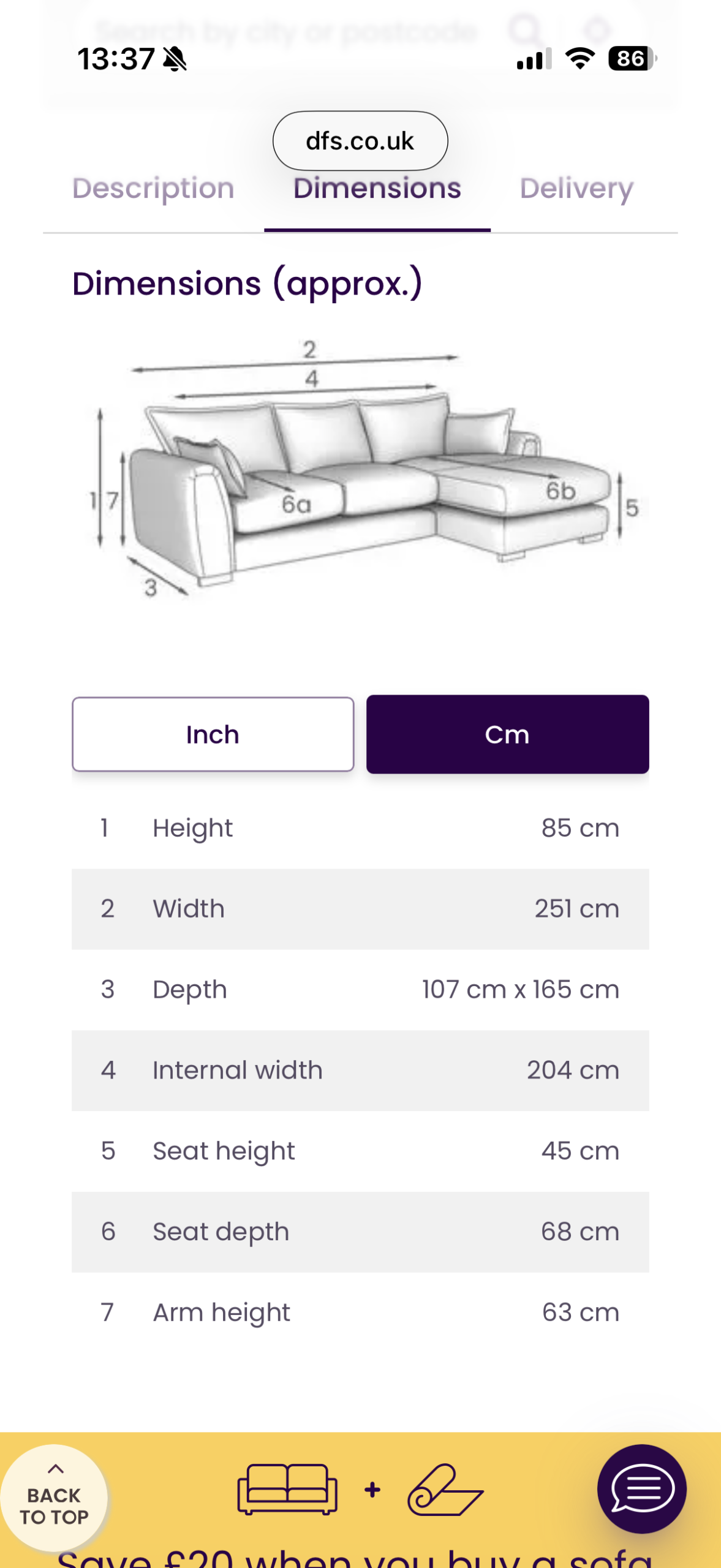 Sizes as per dfs pics 251cm x 165cm at the longest chaise point and 107cm deep for the rest