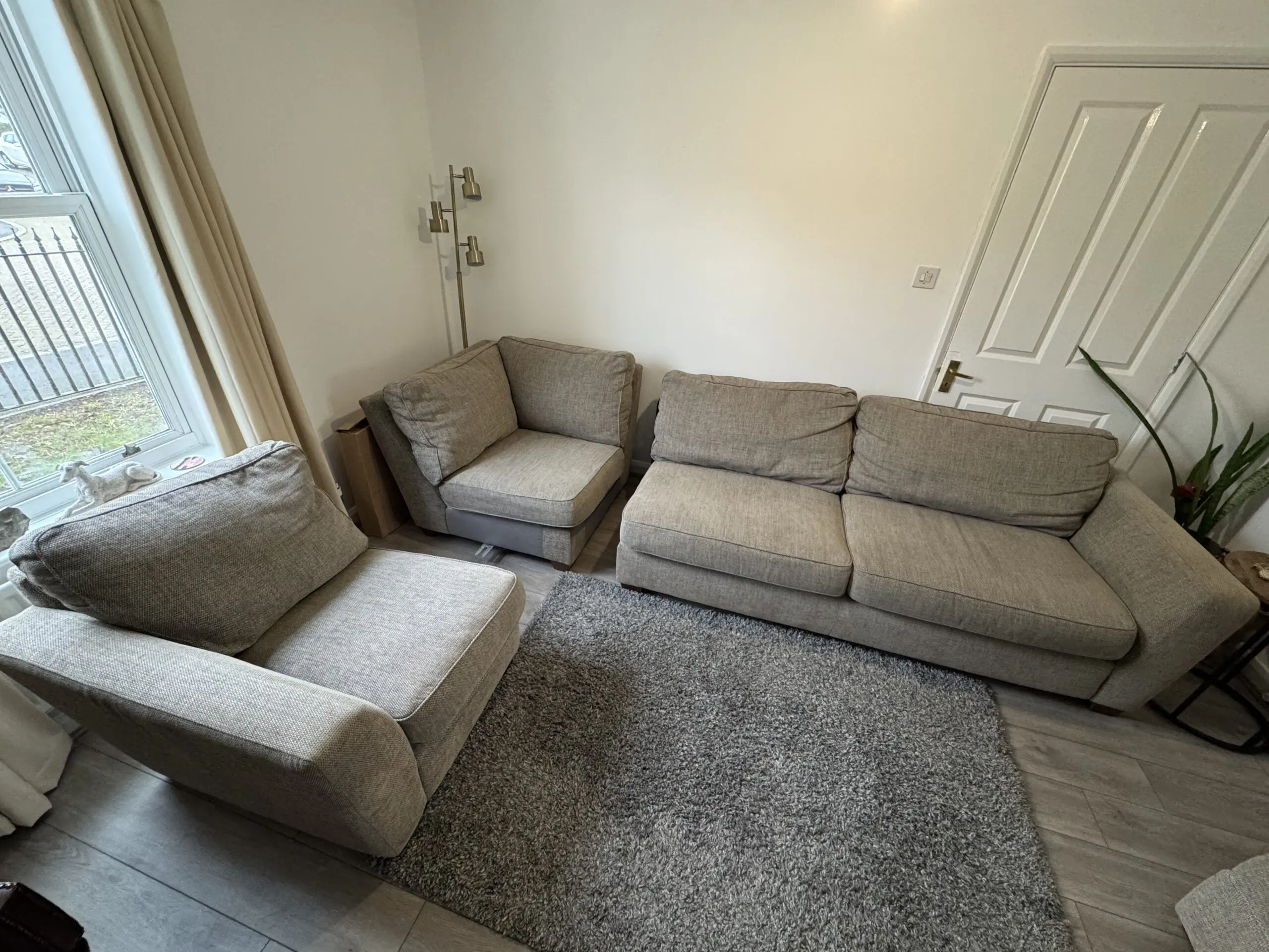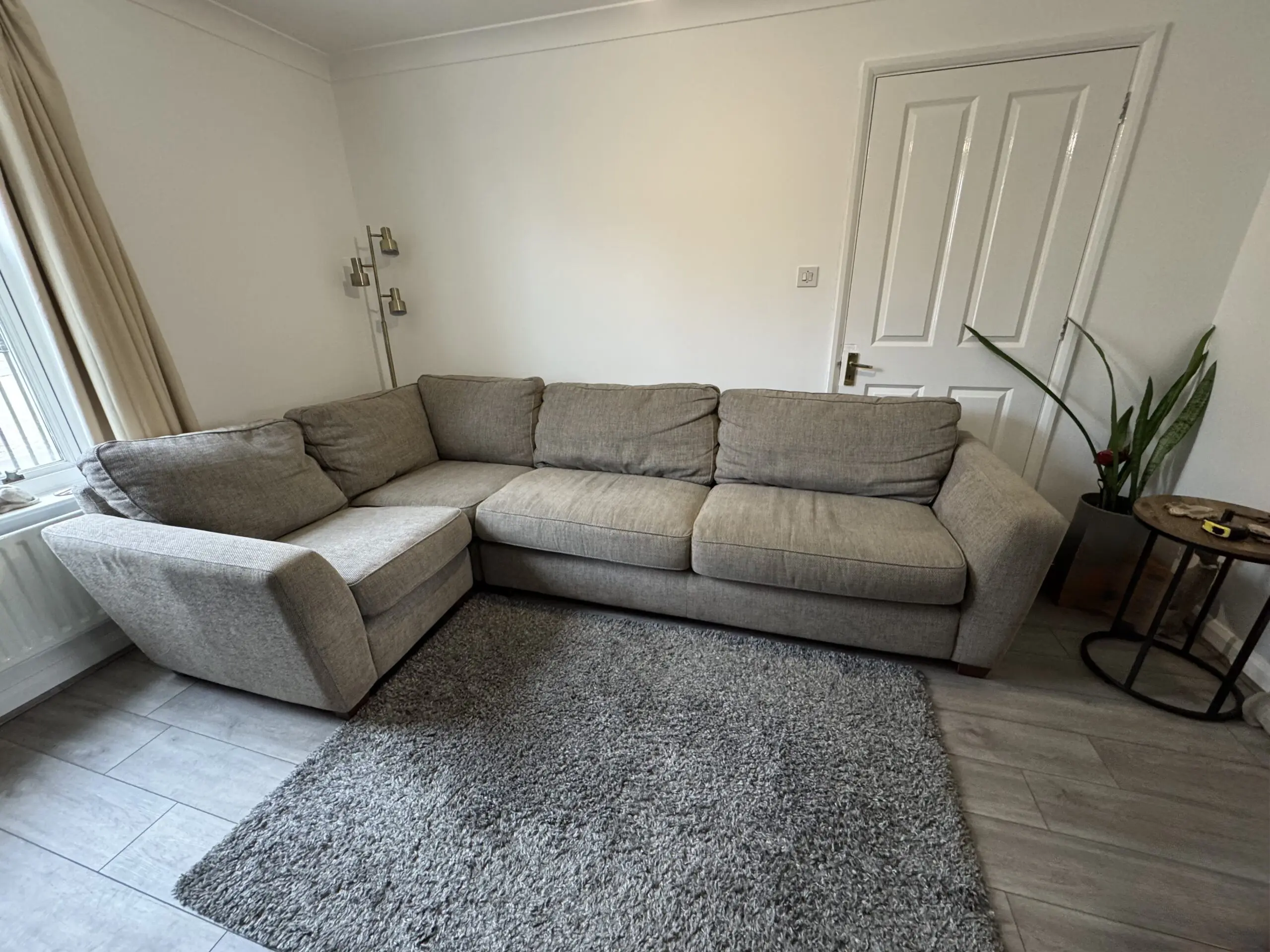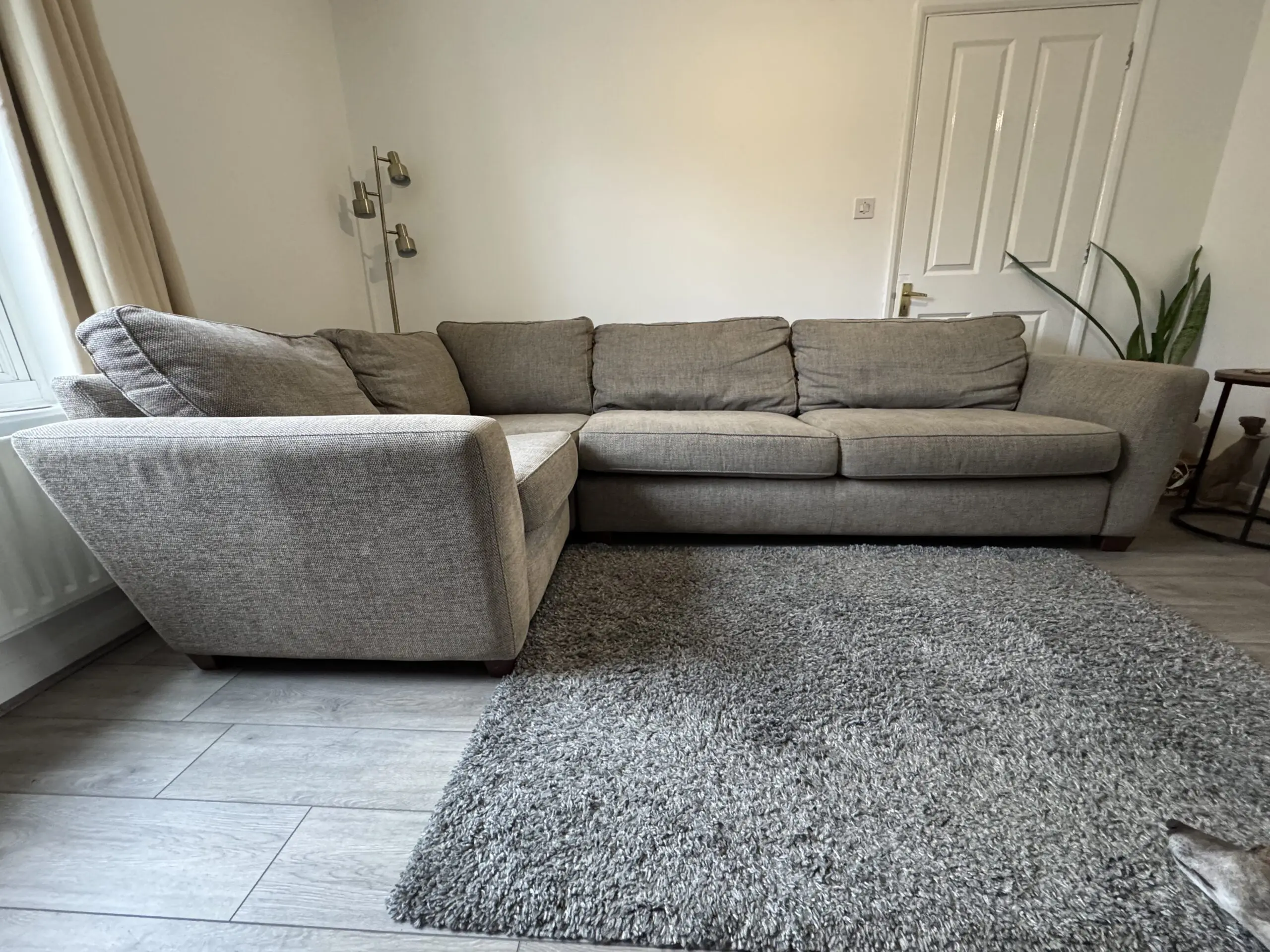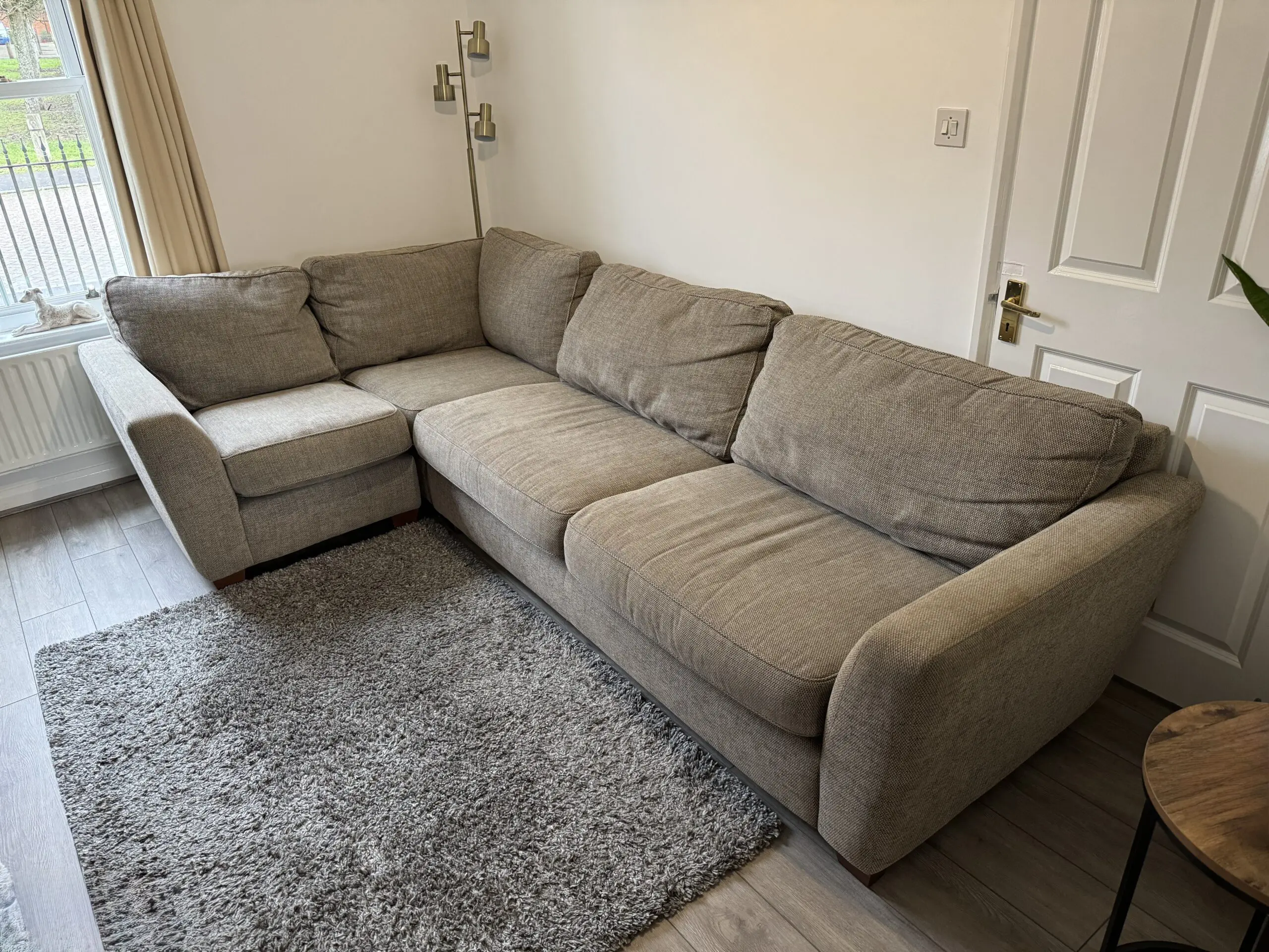 DFS Sophia range, right hand corner sofa in mocha colour with dark wood feet. Breaks down into 3 sections. Fully functioning, minor stains through use.