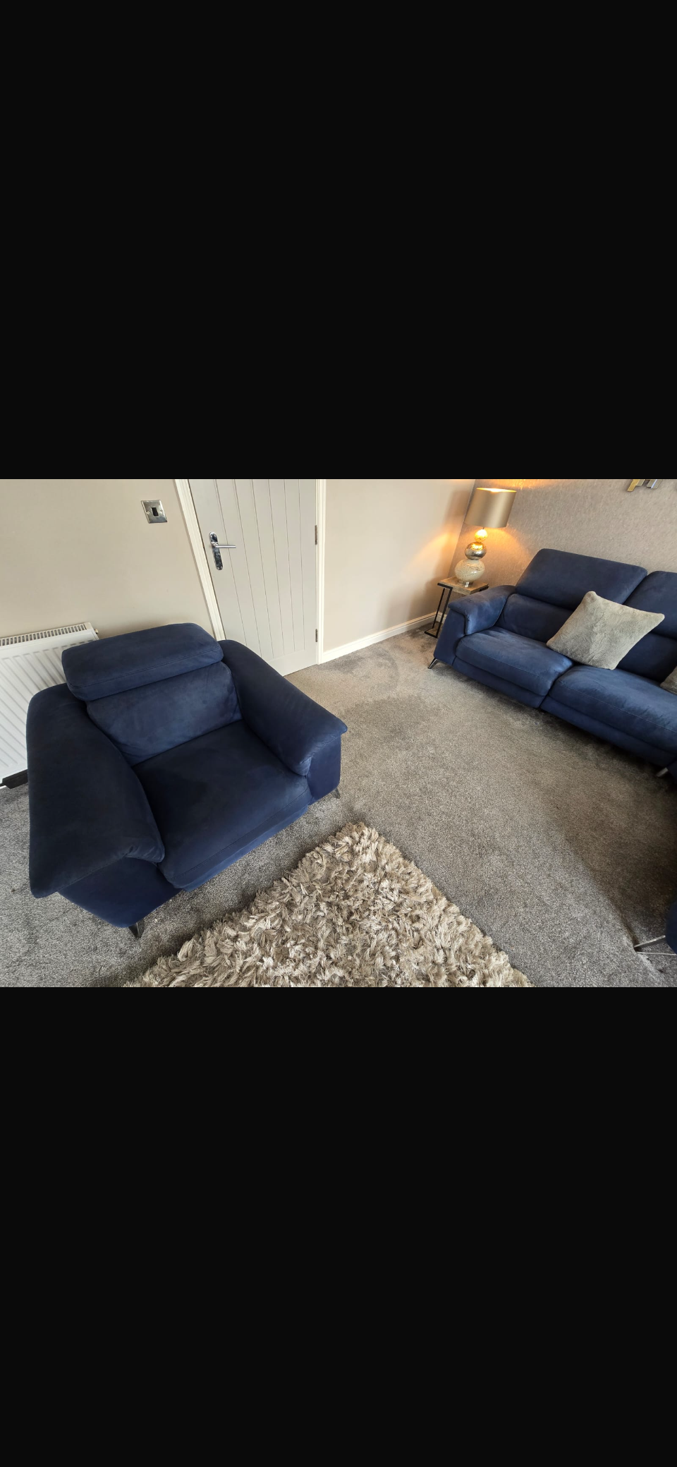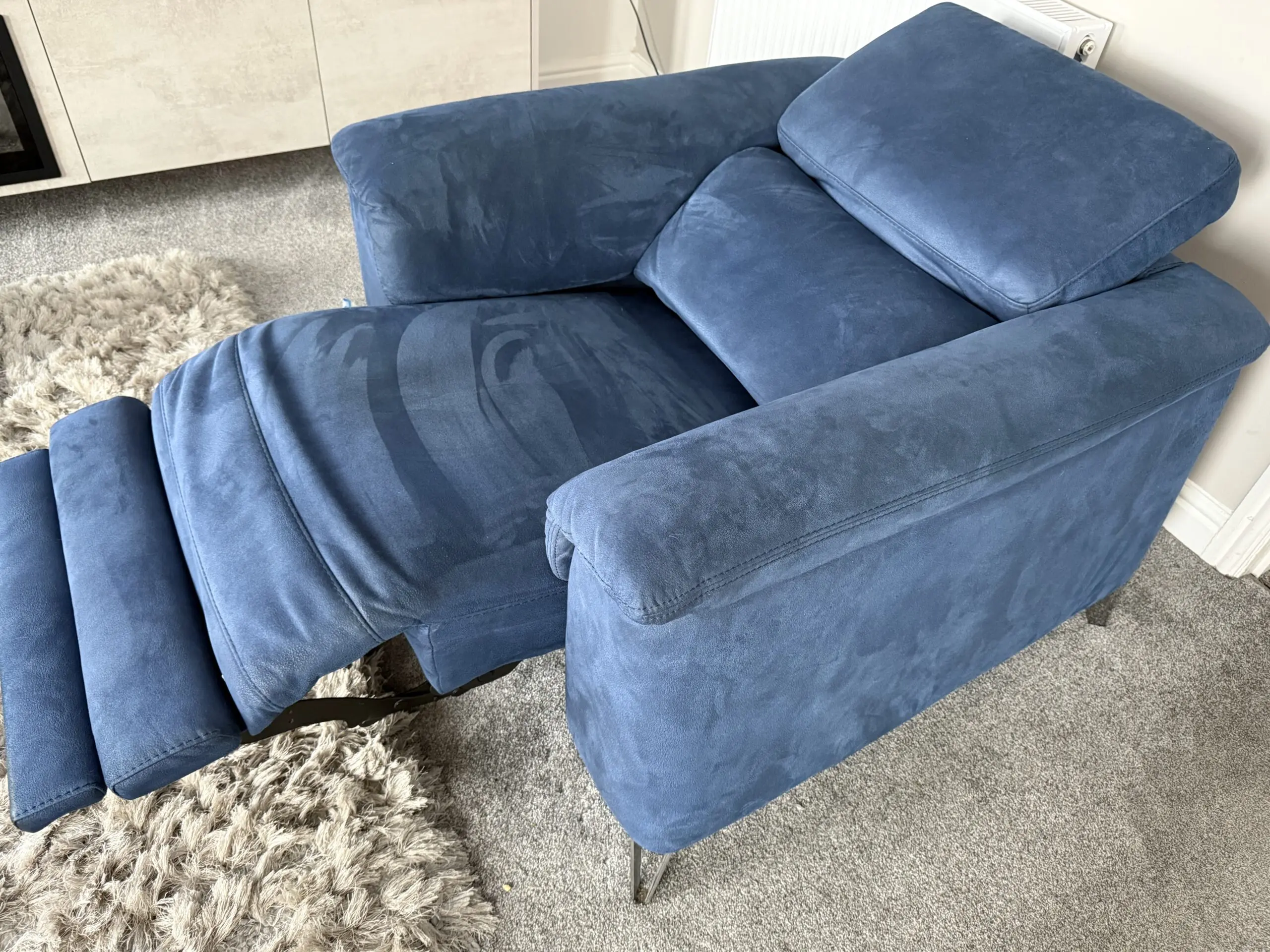 One of the chairs on sofa is electric recliner. Electric recliner on chair too. Controls on side of arm. Adjustable neck rest too. Fab sofa and chair which is easy to keep.