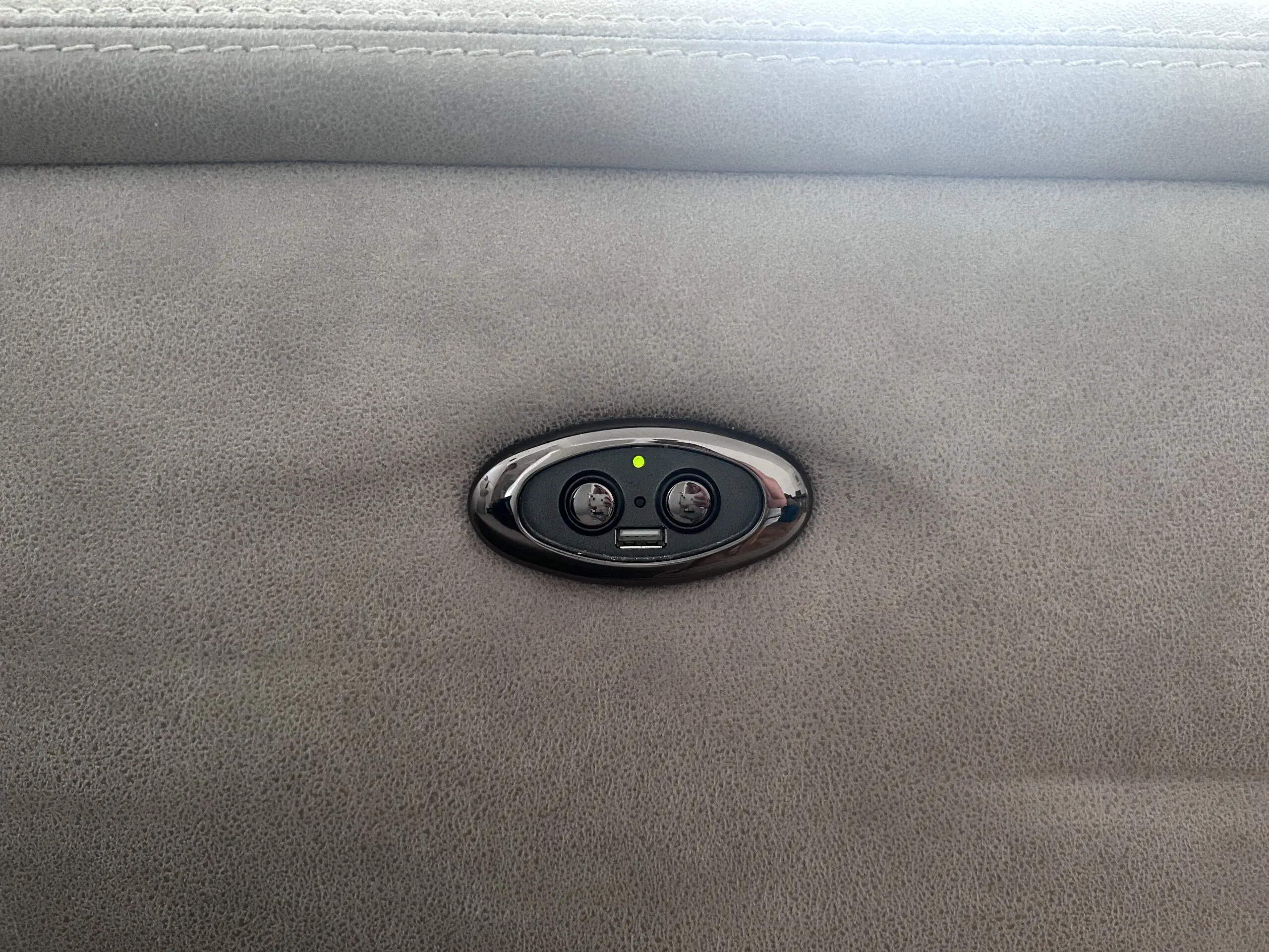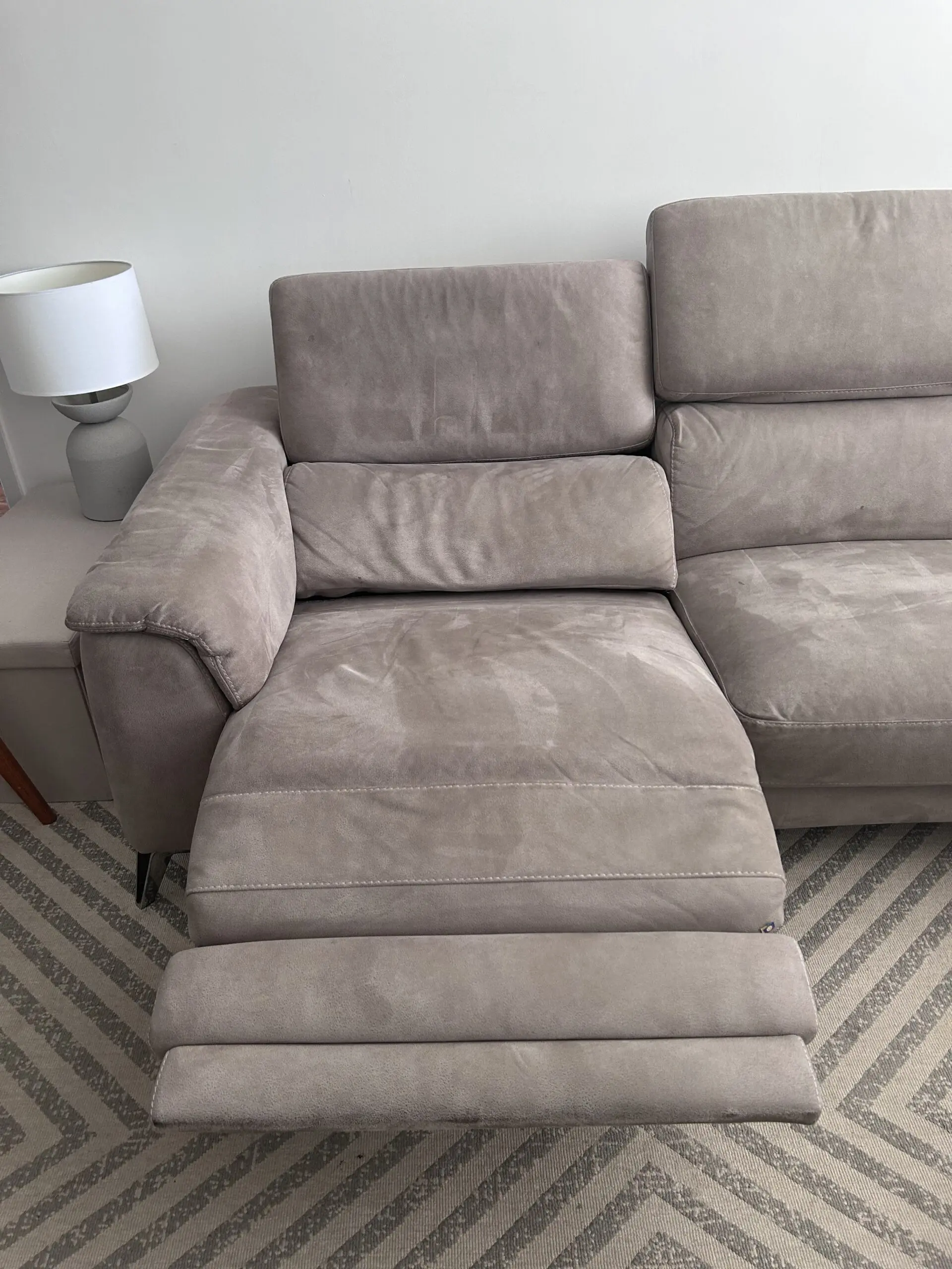 Large right corner sofa with adjustable headrests to each seat. The opposite side of the sofa is a full recliner and also has a USB charging point.