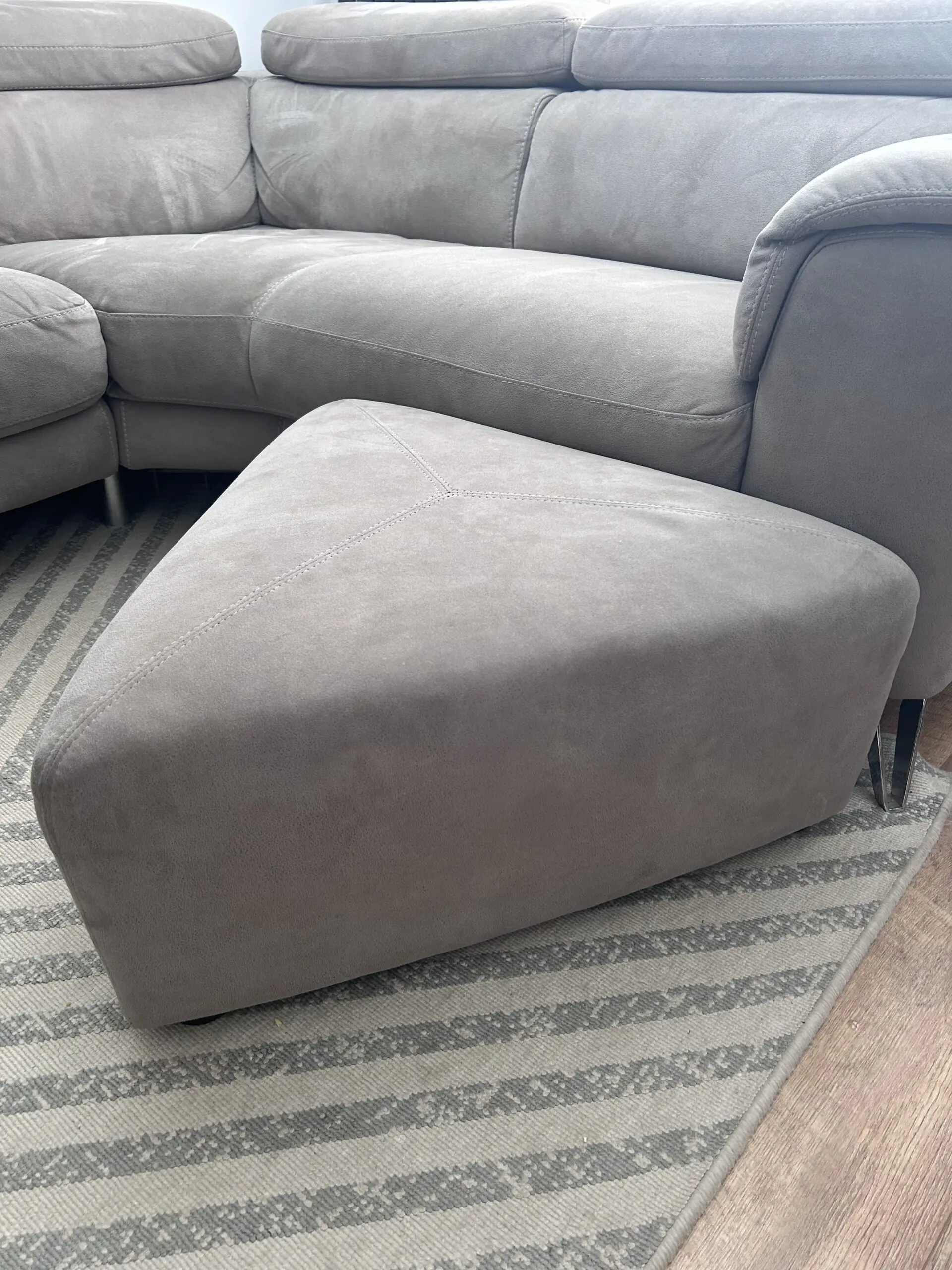 The triangular footstool was also purchased with the sofa and is great additional seating when required. It has no storage.