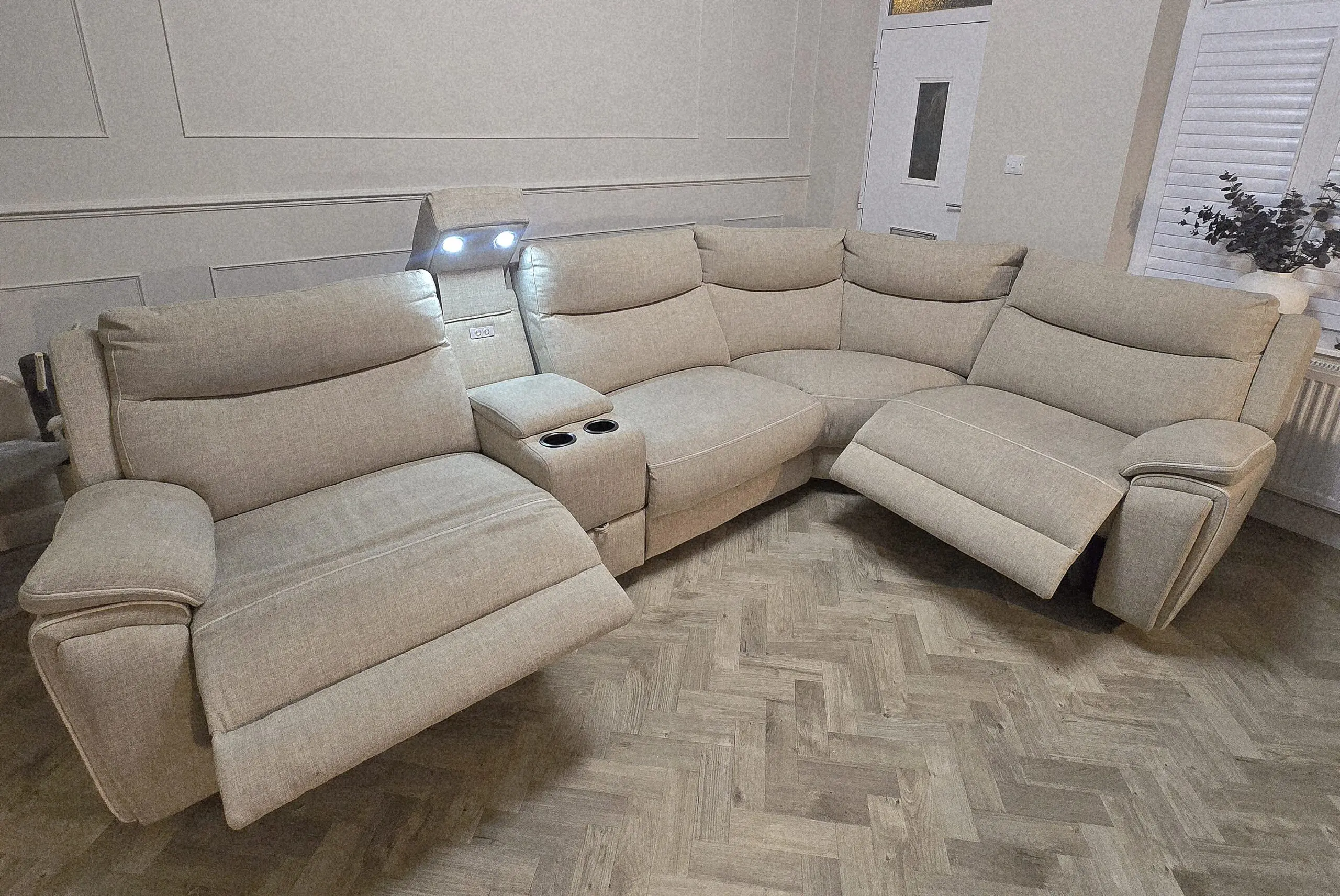 Features reading lights, console, storage, cup holders, electric power reclining, USB ports and contrasting piping.