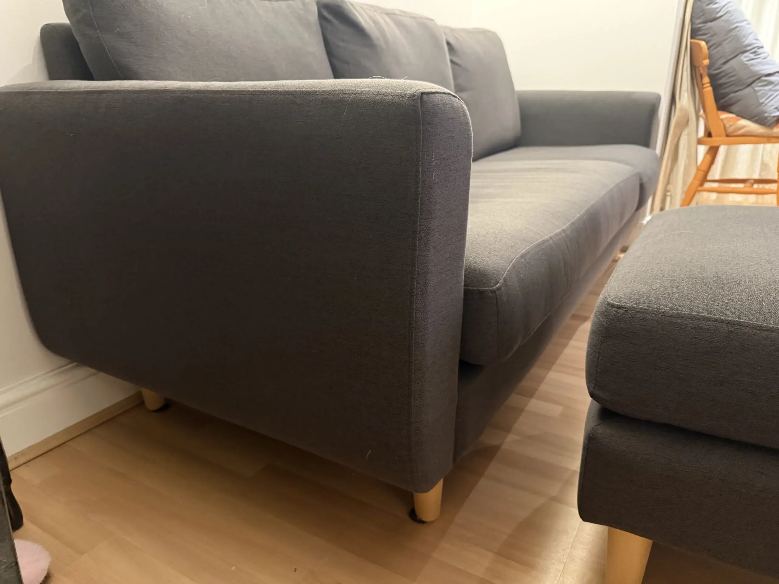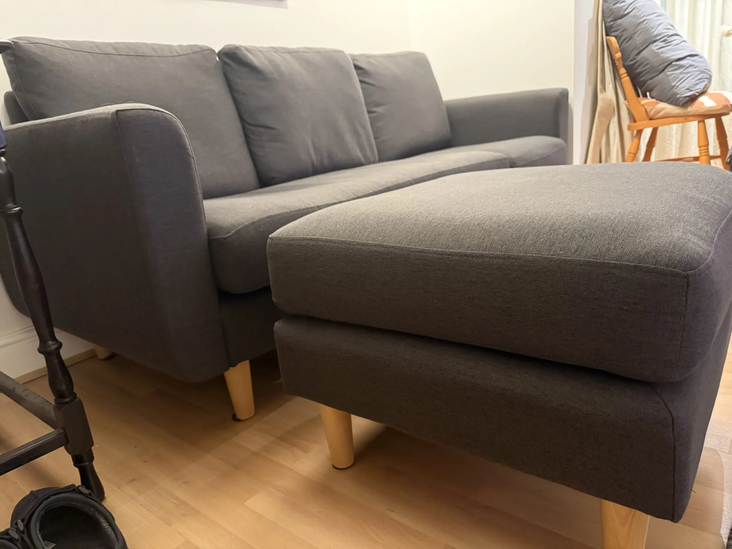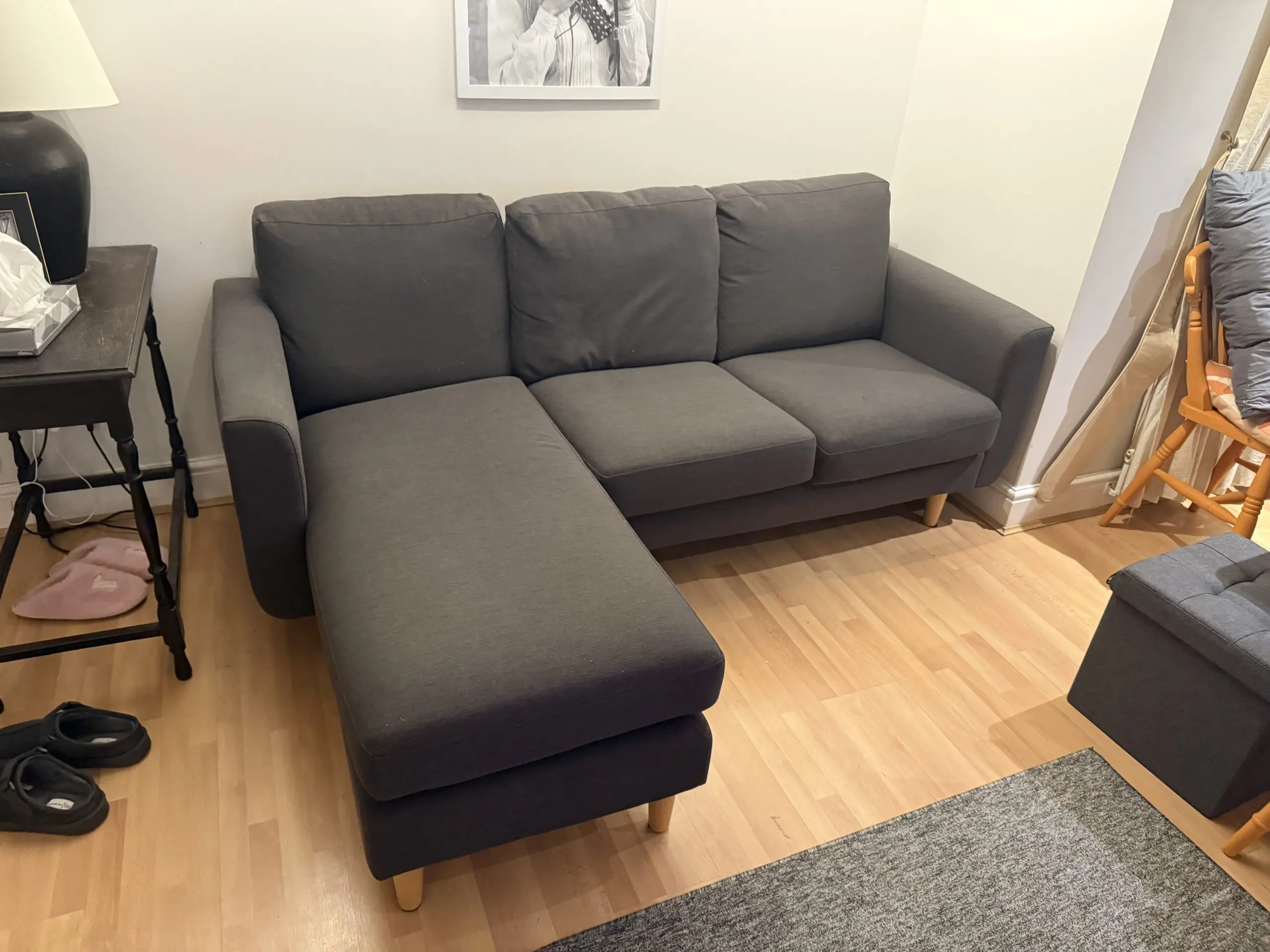 Versatile corner sofa that can be reversed from left facing to right facing. Ottoman included. Scandinavian look. Bought in march 2024. Dark grey in colour, seats a total of 3 people. Comfortable and modern style.