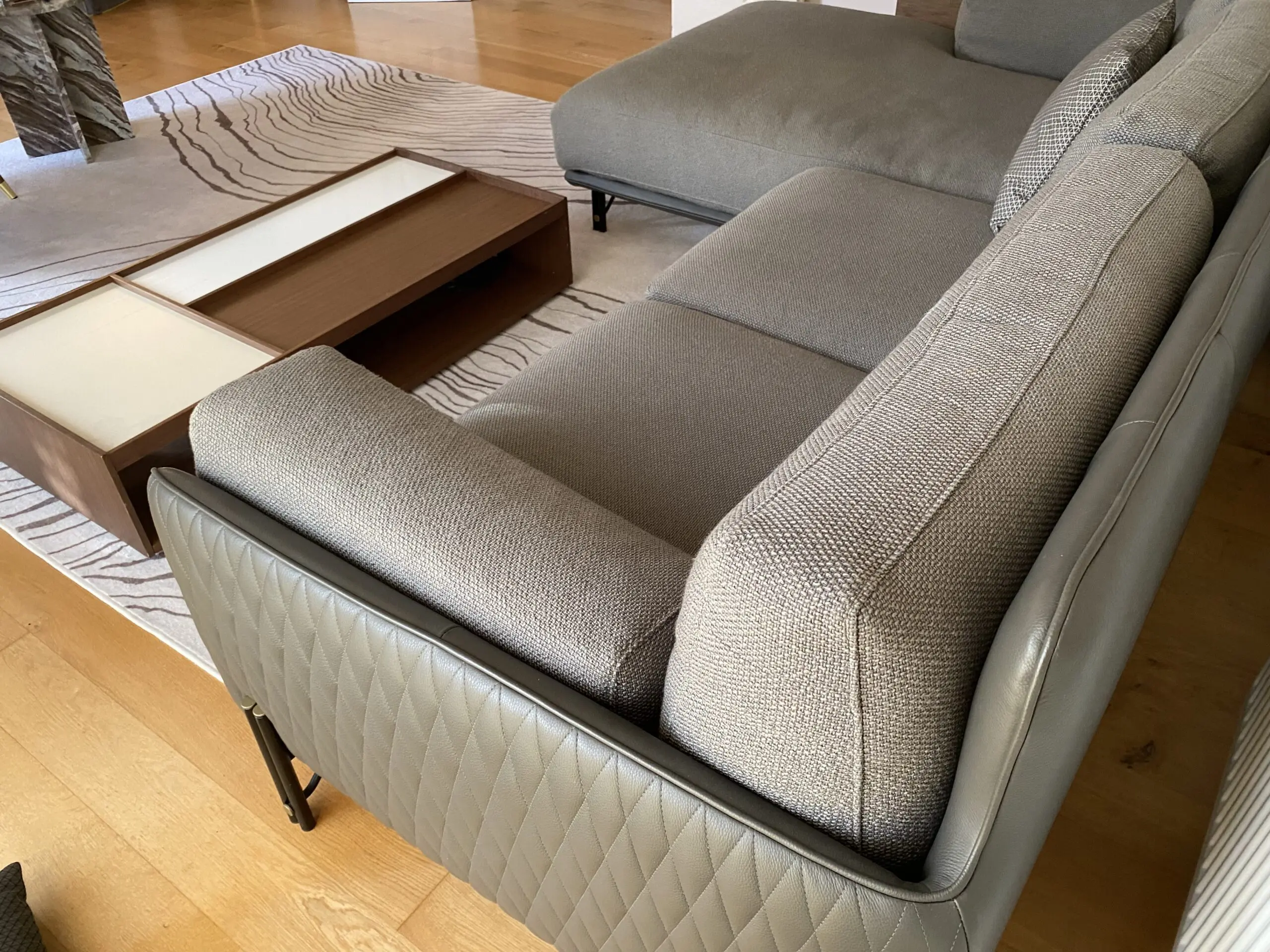 This is a high quality large 5-seater configuration, combining premium leather and fabric upholstery, offering exceptional comfort, durability and contemporary Italian design.