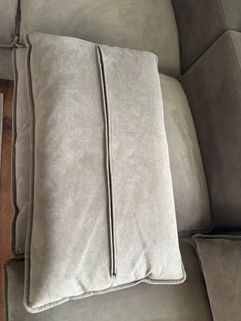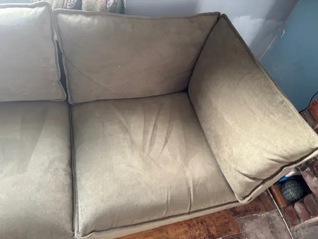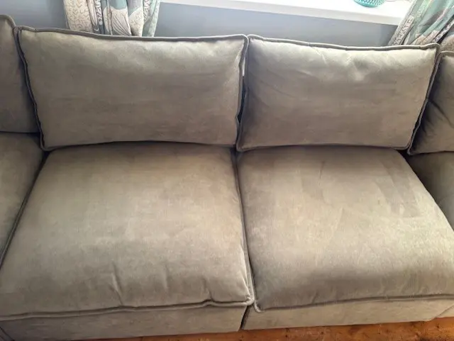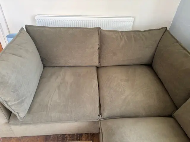 Modular, velvet, Olive coloured corner sofa from Dusk. Bought in January 2025, brand new, outside of the sale for £1600. selling as downsizing. In excellent condition, only 1 mark noticed on the back of one of the extender units (See pic). Set includes 3 corner units and 2 extender units. These can be setup in Righ hand, left hand or equaly spaced (1 extender on each side of the middle corner unit) setups and are connected with metal clasps under the units. Sofas come from a home with cats. All cushion covers have zips and can be removed for cleaning.