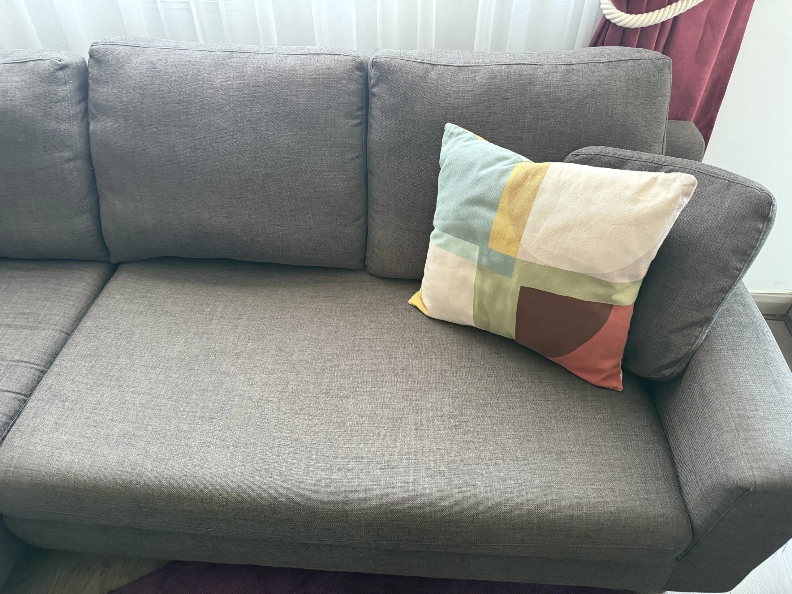 Left hand chaise Ankara corner sofa from dwell in dark grey weave. It comes in two pieces, with removable back and seat cushions, and two small cushions.