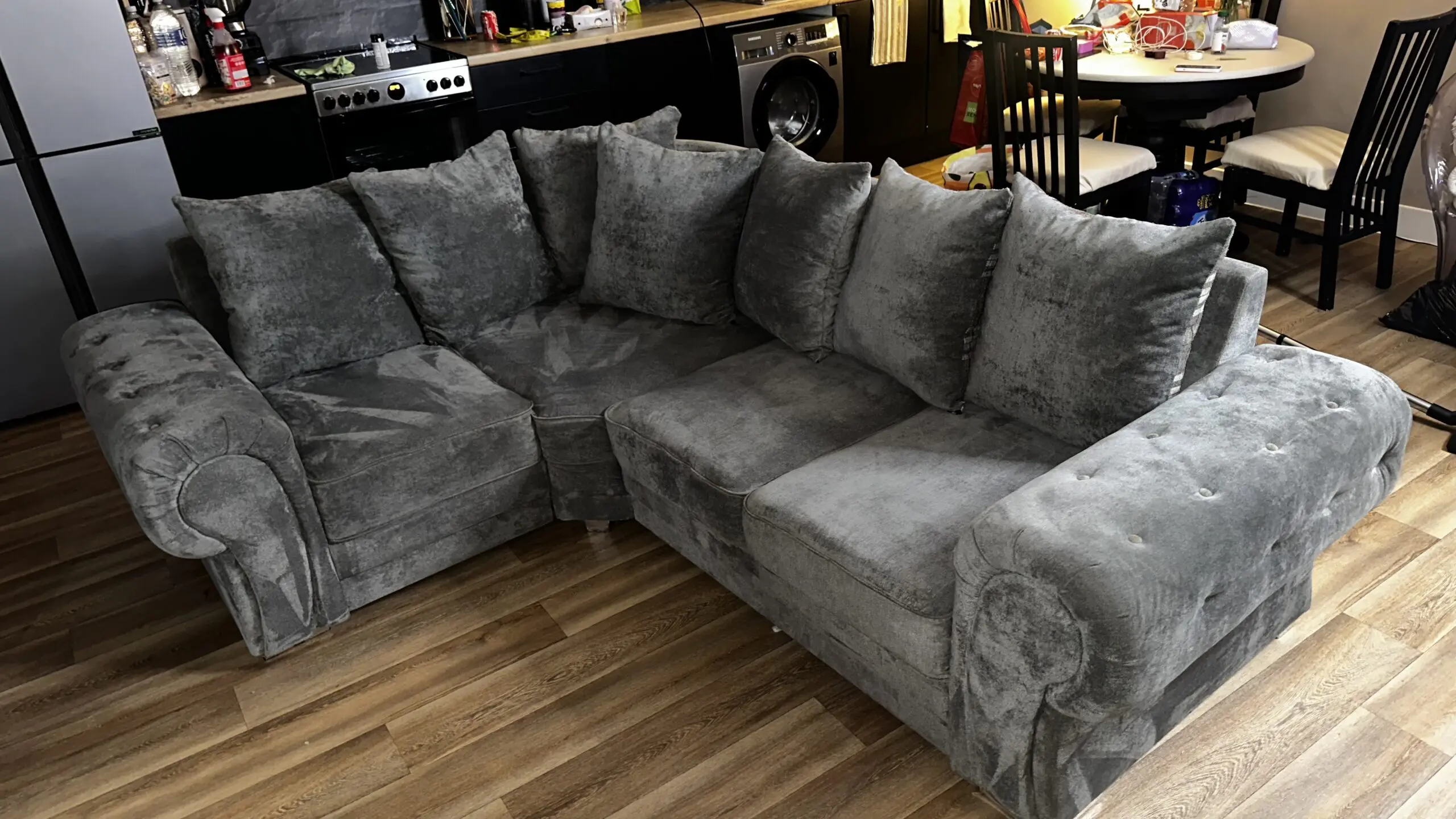 This spacious corner sofa offers plenty of room for the whole family with comfortable seating for 4 or more people. The classic design features rolled arms and generous scatter cushions that provide excellent back support. Perfect for large living rooms, this L-shaped configuration maximises seating whilst creating a cosy focal point. The neutral grey colour will complement any home décor style beautifully. Professionally cleaned. Pillows have also been filled with extra stuffing to give a more fuller look. Great condition for age, i have tried my best to look after it.