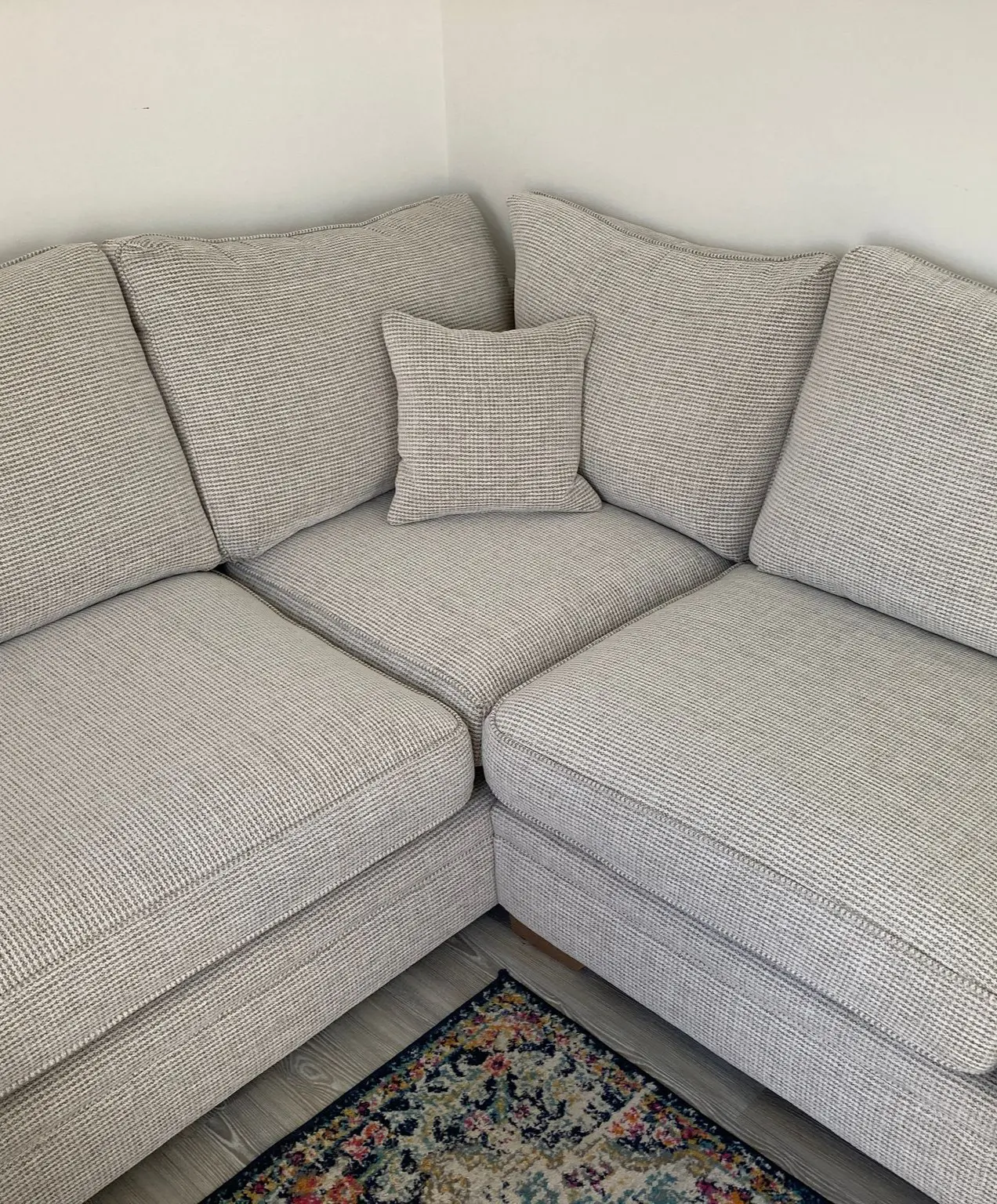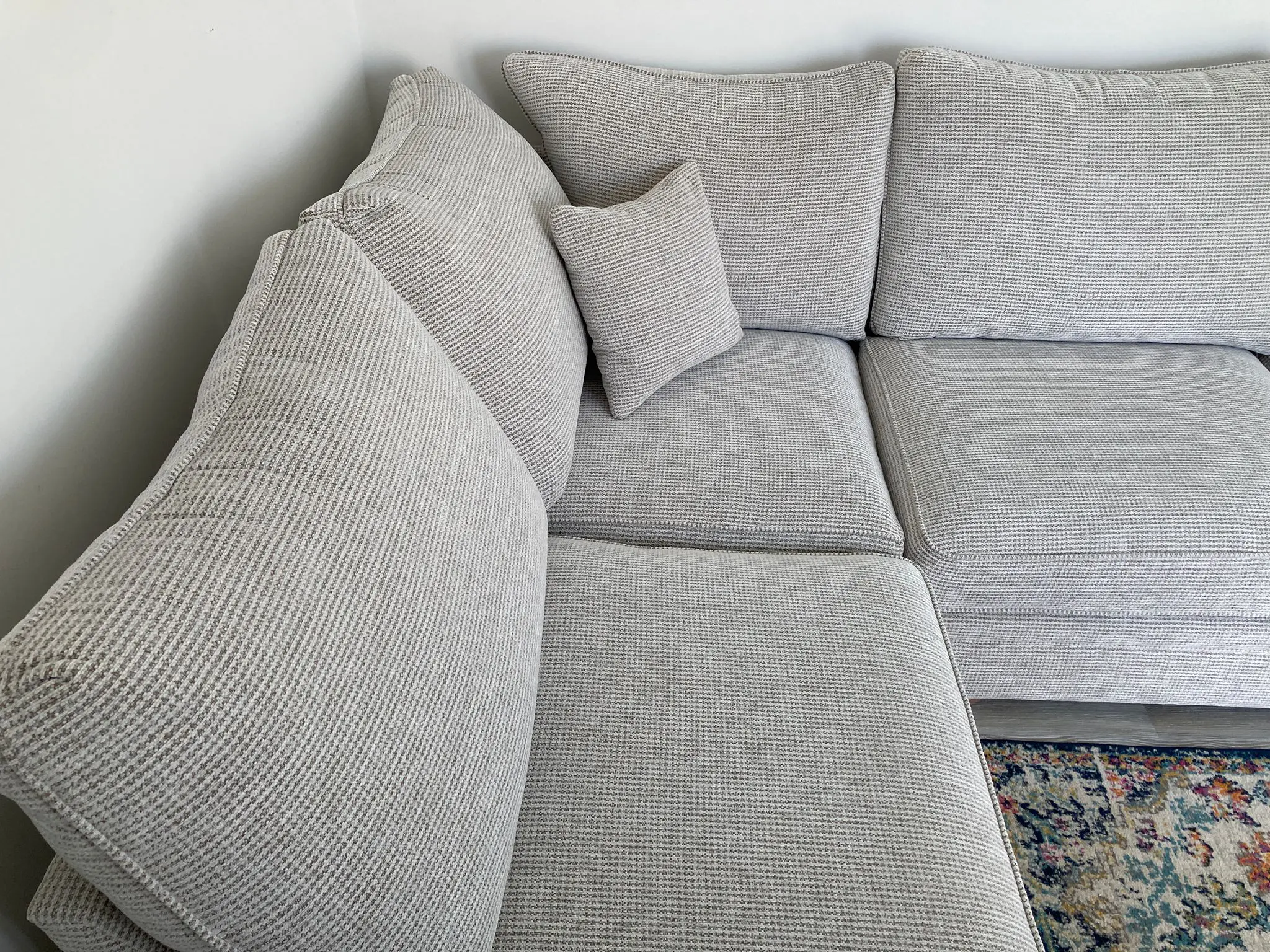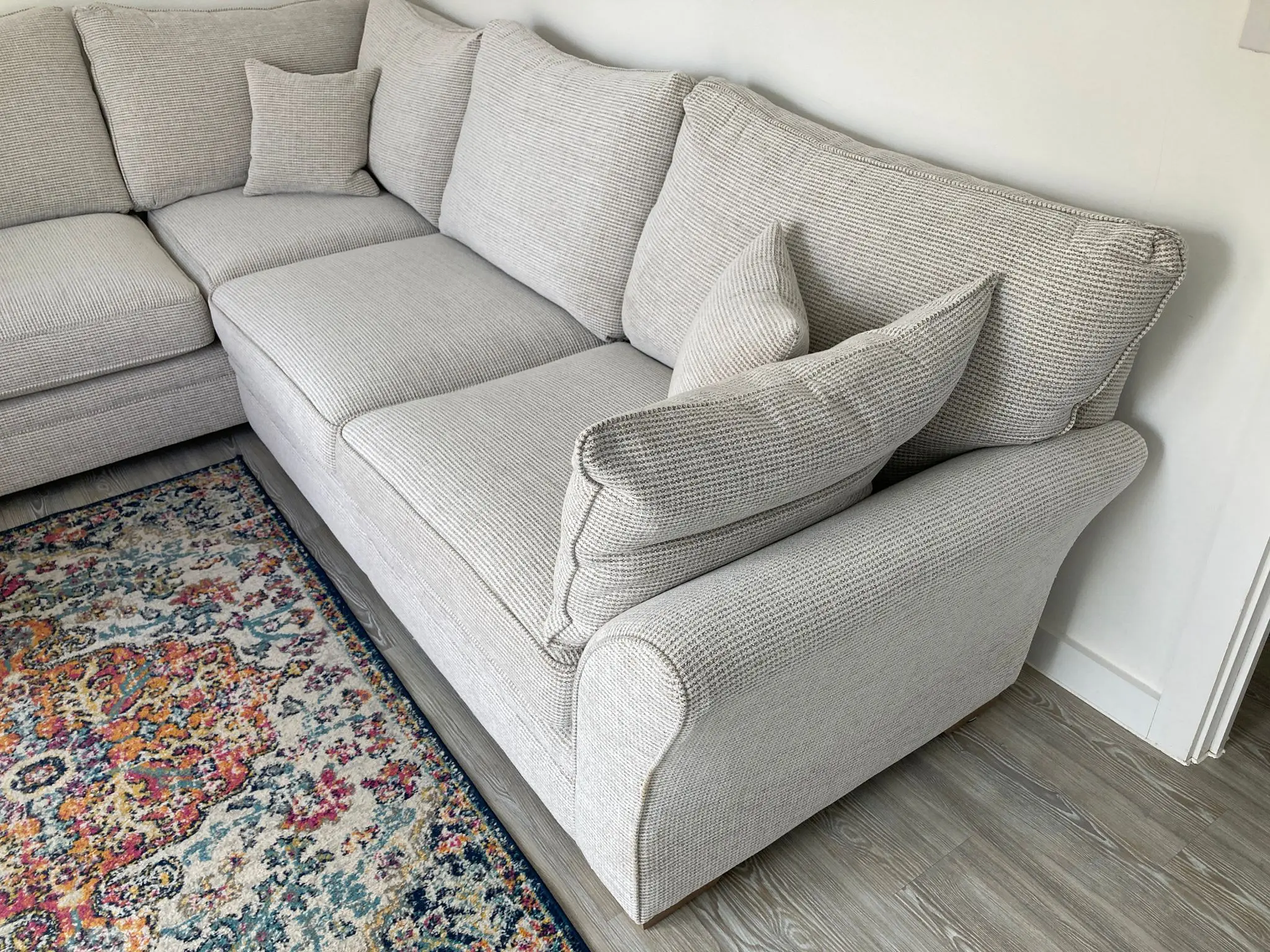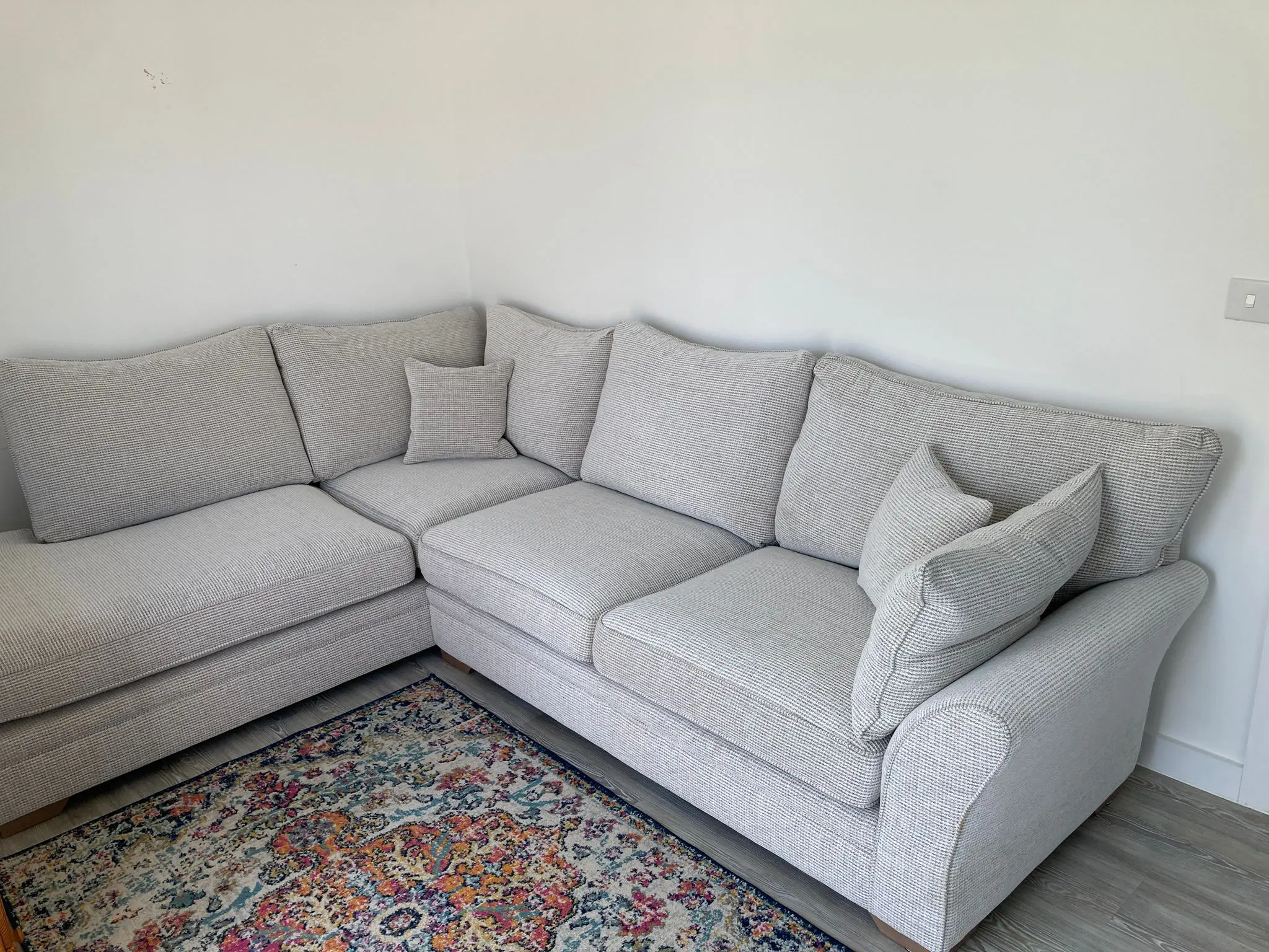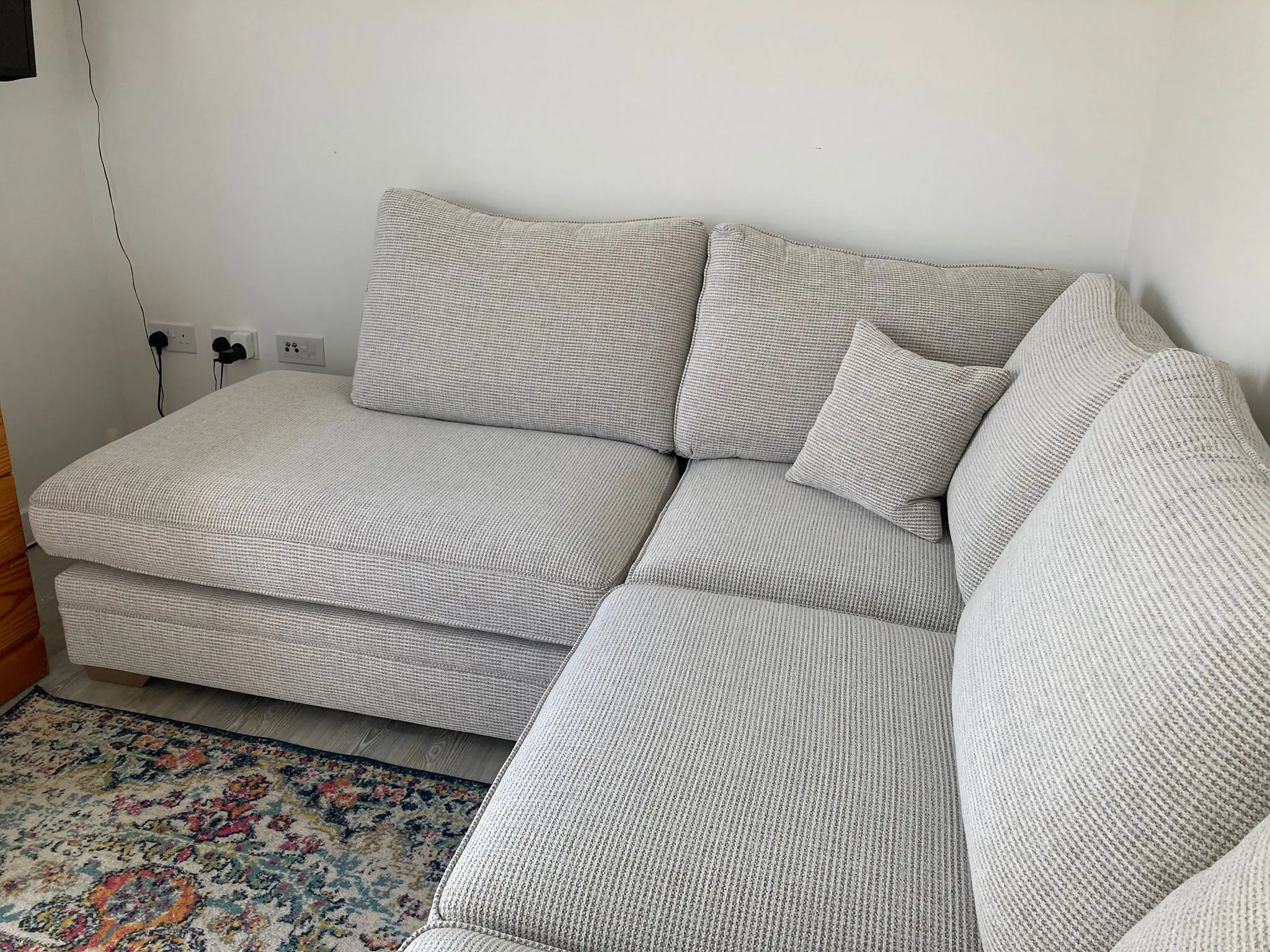 Eve right-hand facing arm corner sofa by Lucas Furniture. This beautiful, high-quality sofa was handmade and finished with care, offering both style and comfort.