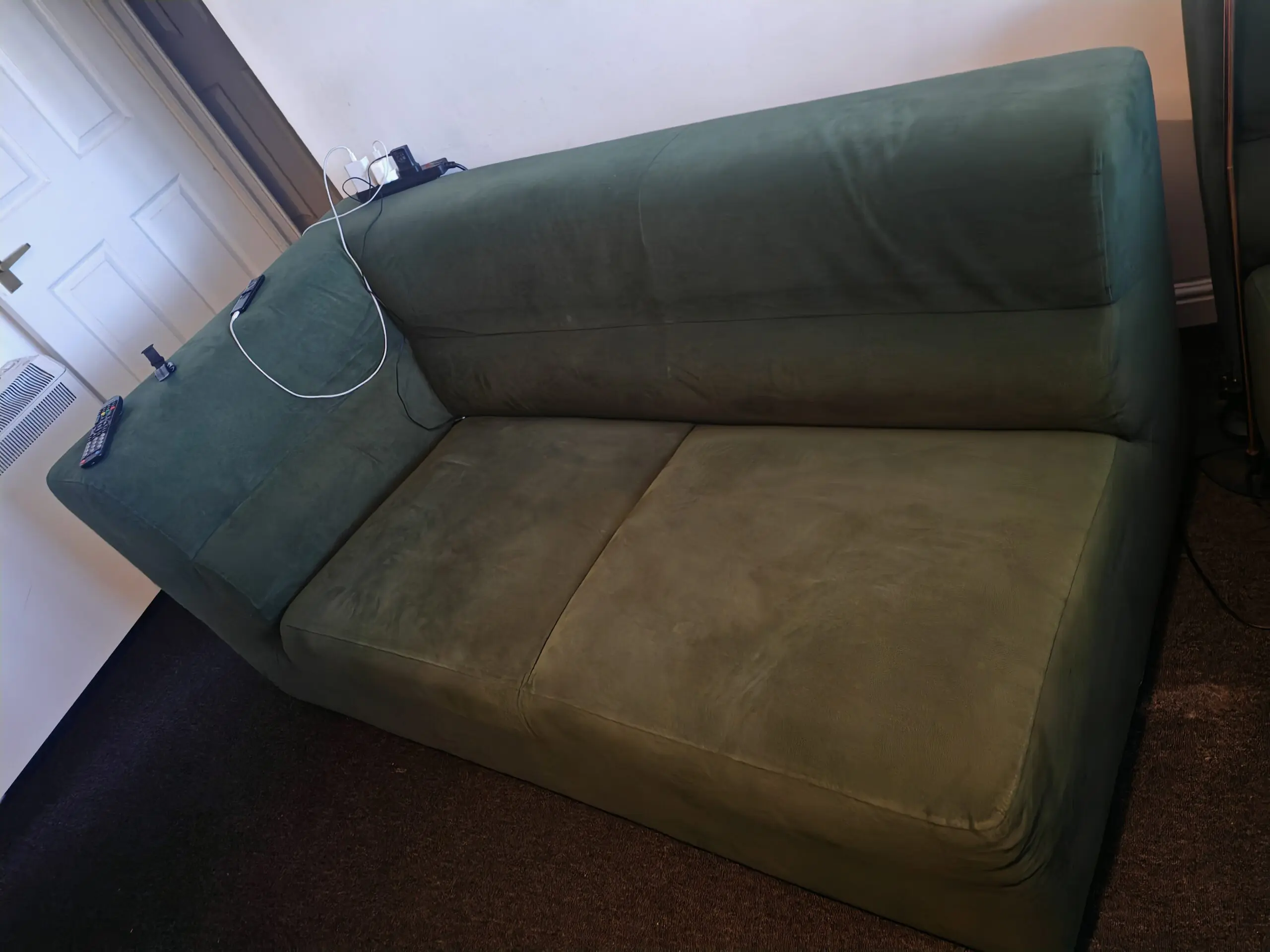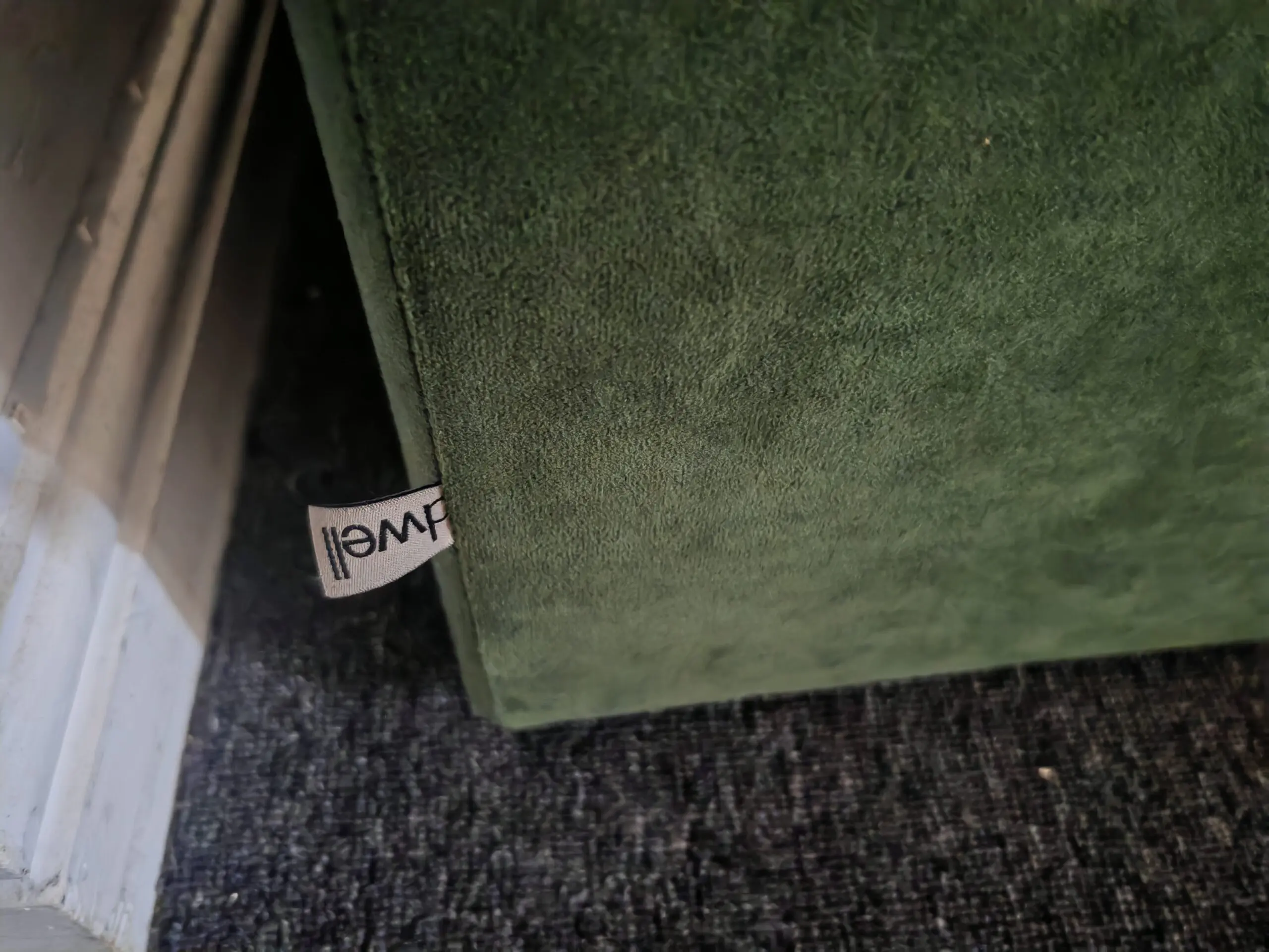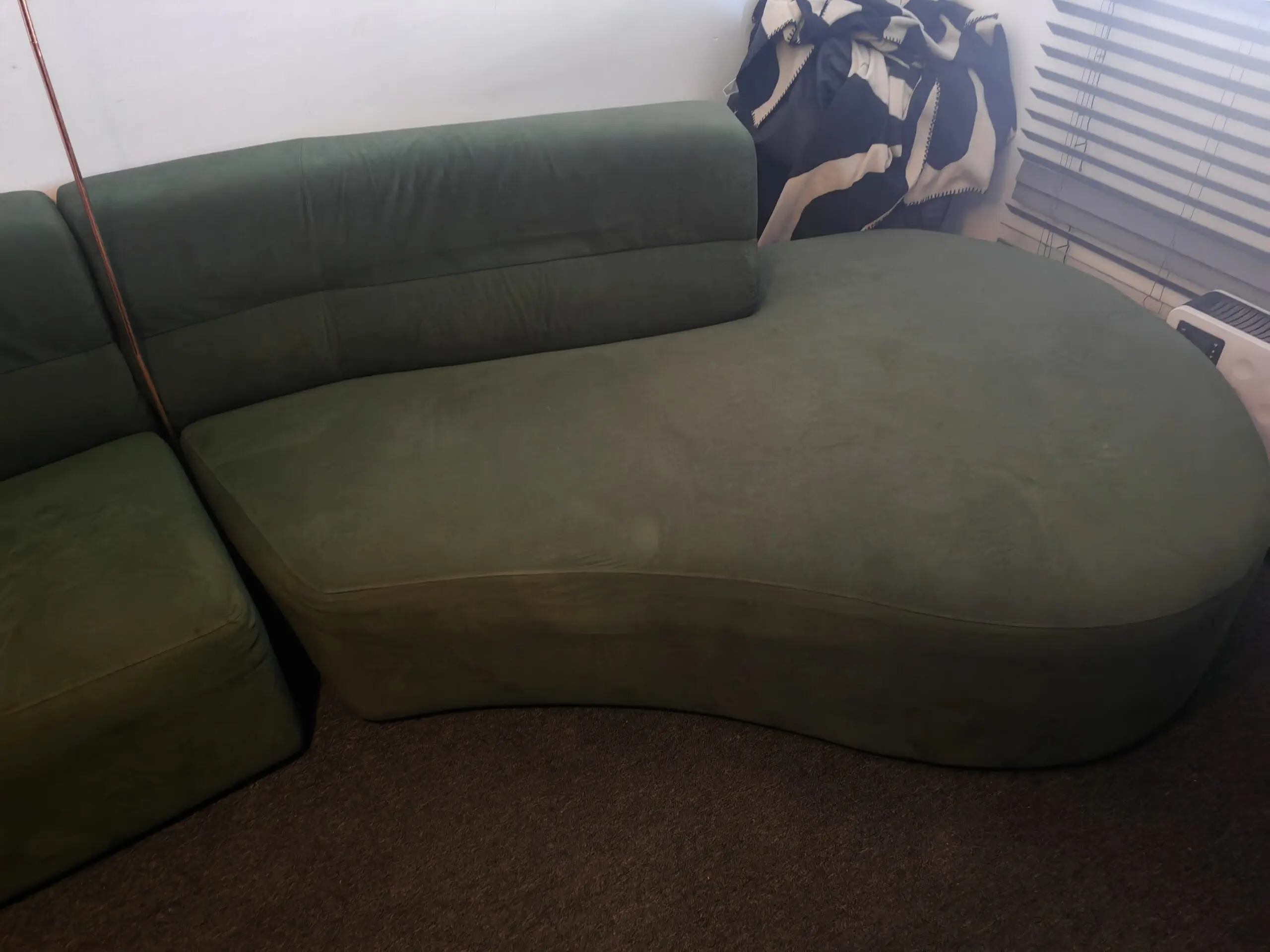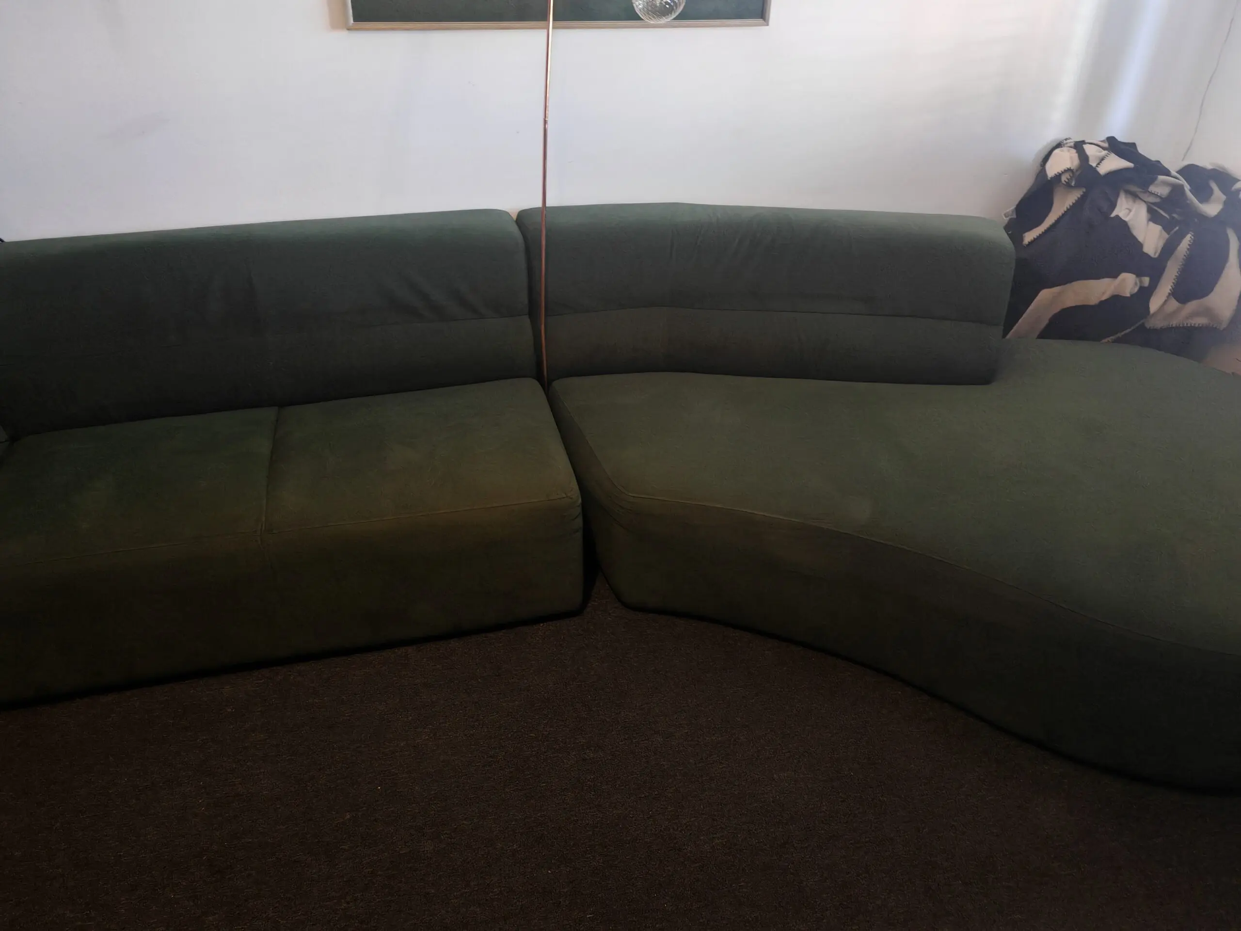 Bottle green Ferrara right hand facing 2 piece chaise end sofa with combines curve and angles in a strikingly sculptural design that is big on both comfort and looks , this luxurious sofa has deep cushions for your relaxation. This sofa is still under warranty for 15 years bought 2 years ago from dwell.