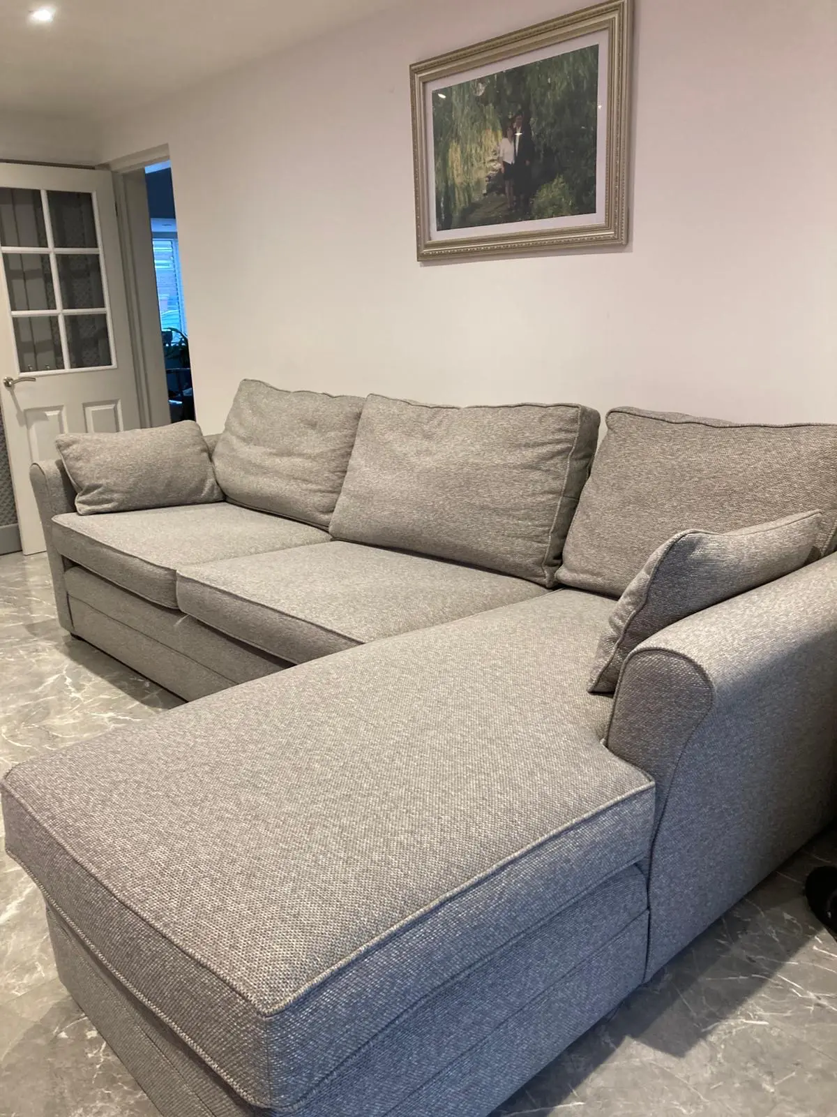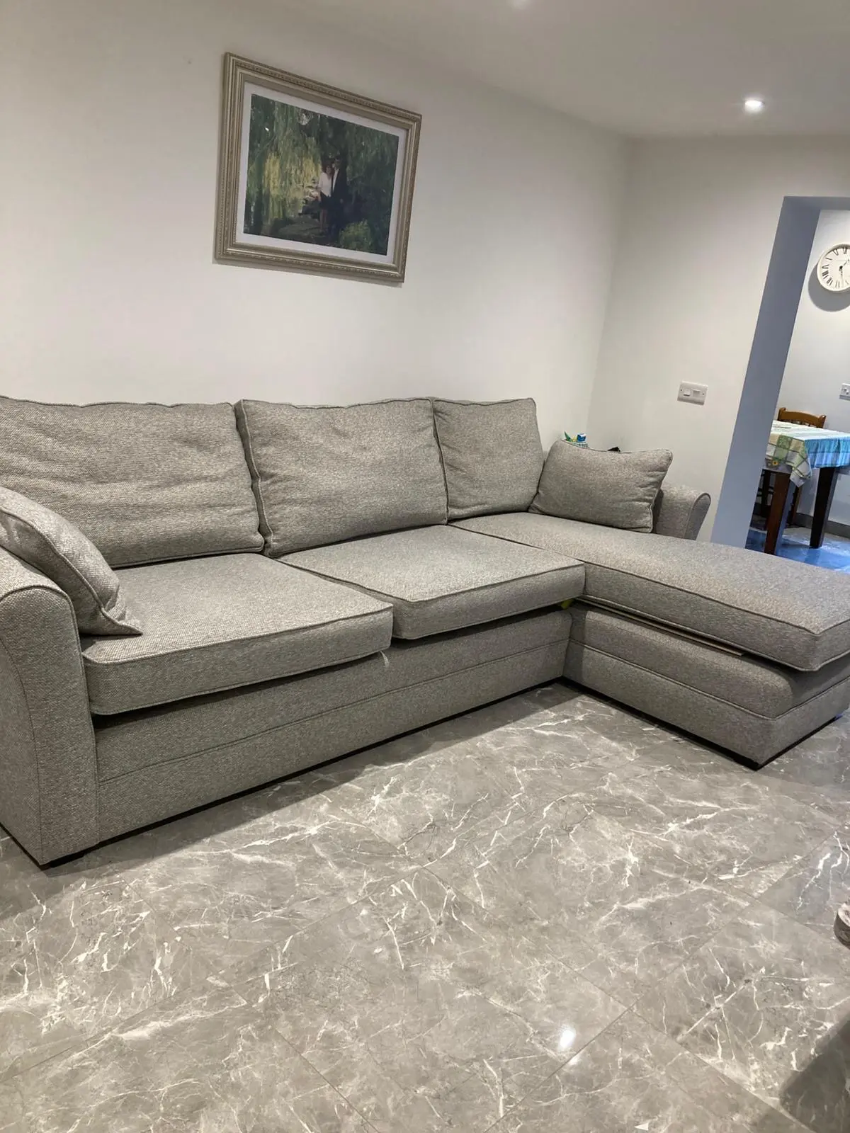 This spacious corner sofa offers excellent comfort and versatility for any living room. The L-shaped design features a generous chaise section that’s perfect for stretching out, plus ample seating for the whole family. The neutral styling and classic proportions make it suitable for both traditional and contemporary interiors. With its sturdy construction and comfortable cushioning, this sofa provides brilliant value for a large family piece.