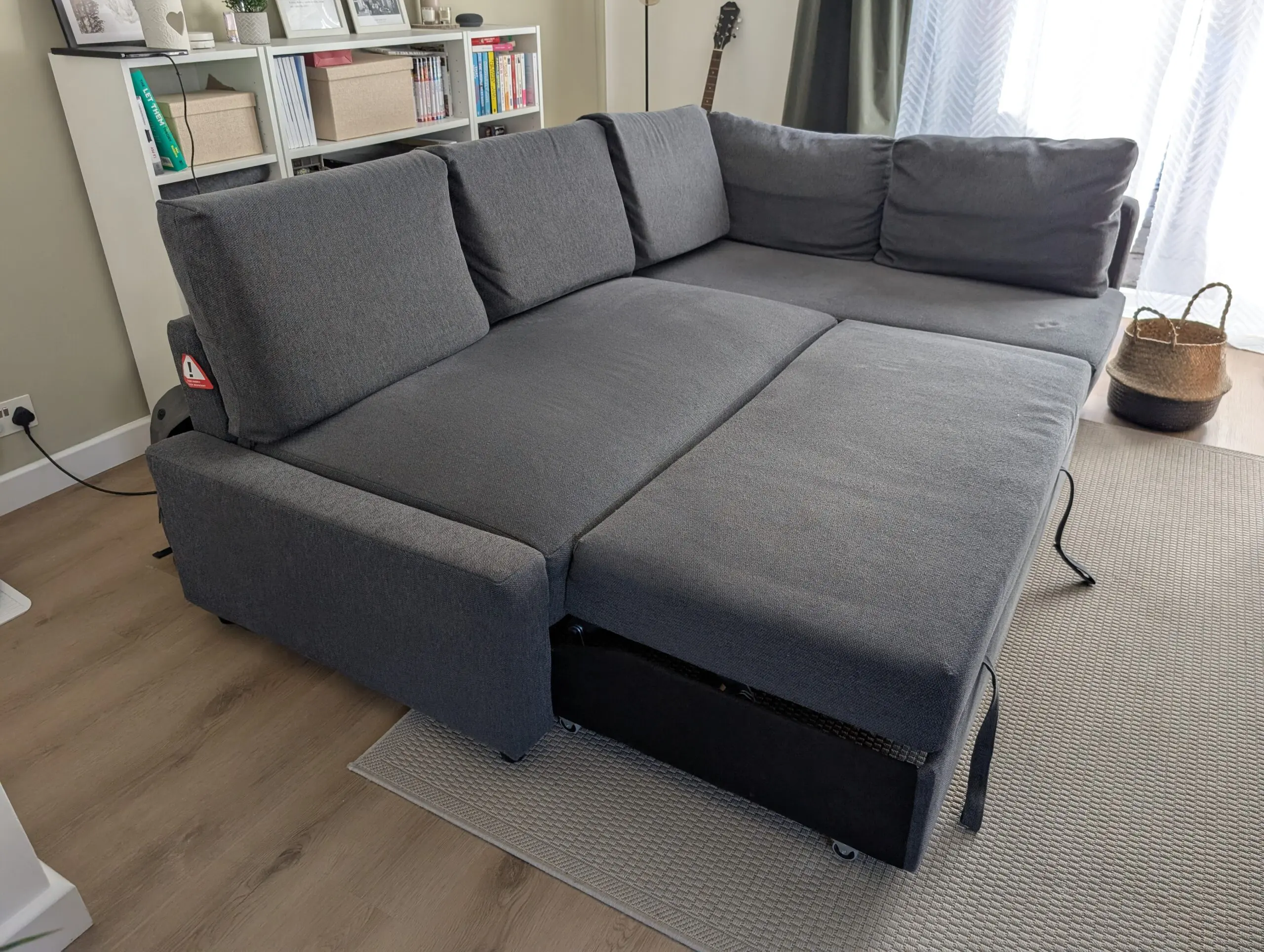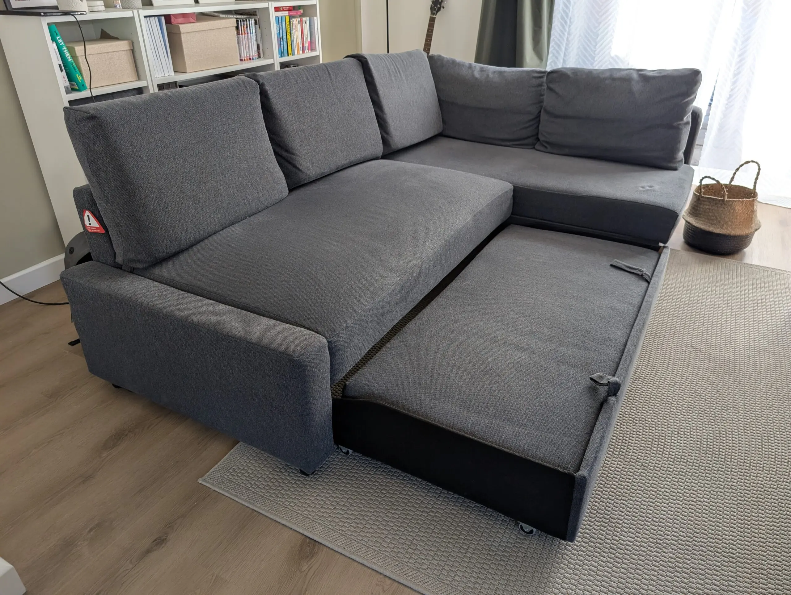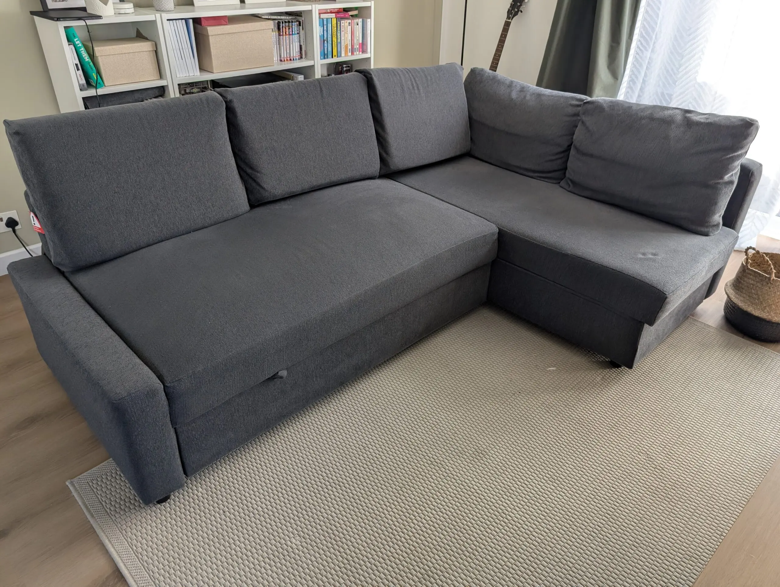L shaped sofa bed with storage. Good conditions. Possibility of changing side of chaise longue. Some parts of the sofa reinforced with foam.