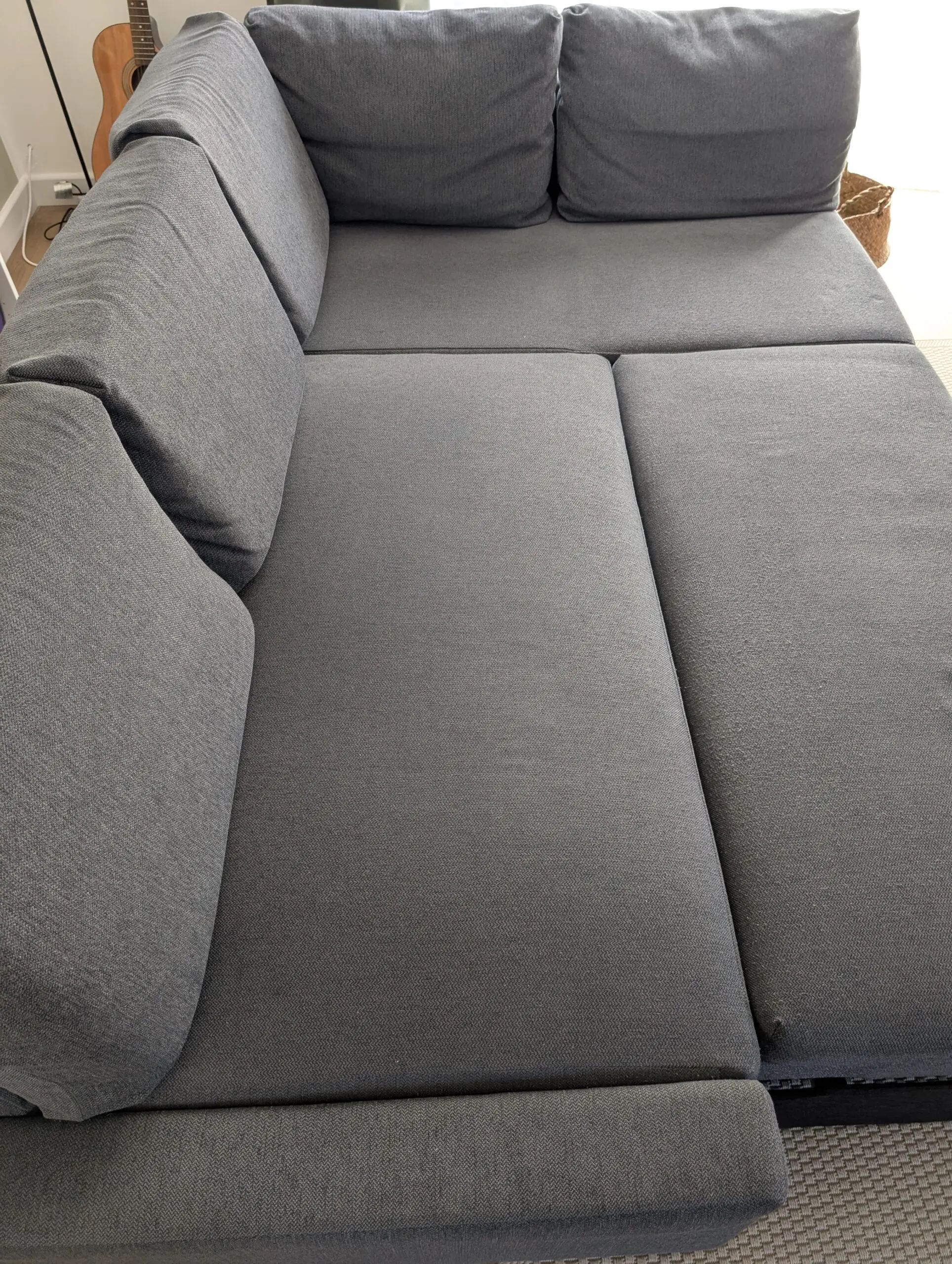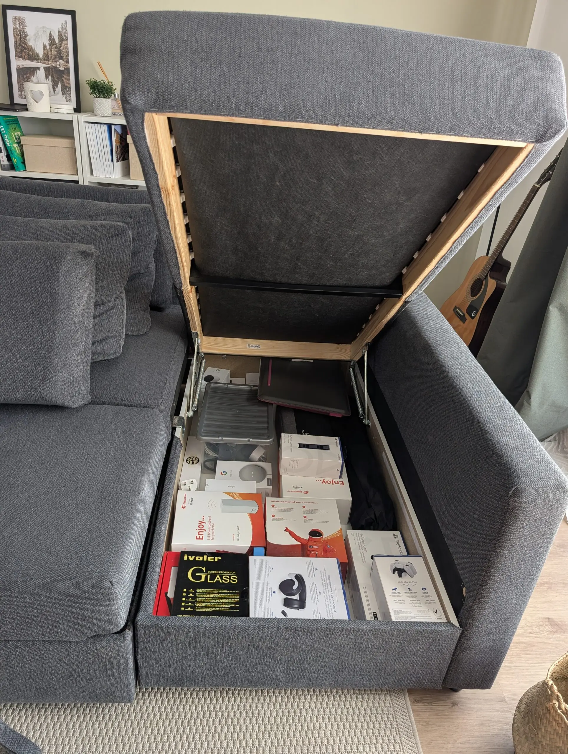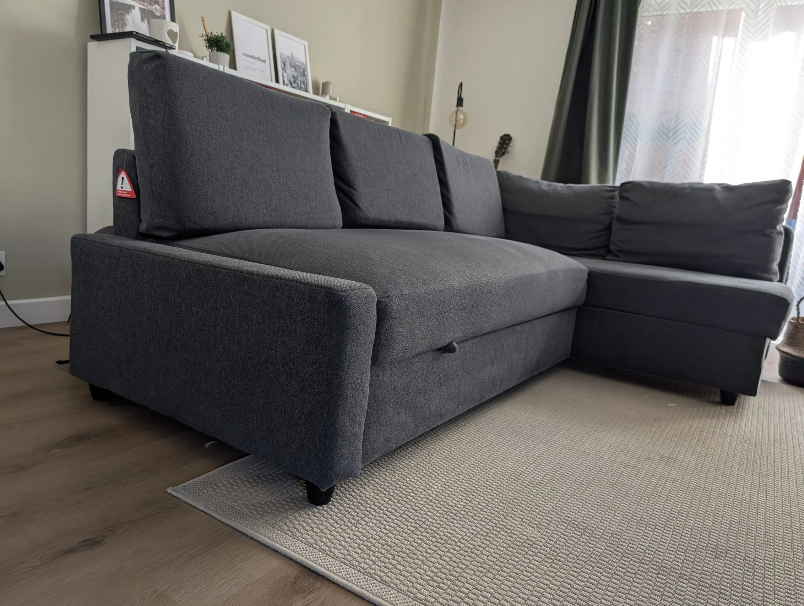 L shaped sofa bed with storage. Good conditions. Possibility of changing side of chaise longue. Some parts of the sofa reinforced with foam.