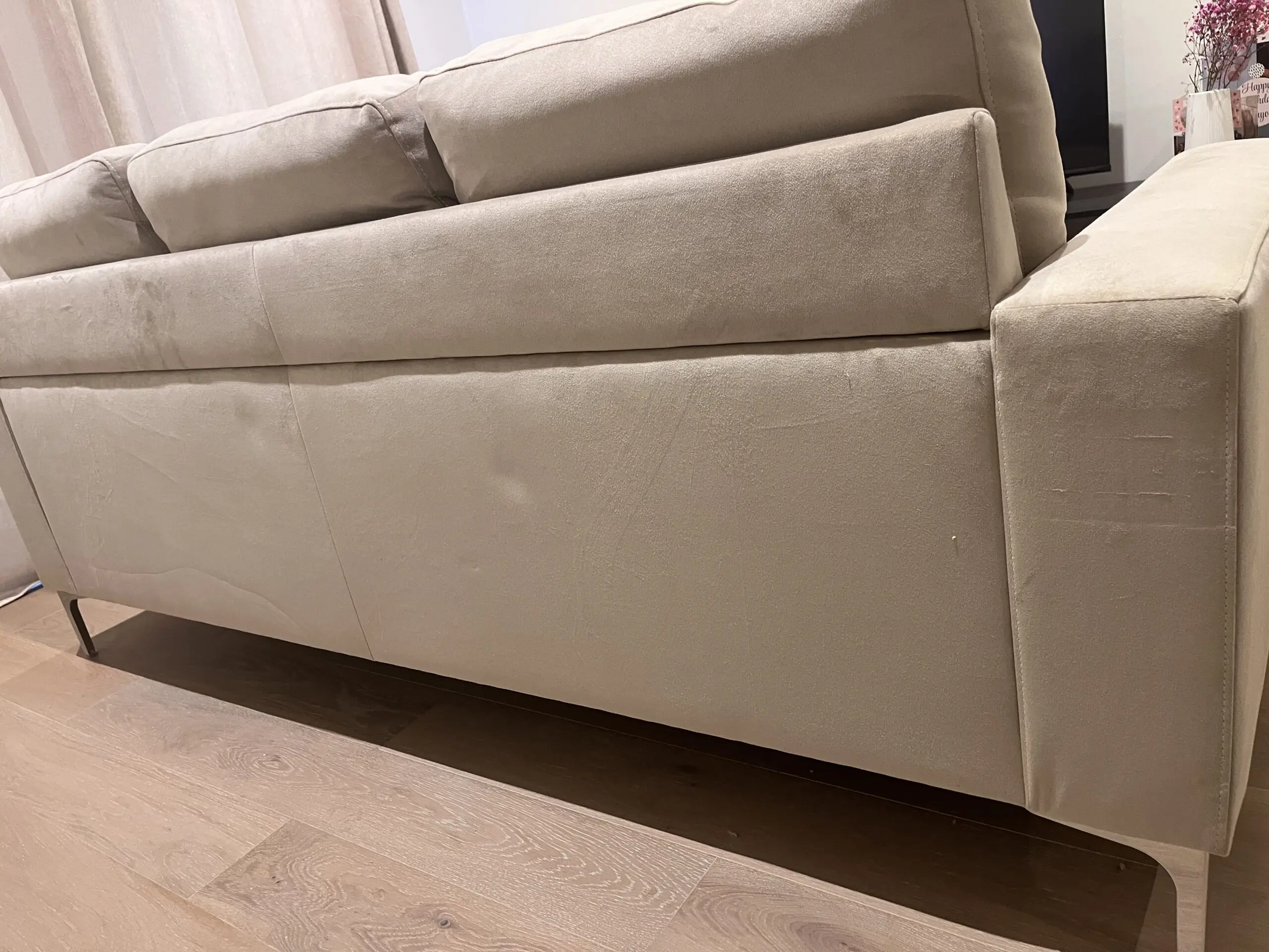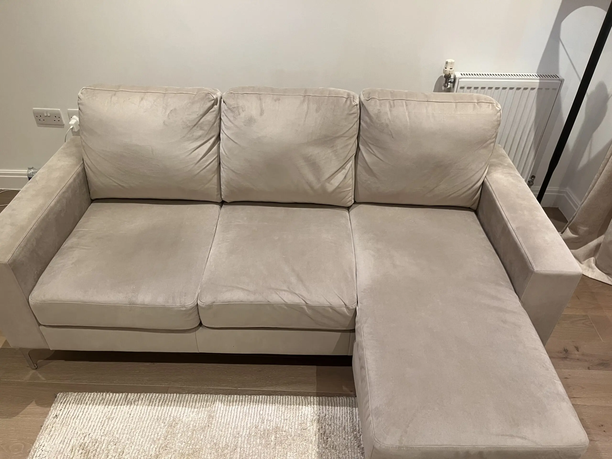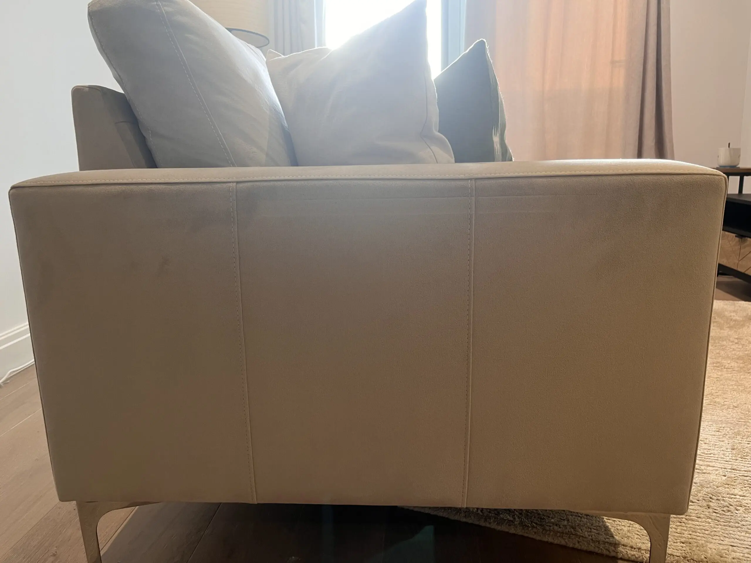 Very comfortable and stylish sofa, soft touch velvet fabric. Lightly used for 7 months. Perfect for living area & great addition to a home. Cushions and blanket for styling pictures only.