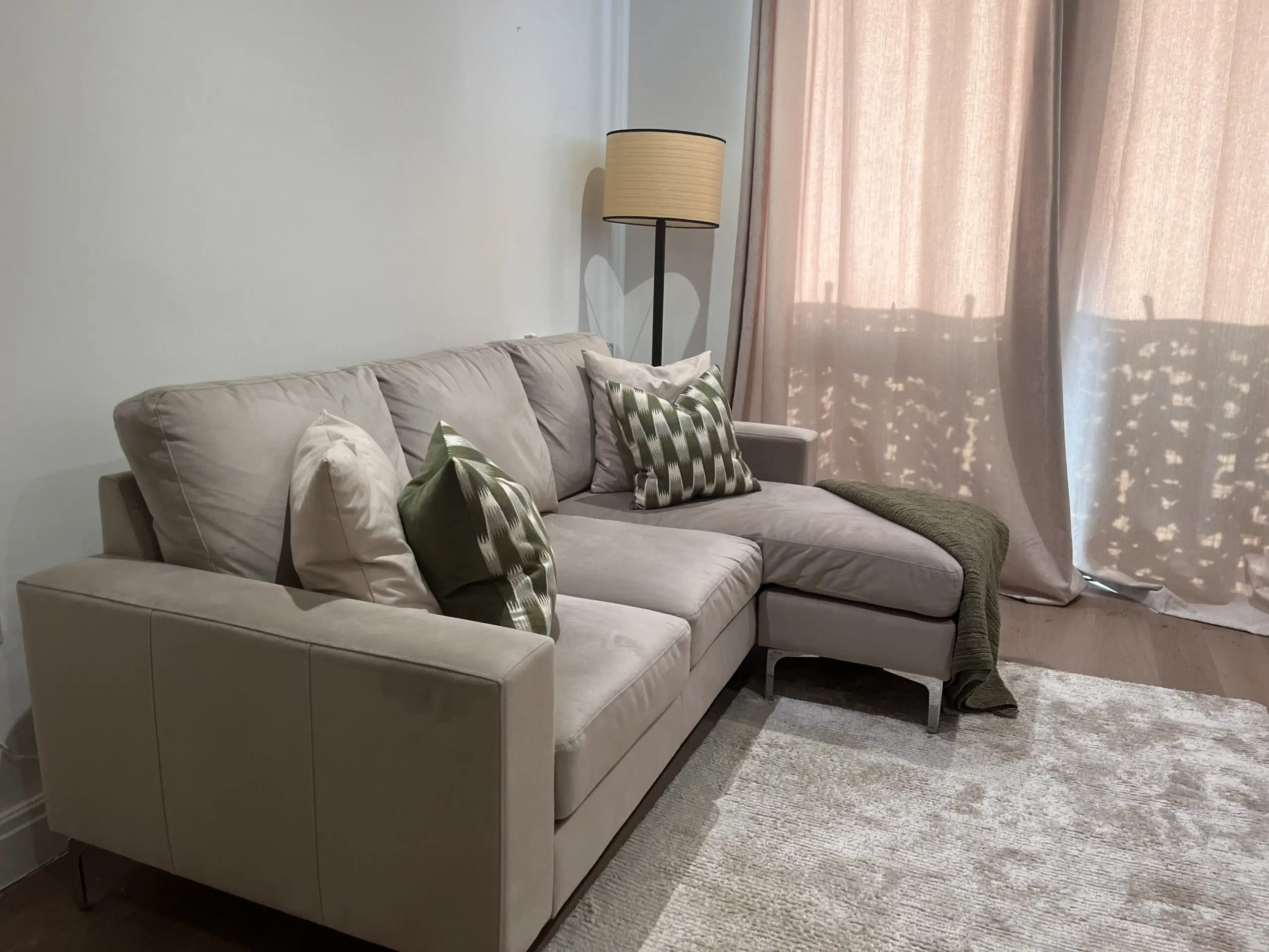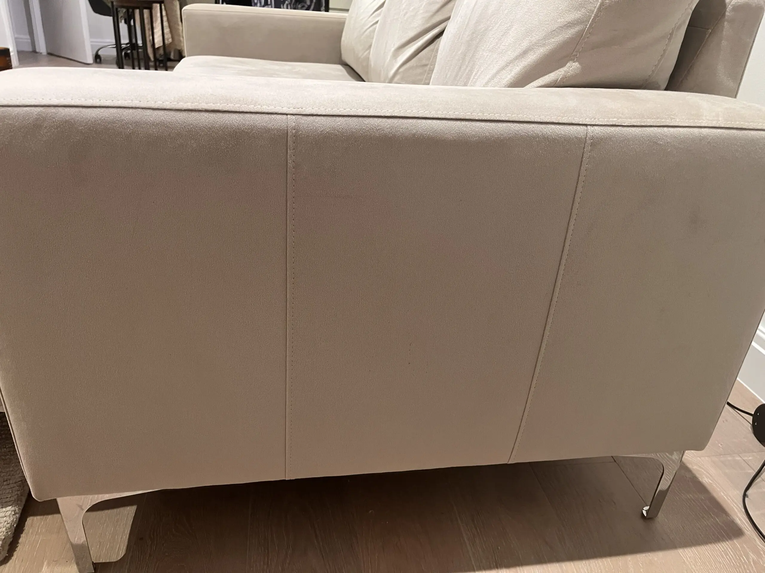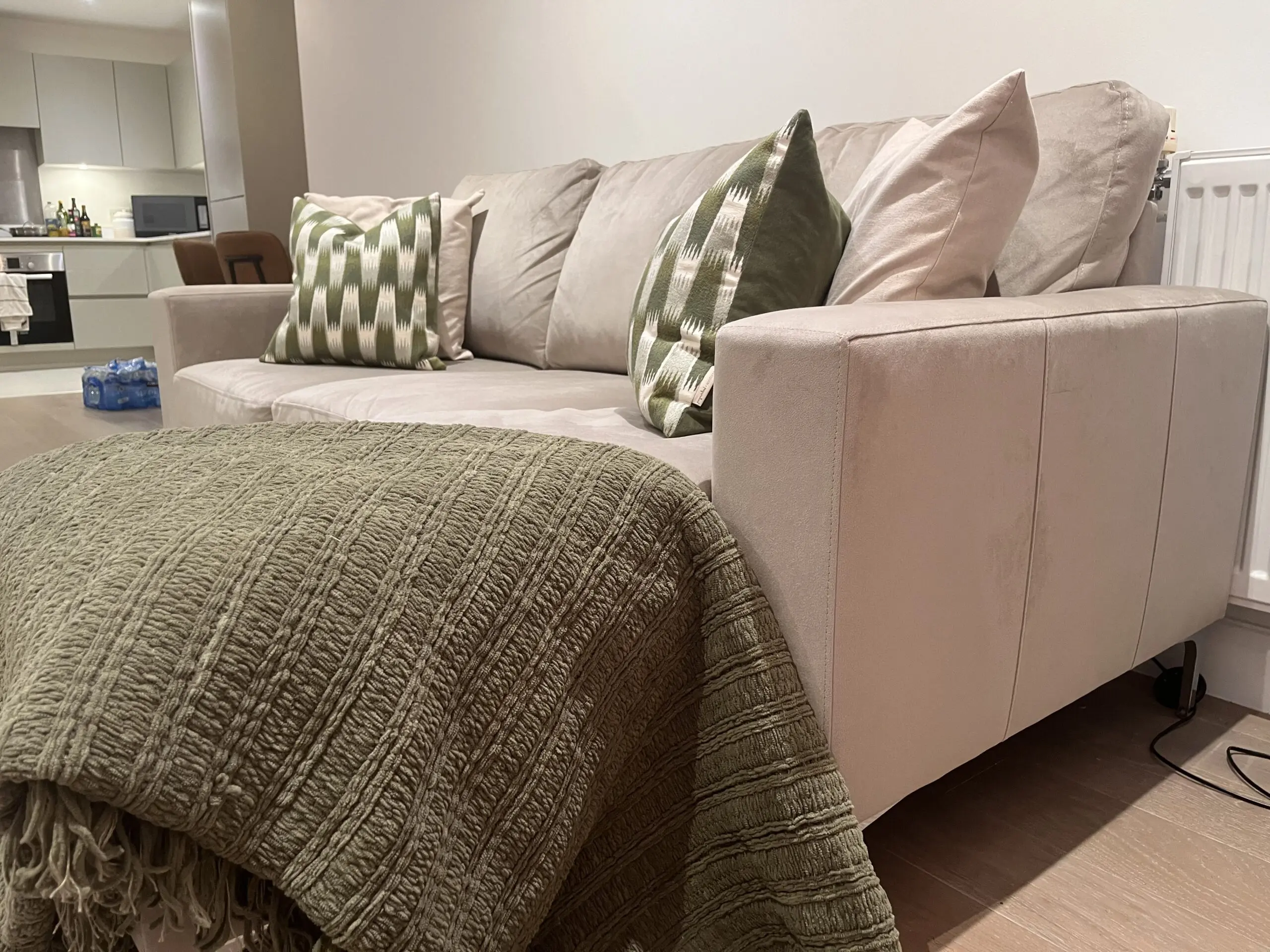 Very comfortable and stylish sofa, soft touch velvet fabric. Lightly used for 7 months. Perfect for living area & great addition to a home. Cushions and blanket for styling pictures only.