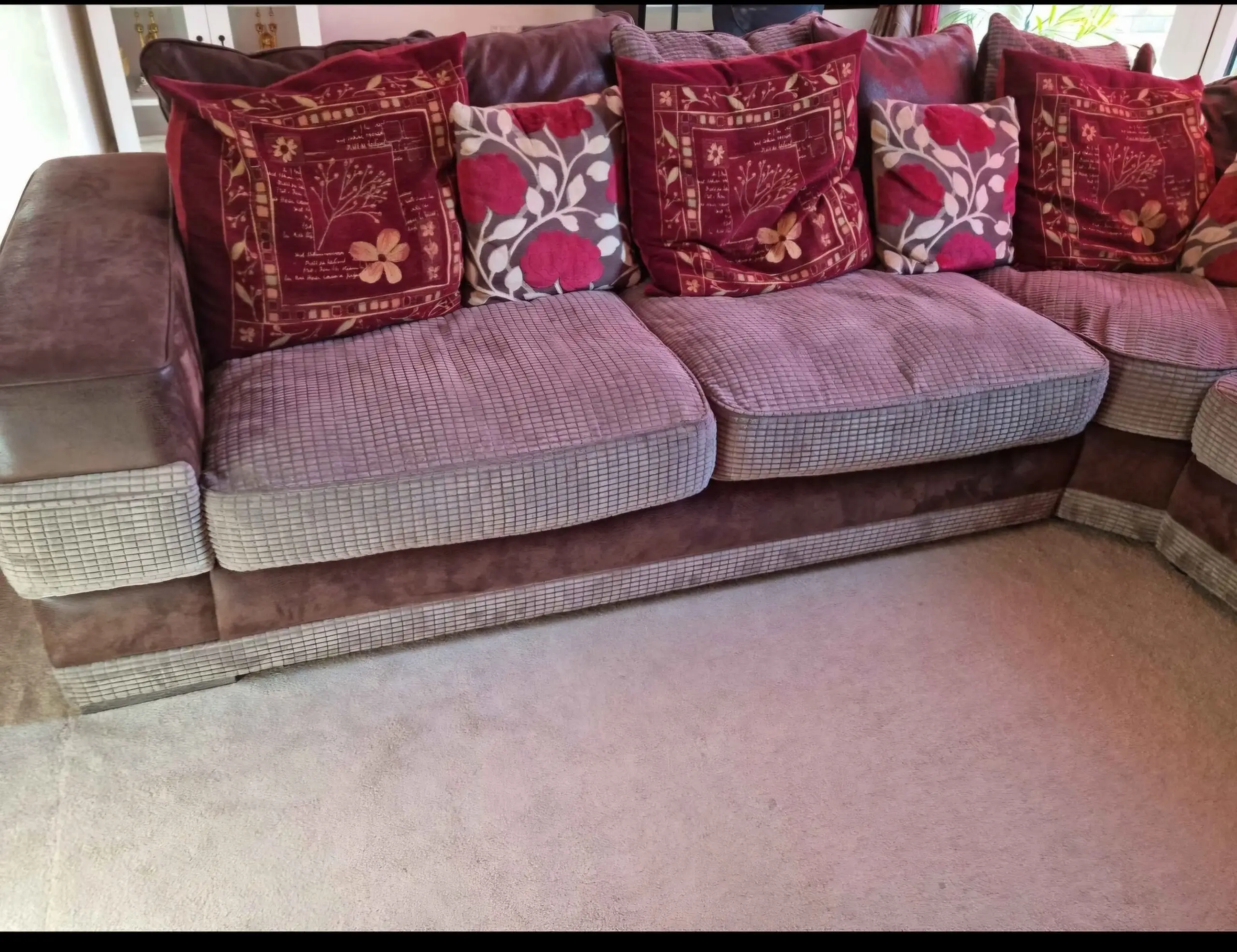 Corner piece sofa. Total of 3 pieces. Used for a few years, slight stain marks. No tear at all. Great condition.