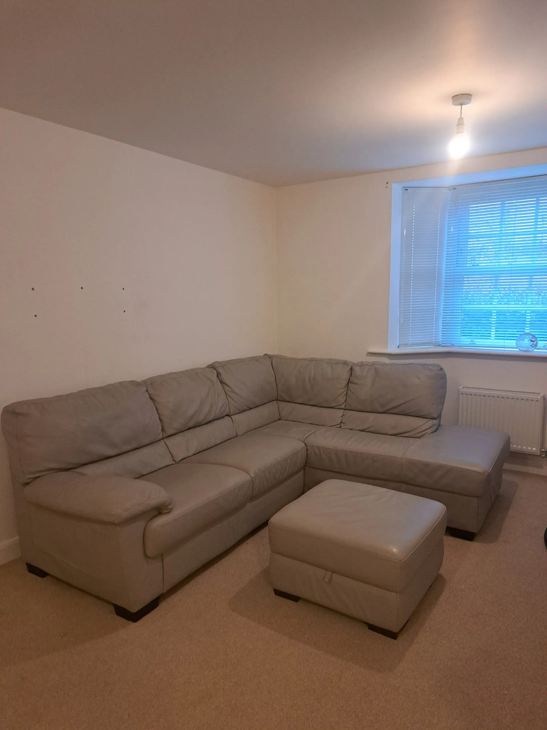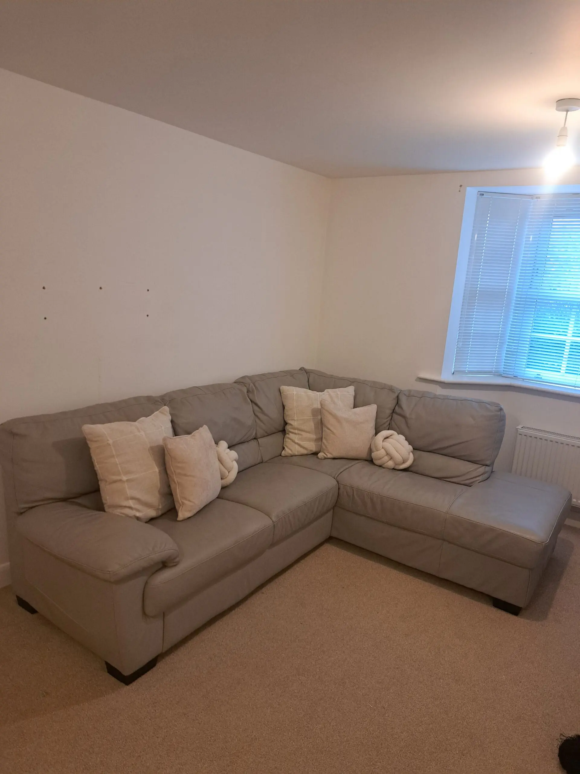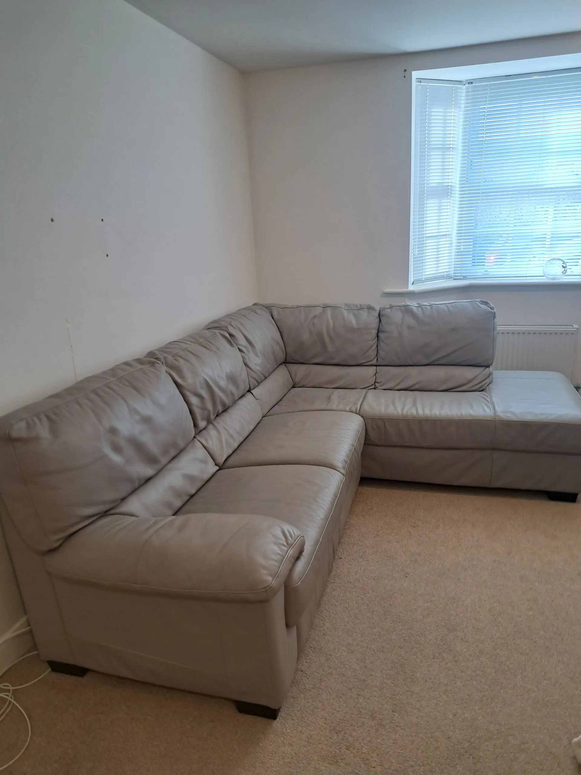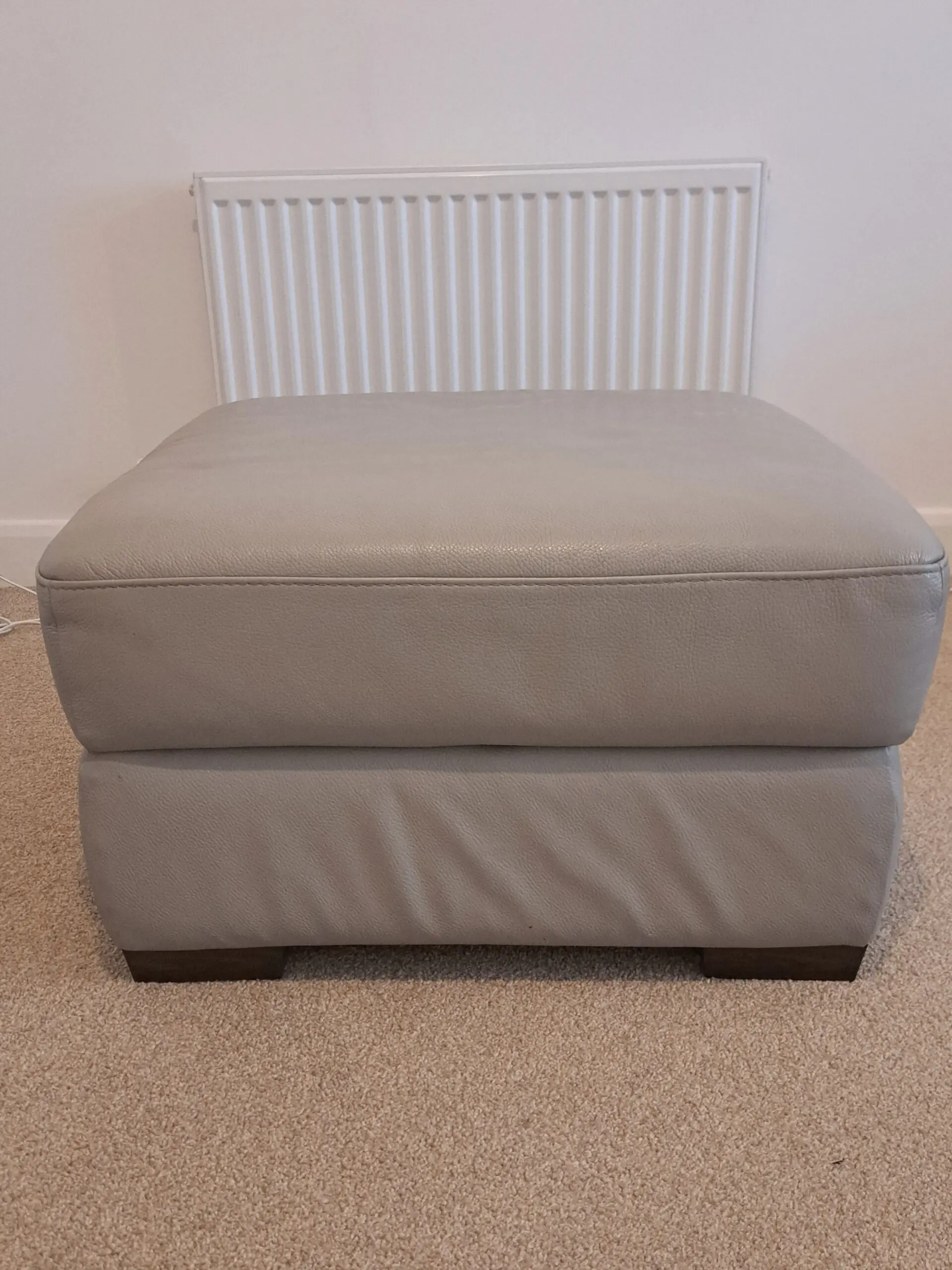 Spacious and super comfy grey leather corner sofa with chaise end — ideal for families or anyone who loves to stretch out and relax! Genuine Furniture Village quality, supportive cushions and a timeless neutral colour that fits any decor. Comes with matching footstool that provides storage.